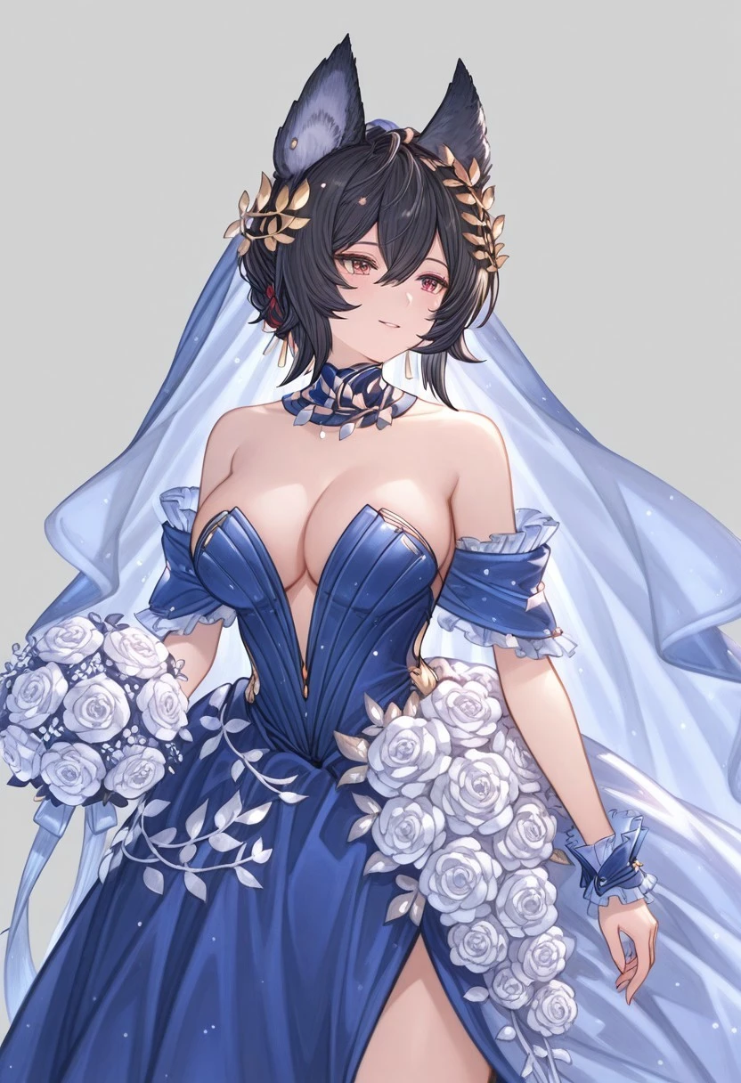 Add ''brdgbil, wedding outfit, bouquet, veil, strapless, elegant collar, hair accessory,'' for her bride appearance.