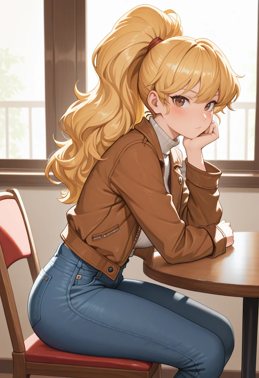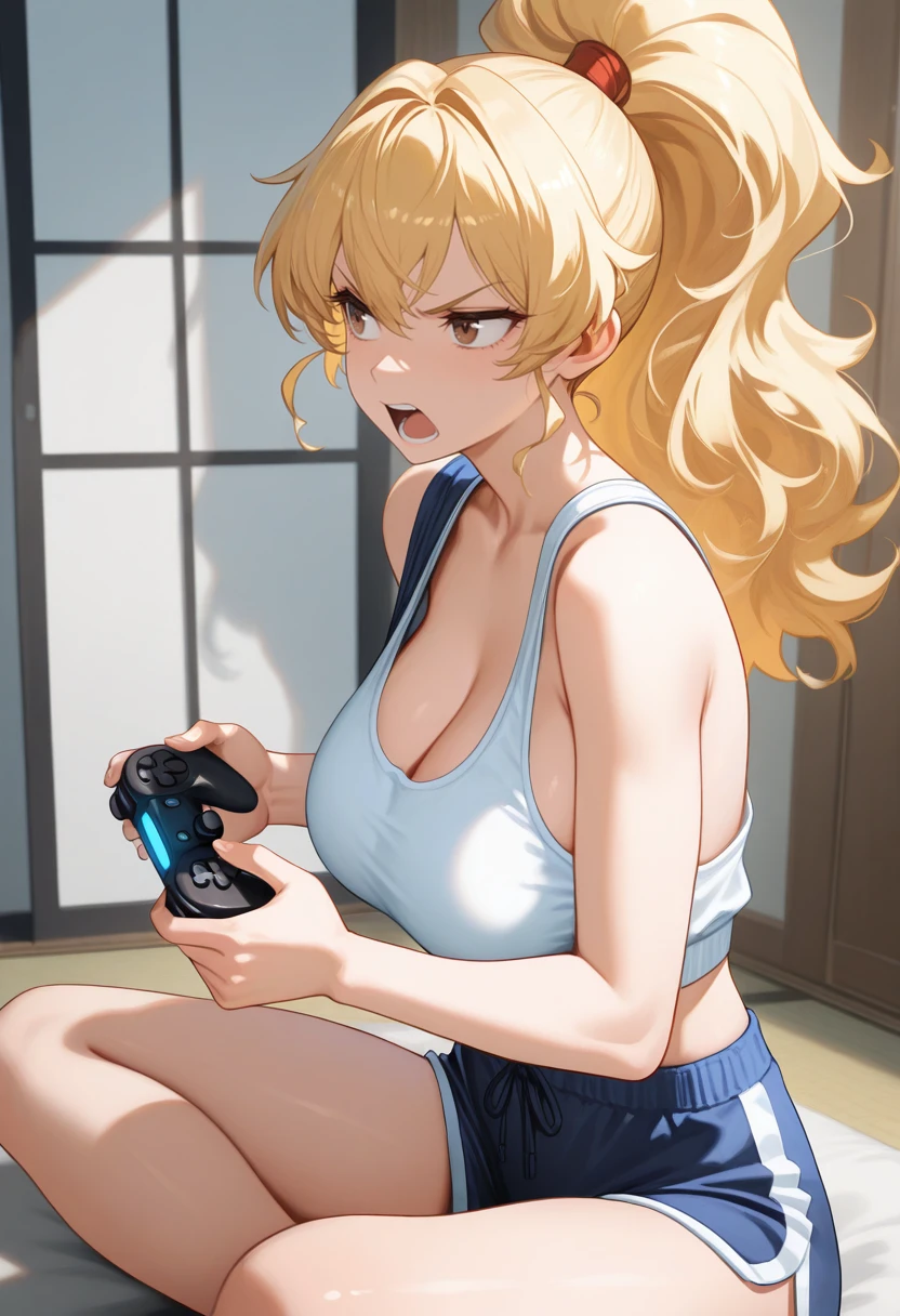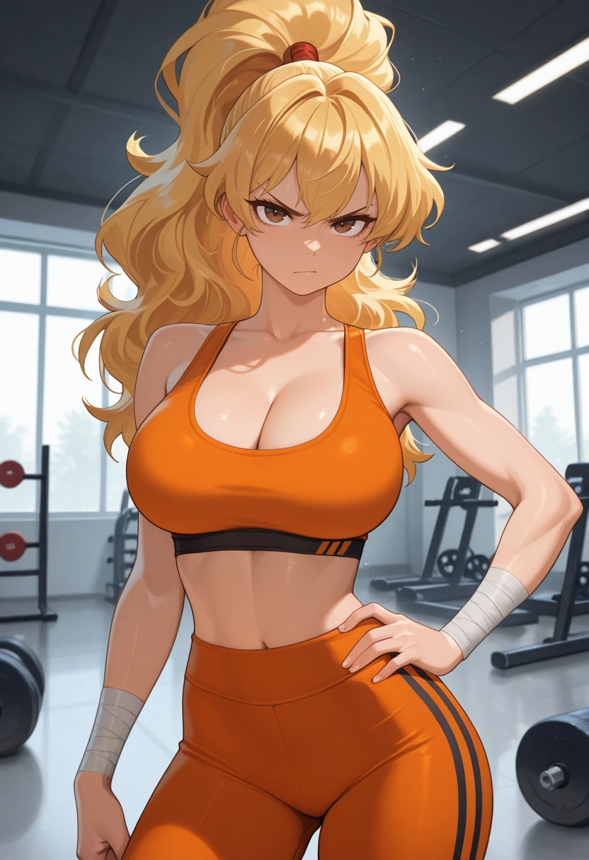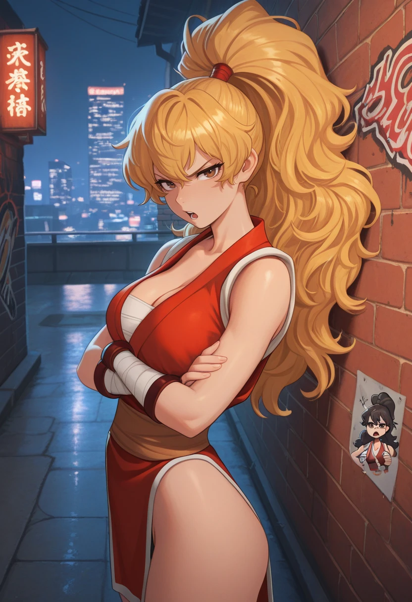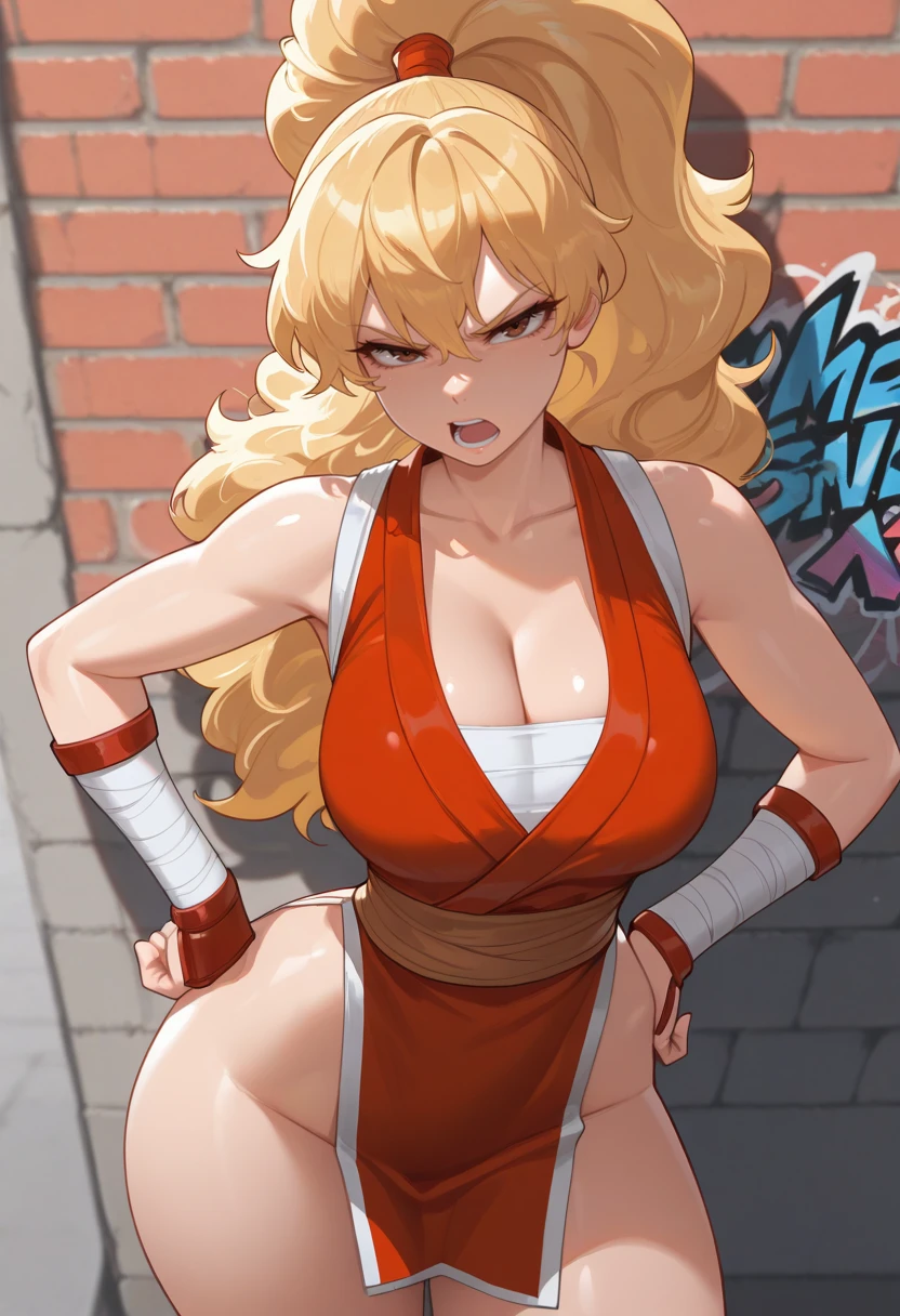 "MKIALPH, blonde hair, ponytail, long hair, fluffy hair, brown eyes, japanese clothes, pelvic curtain, sash, cleavage, bandages "