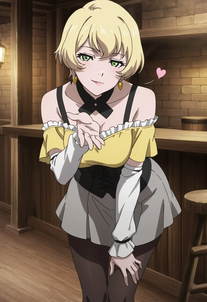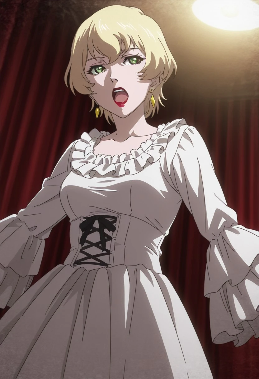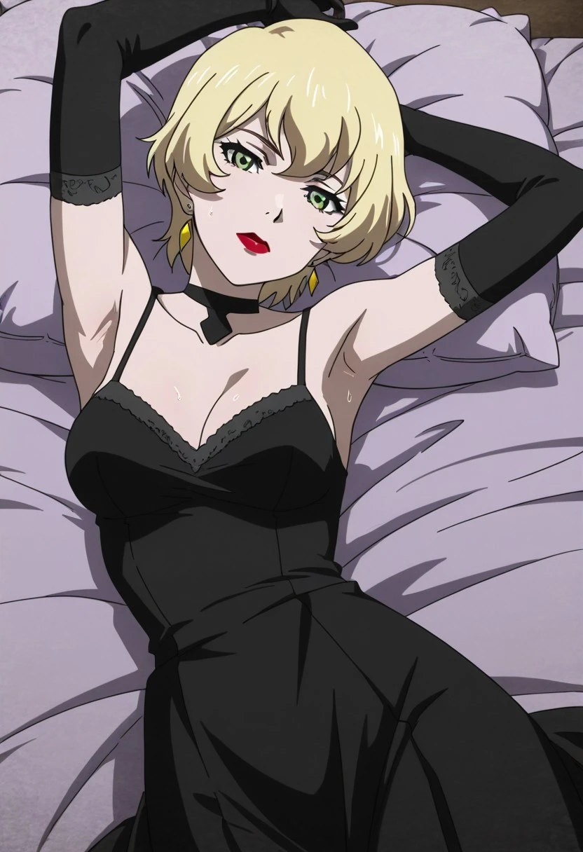1 girl, solo, ParneyPearmanta, green eyes, blonde hair, short hair, hair between eyes, red lipstick, earrings, dress, black dress, black elbow gloves, black choker, necklance