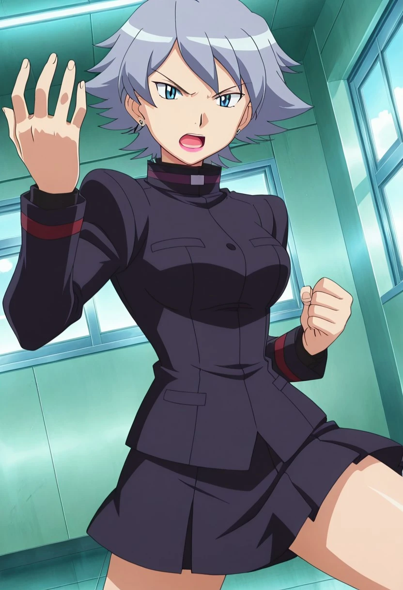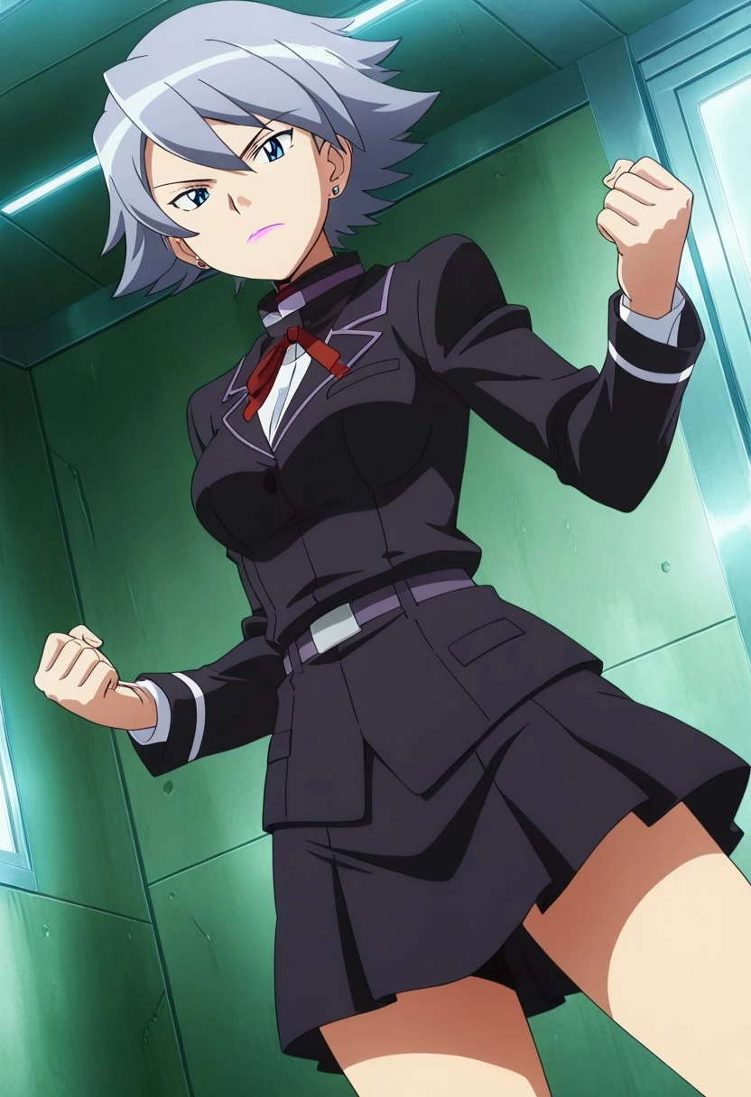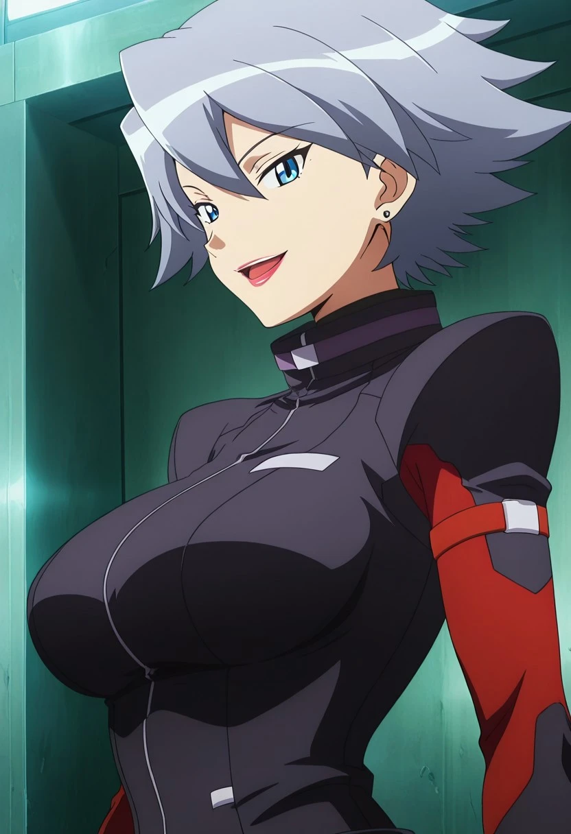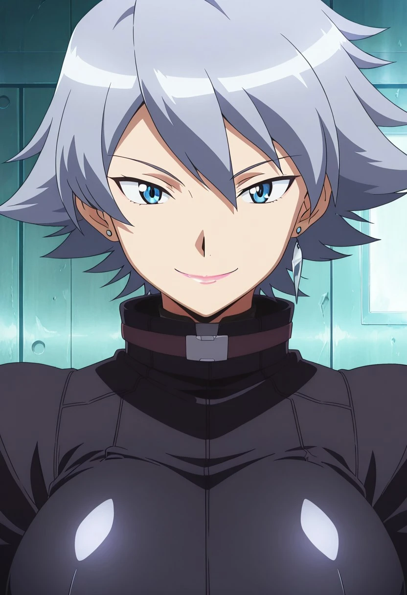Hunter J,grey hair,blue eyes,lipstick,earrings,bodysuit,