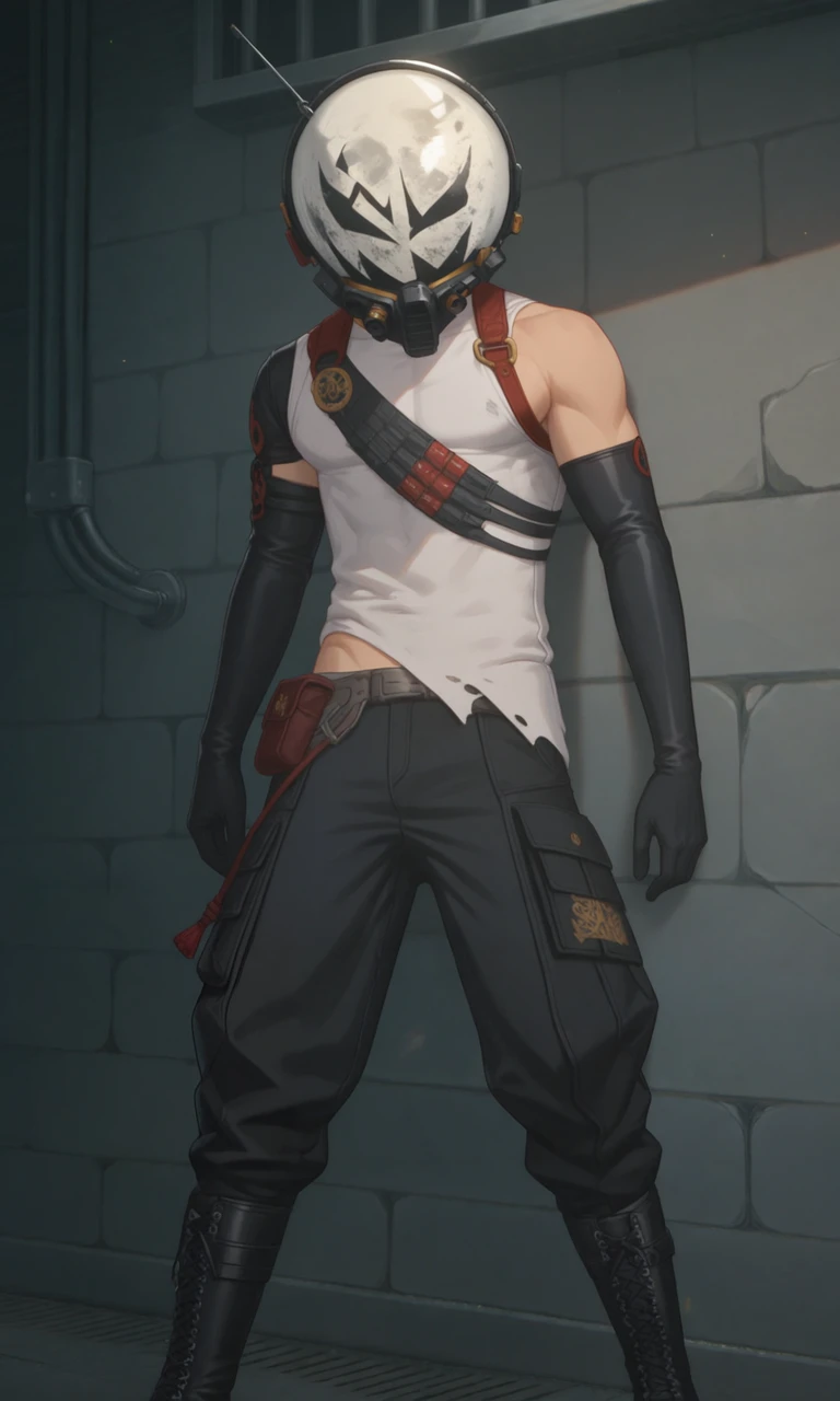 ((1boy)), male focus, MountainLions, white helmet, slim, black pants, elbow gloves, black gloves, sleeveless, bare shoulders, belt, black boots, white shirt