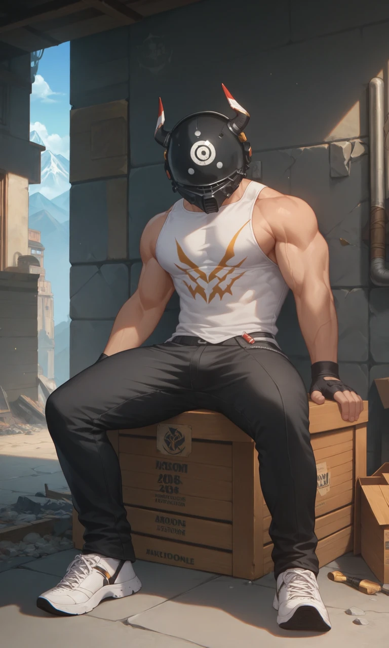 ((1boy)), male focus, MountainLions, black helmet, muscular, black pants, fingerless gloves, sneakers, white sleeveless shirt