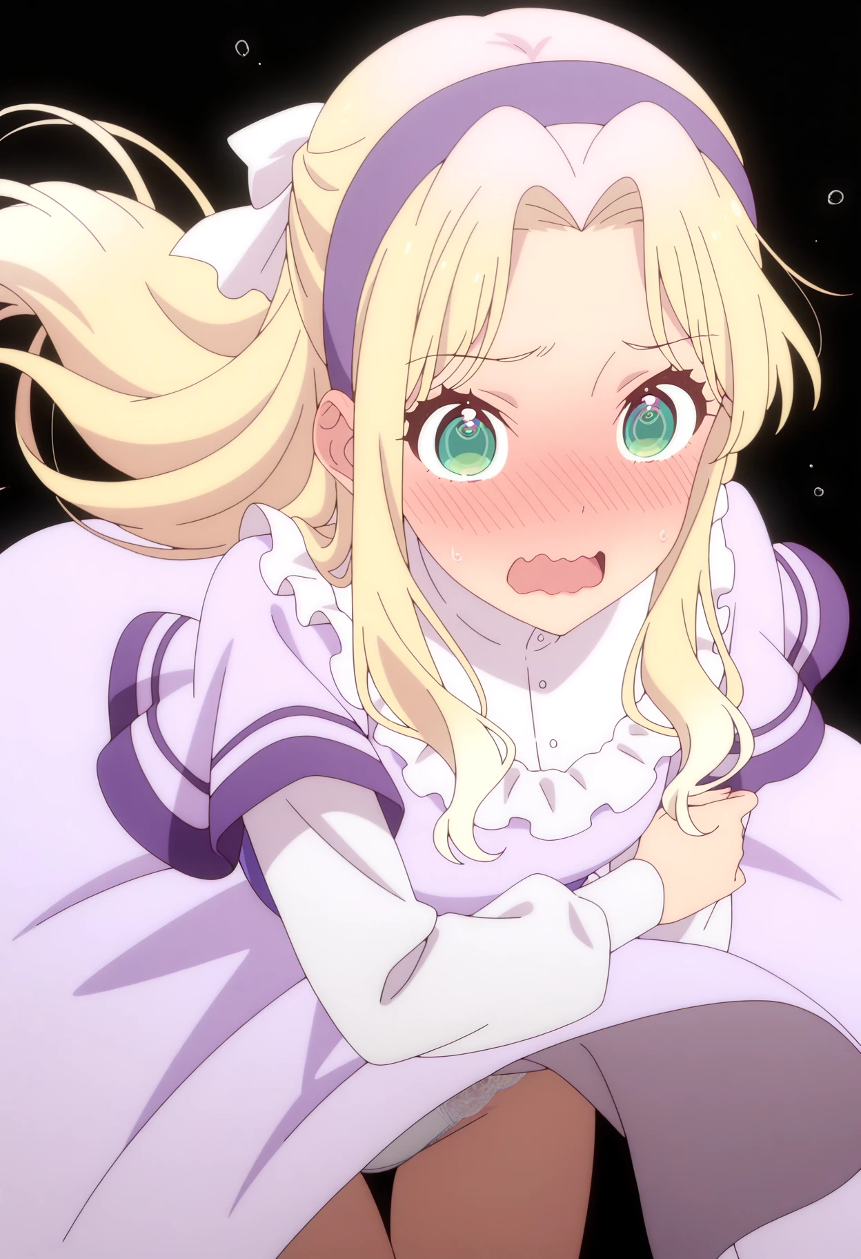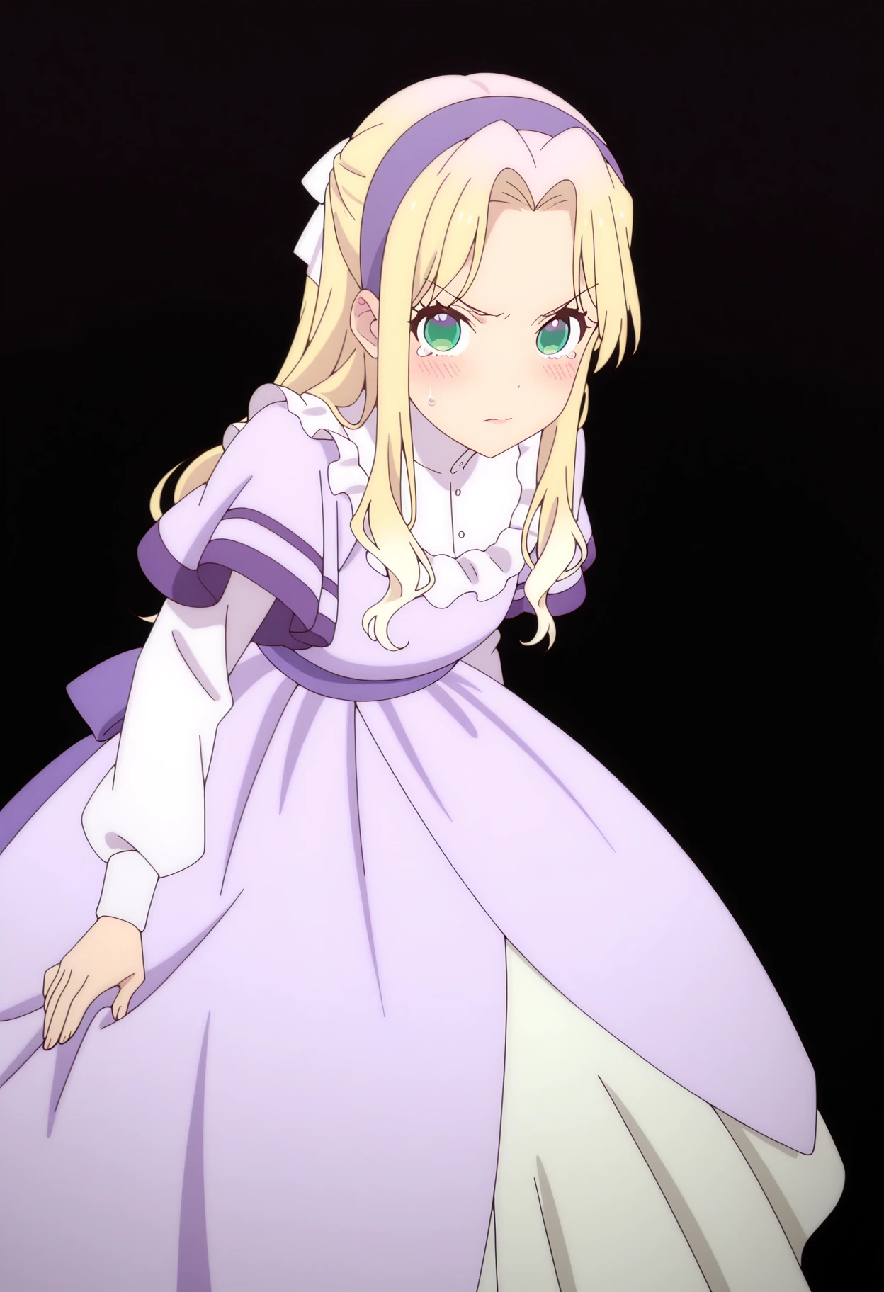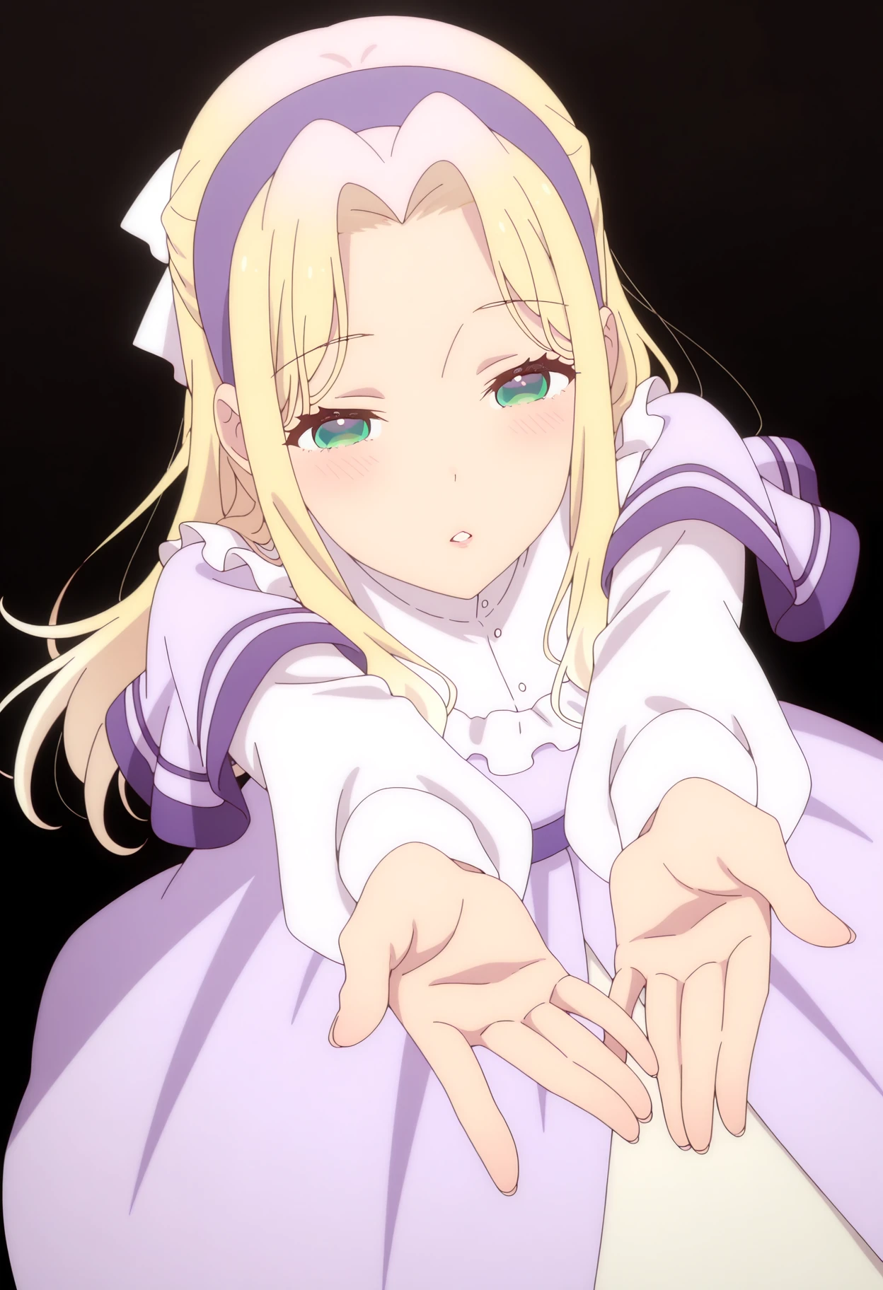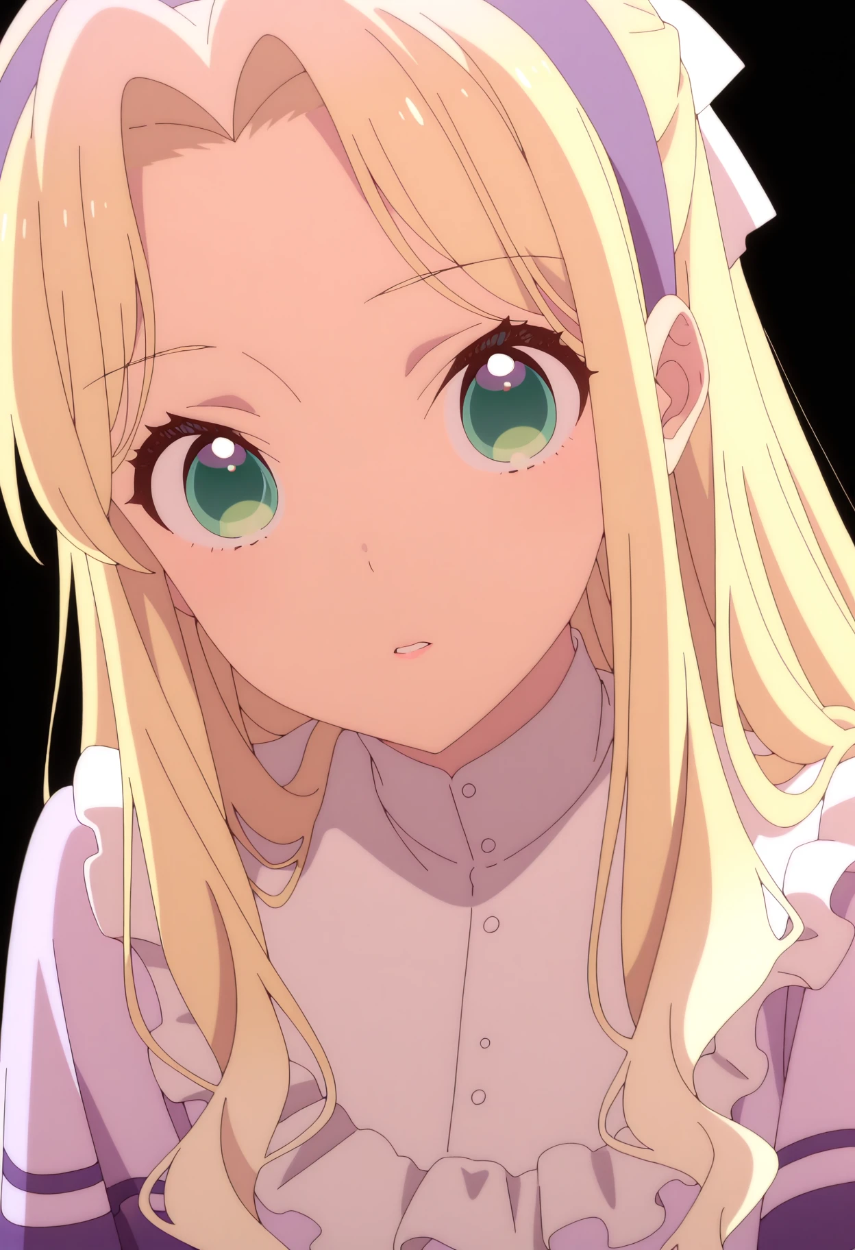 1girl, solo, bridget paige, blonde hair, long hair, hairband, green eyes, purple hairband, bangs, hair bow, parted bangs, ribbon, hair ribbon, sidelocks