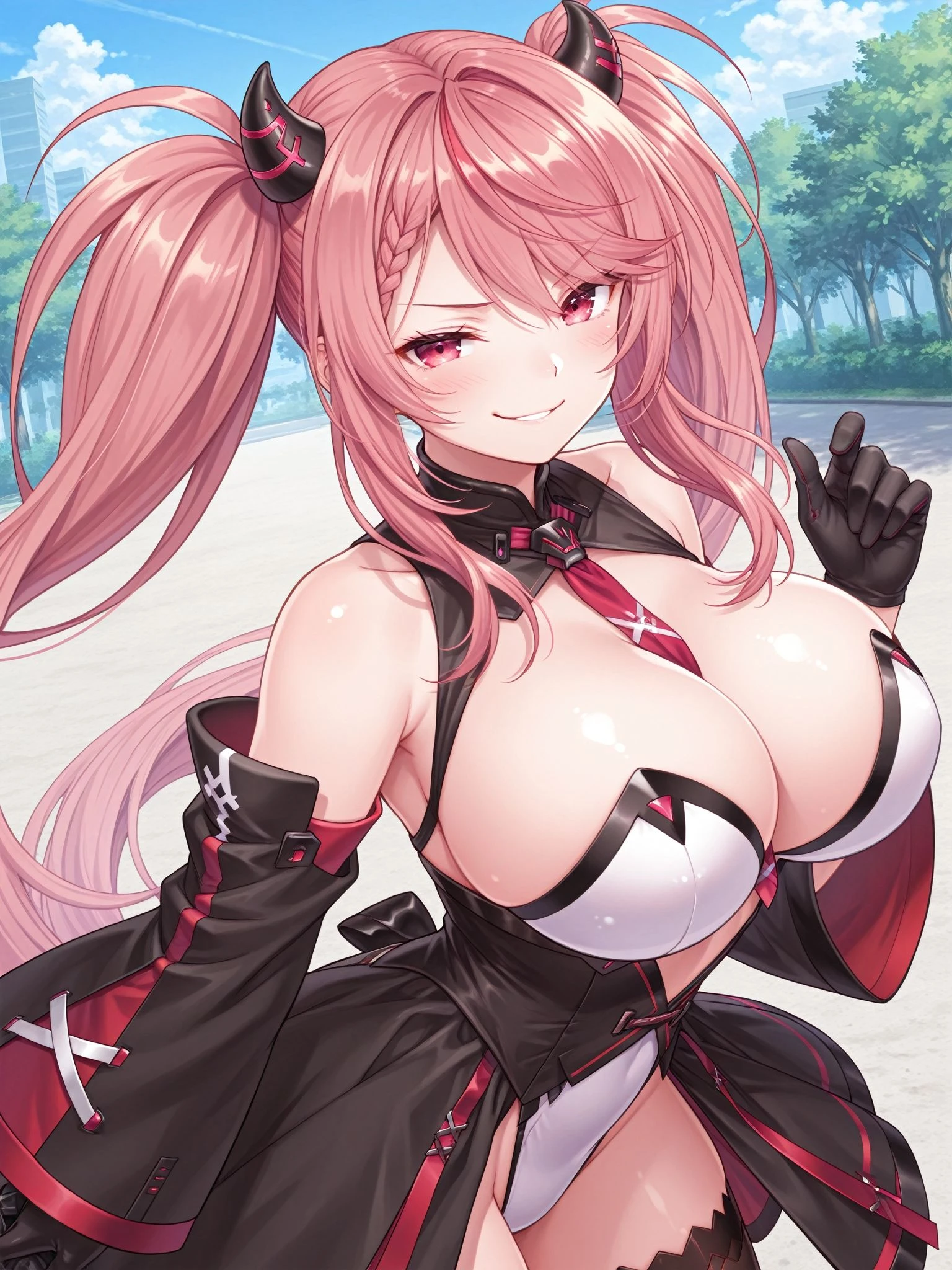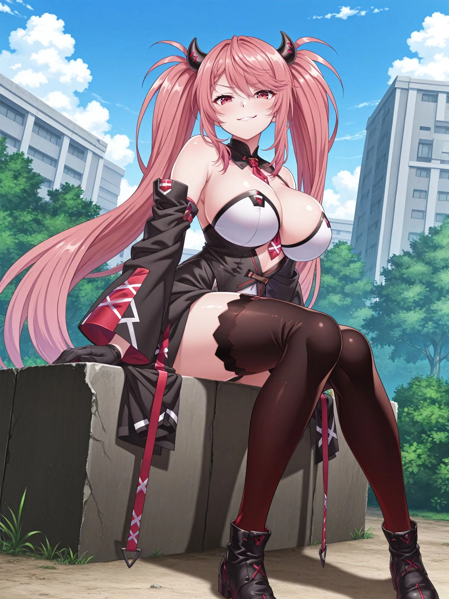 Lucia-Main,high-waist skirt,leotard,necktie,detached collar,thighhighs,cleavage,bare shoulders,horns,detached sleeves,black gloves,wide sleeves,black footwear,between breasts,
