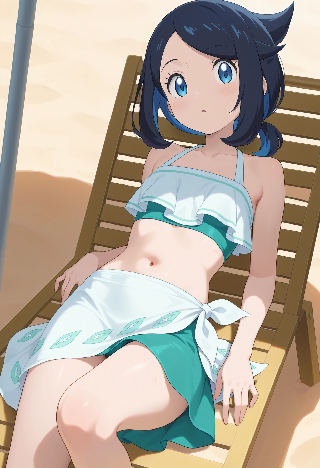 aaliko, short hair, black hair, colored inner hair, short ponytail, blue eyes, collarbone, swimsuit, white bikini, sarong, bikini skirt