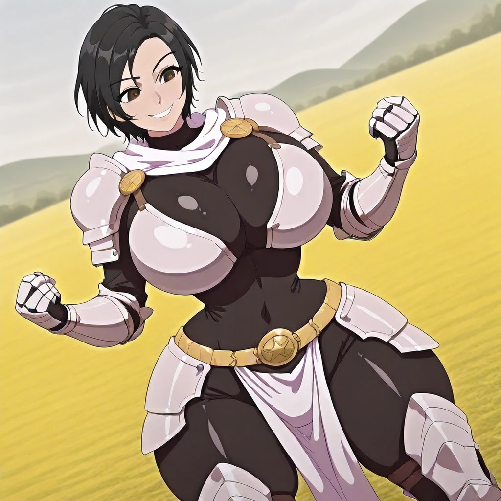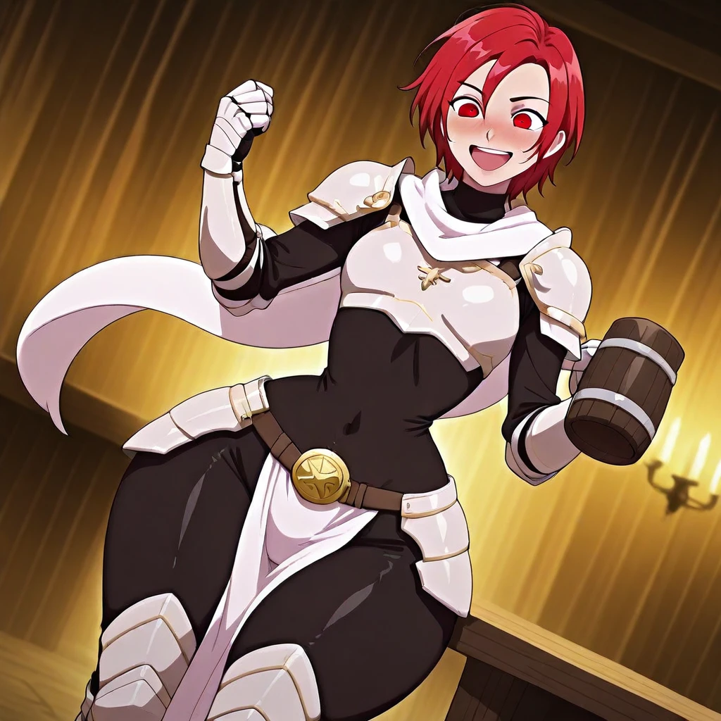 Paladin armor, heavy armor, (color) armor, gauntlets, pauldrons, shoulder armor, hip armor, (color) crotch curtain, (color) , turtleneck, (color) scarf, (color) medallion belt buckle,