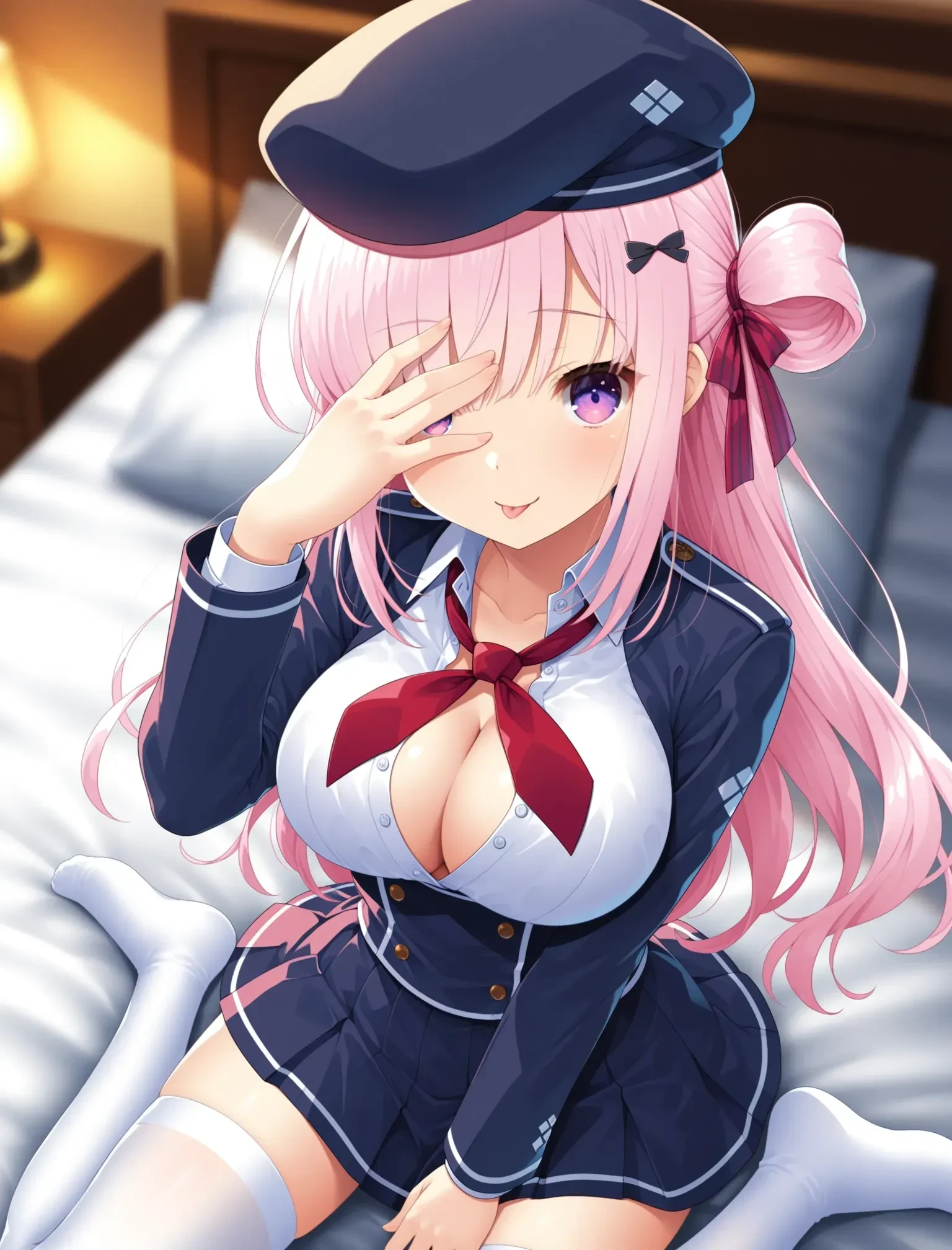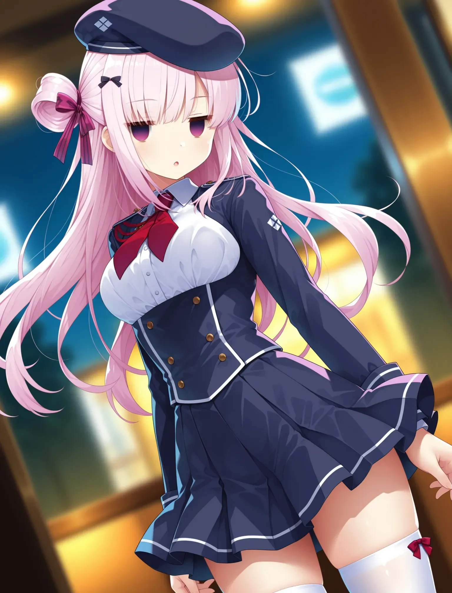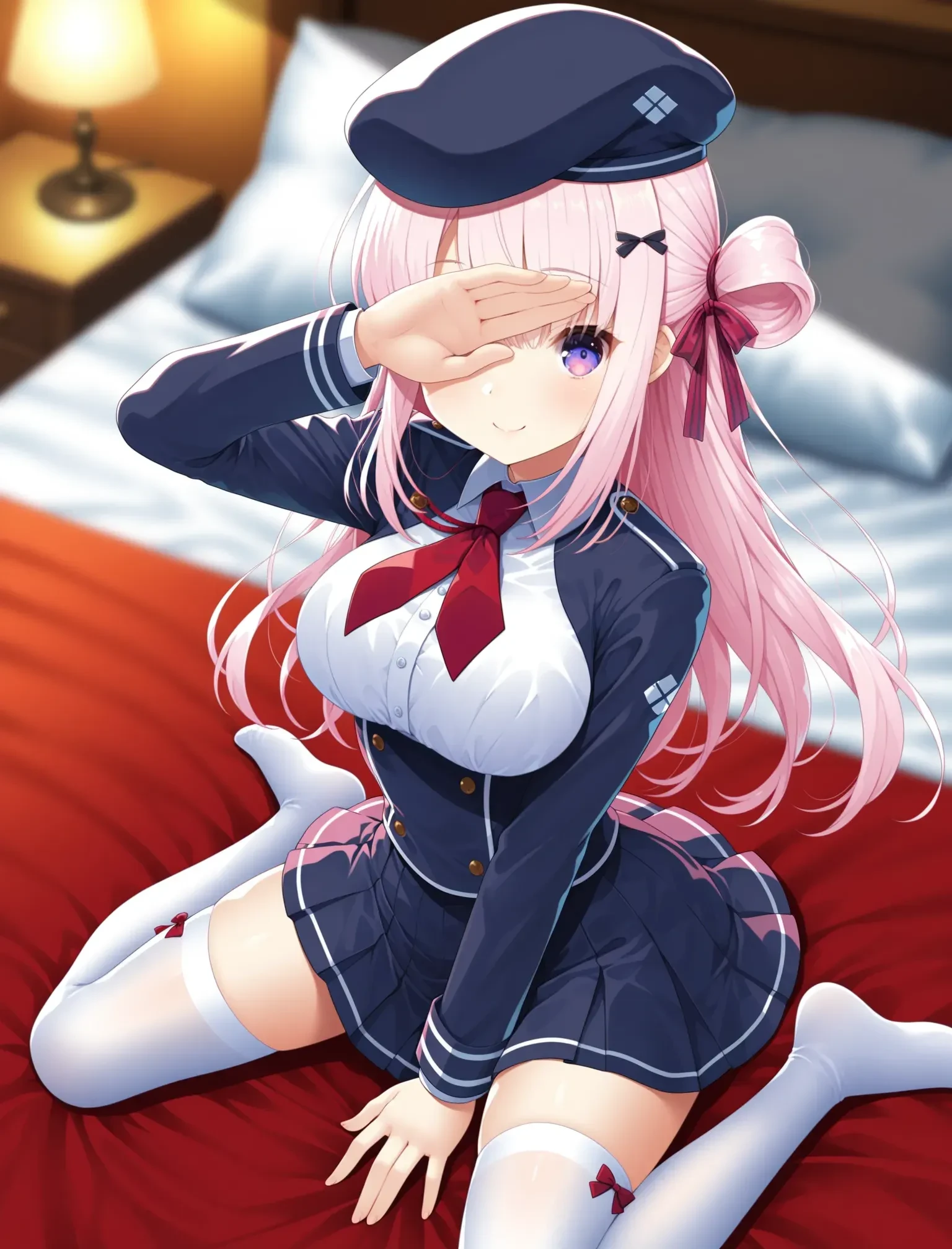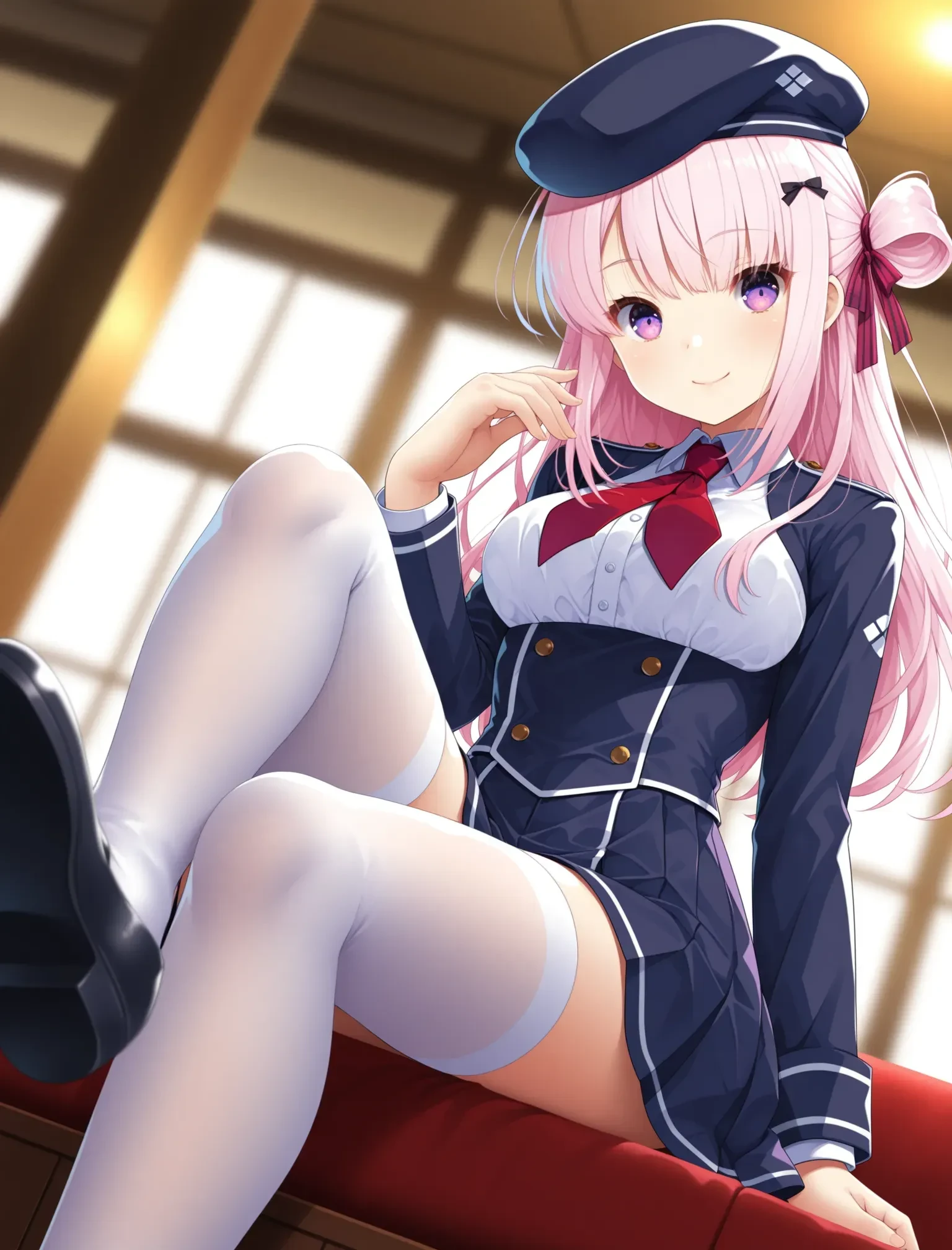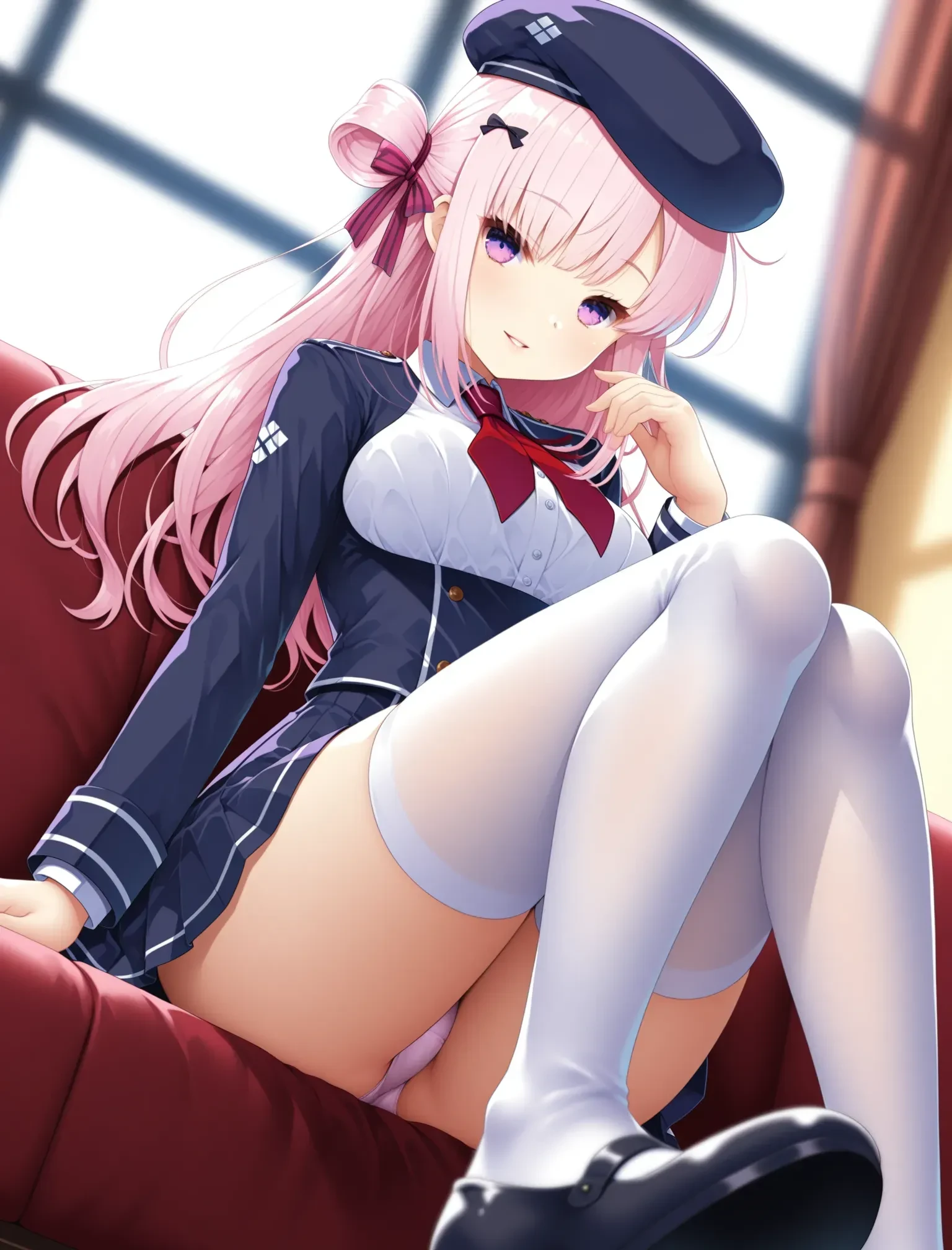 keisetsu,miniskirt,white thighhighs,hair ornament,ribbon,hair ribbon,jacket,beret,shirt,neckerchief,double-breasted