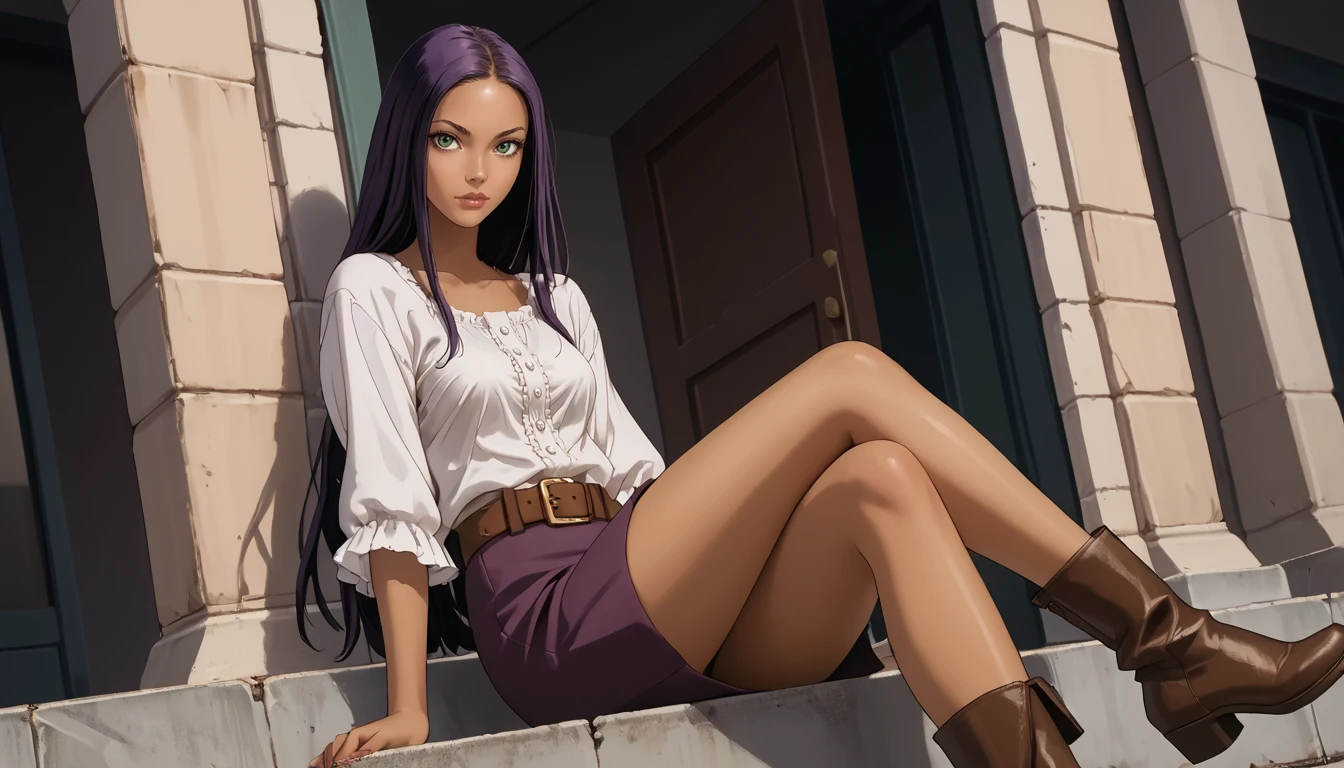 【Casual Outfit Prompt】: Loose Blouse, Brown Belt, Skirt, Brown Boots, Bracelets, Necklace