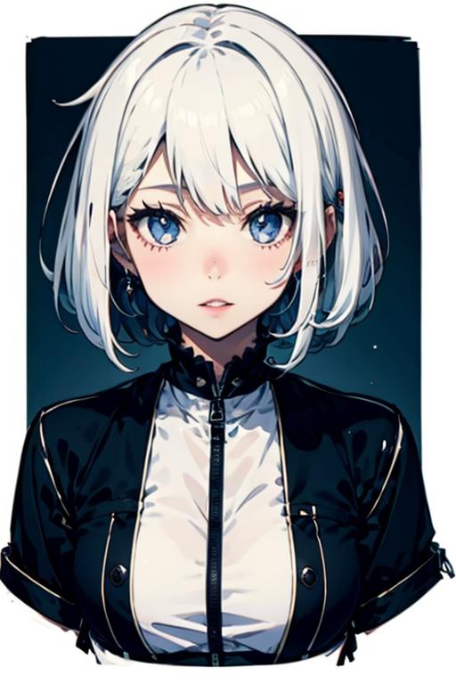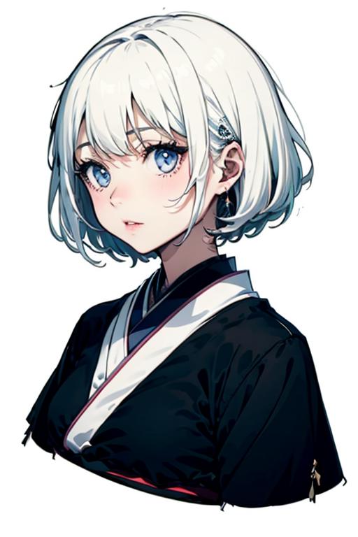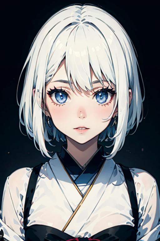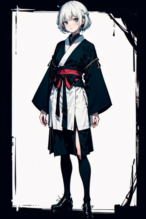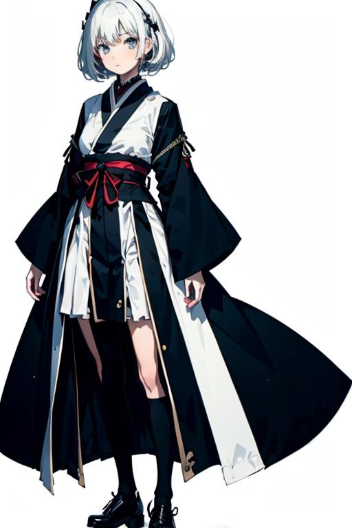 white hair, hime_cut, Black and white Japanese witch clothing