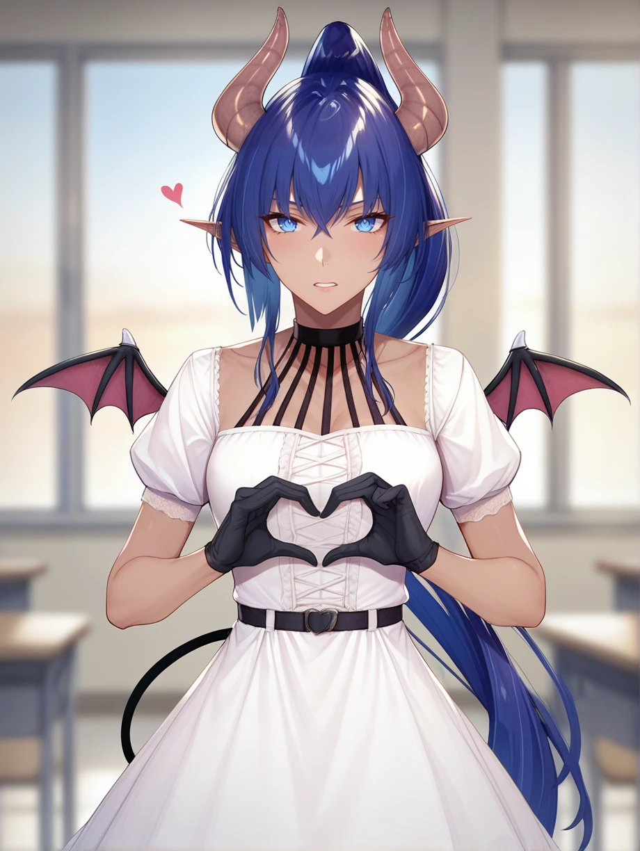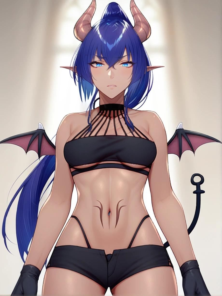 Appearance: blue hair, long hair, dark-skinned female, ponytail, pointy ears, blue eyes, demon horns, succubus tail, tail, small wings, tattoo on stomach