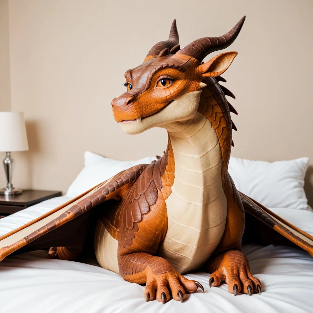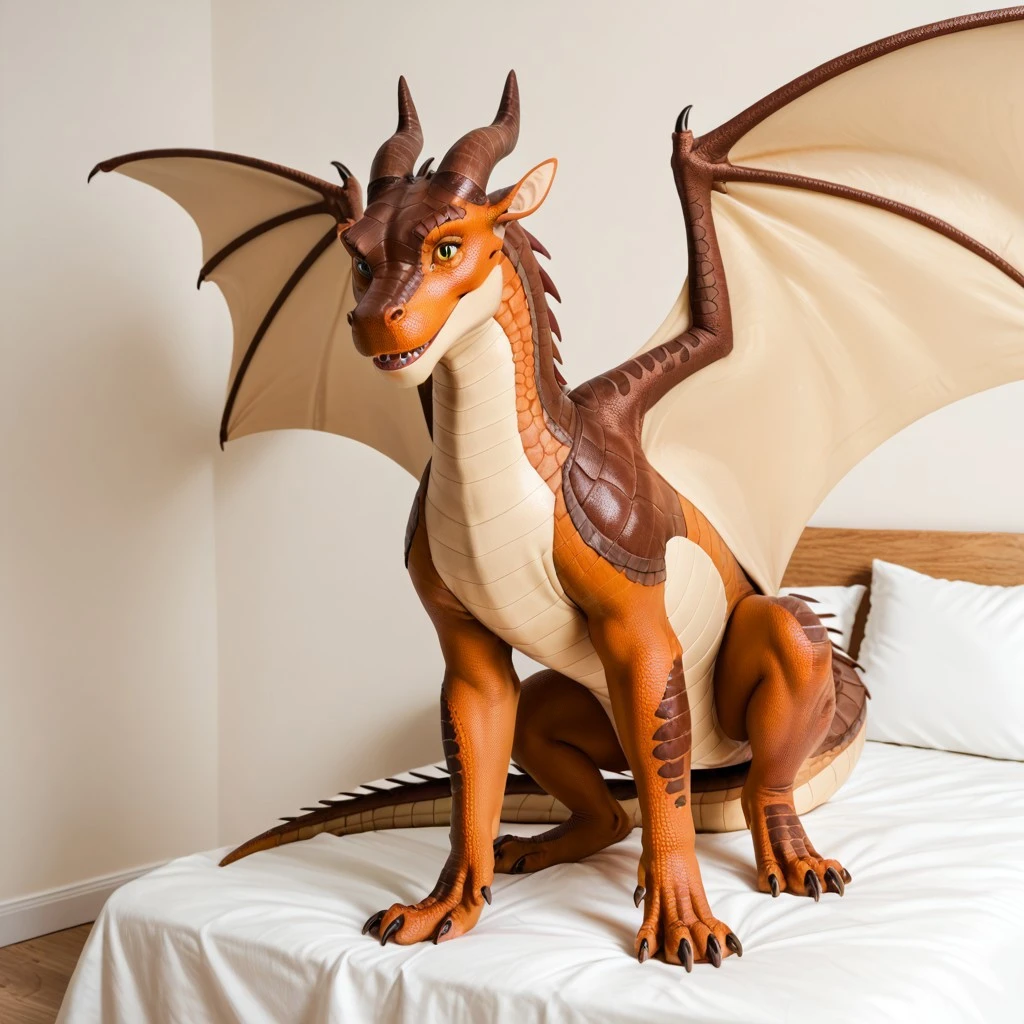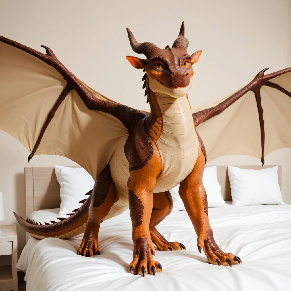 Additional Prompt: brown scales, squarish face, darker colored snout, tan underbelly, dragon, horns, claws, wings, tail