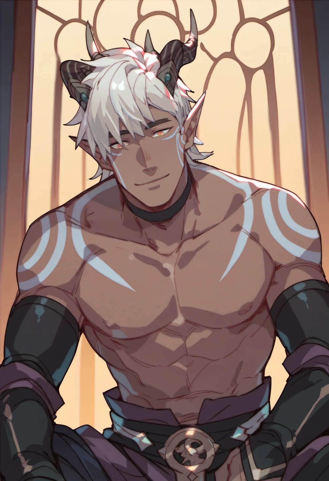 ethari_tdp, white hair,horns, pointy ears, tattoo, dark-skinned male