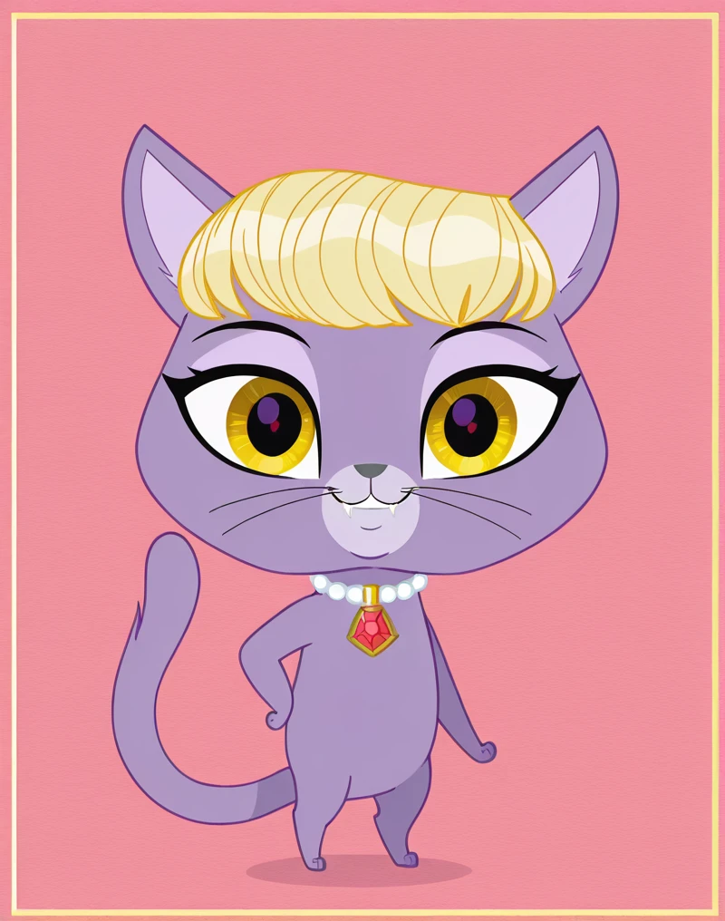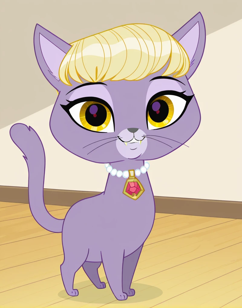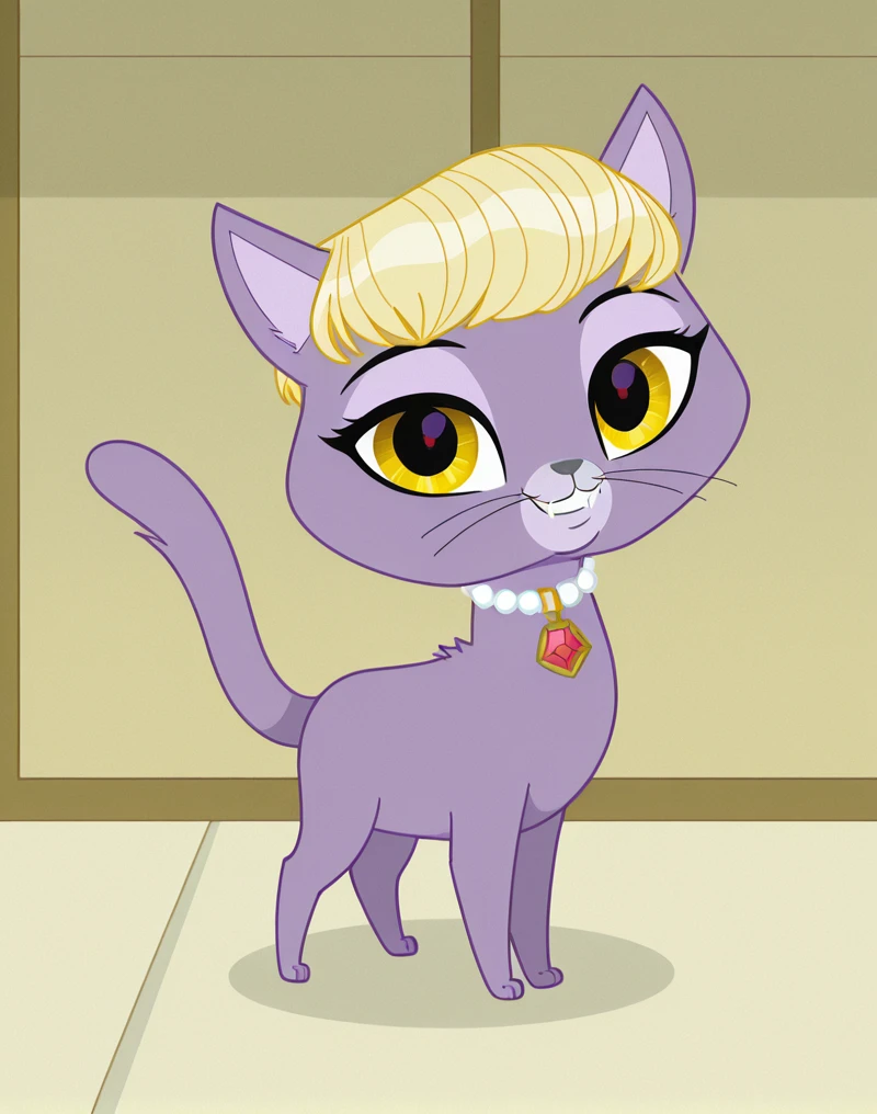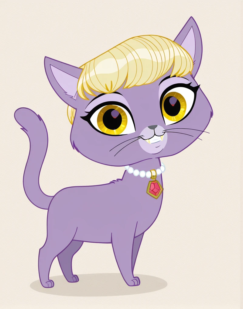 DelilahLPS, cat, furry female, furry, 1girl, purple fur, yellow eyes, blonde hair, bangs, very short hair, fangs, cat whiskers, cat tail, cat ears, gray nose, collar, collar with red gem, semi-anthro