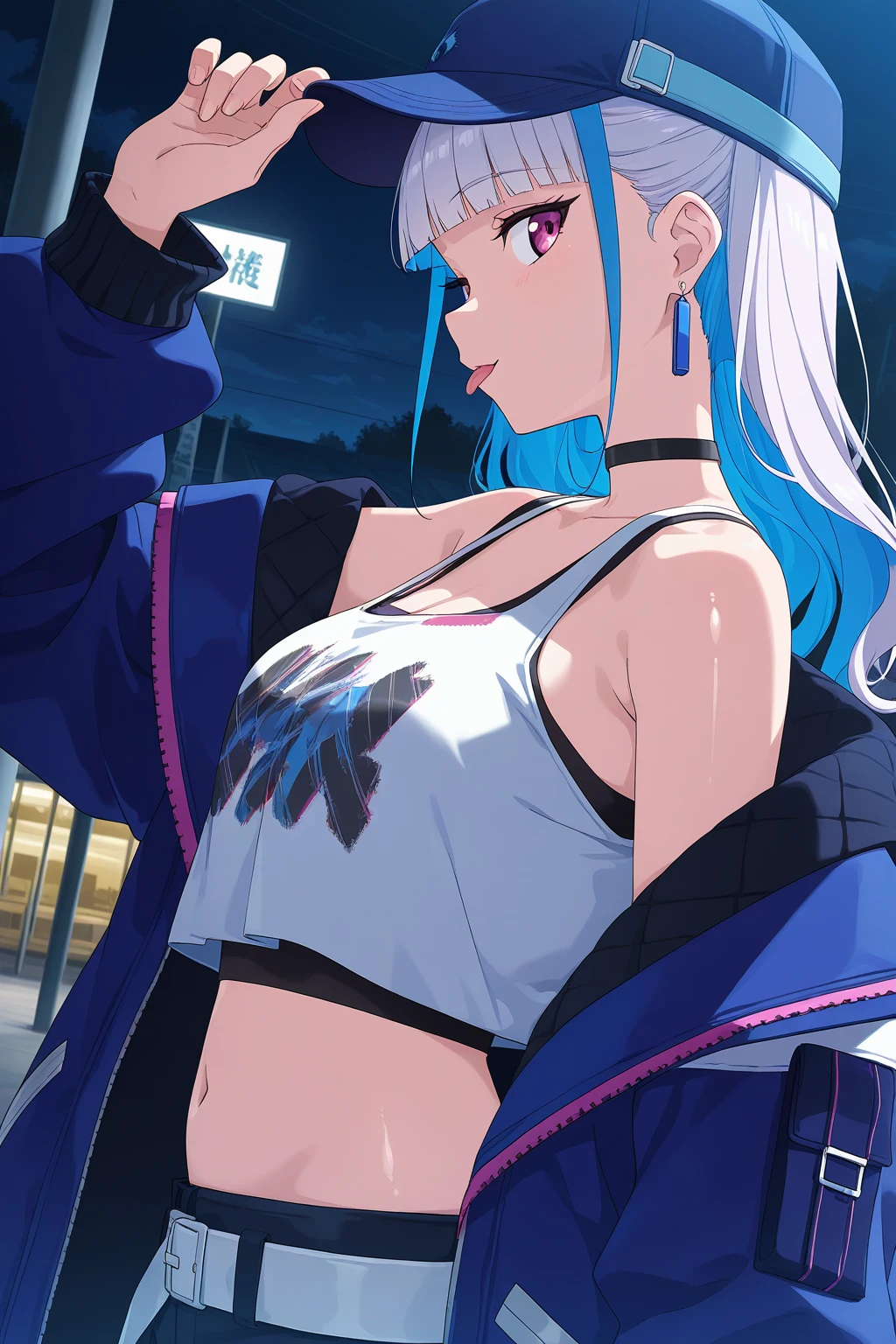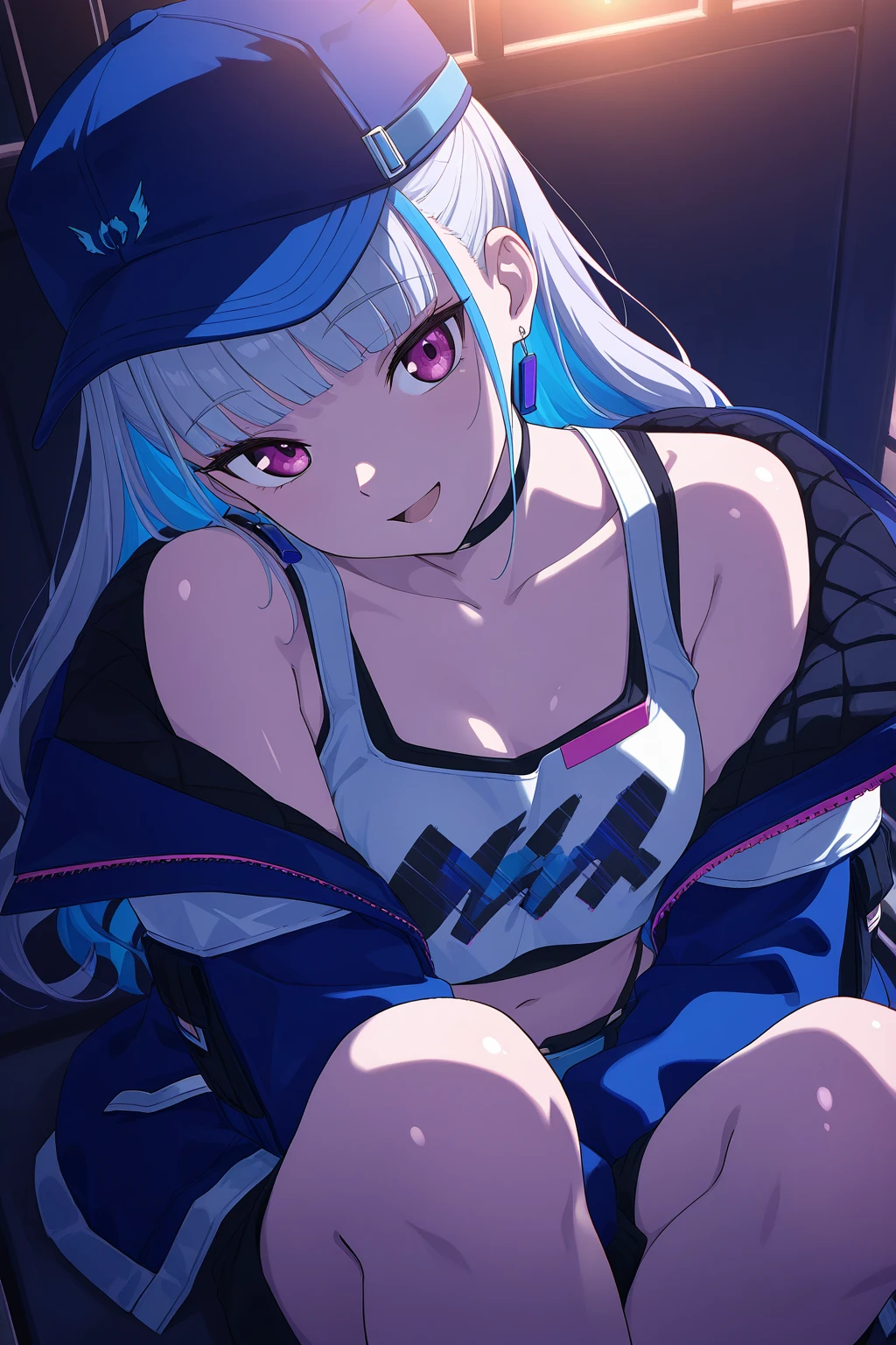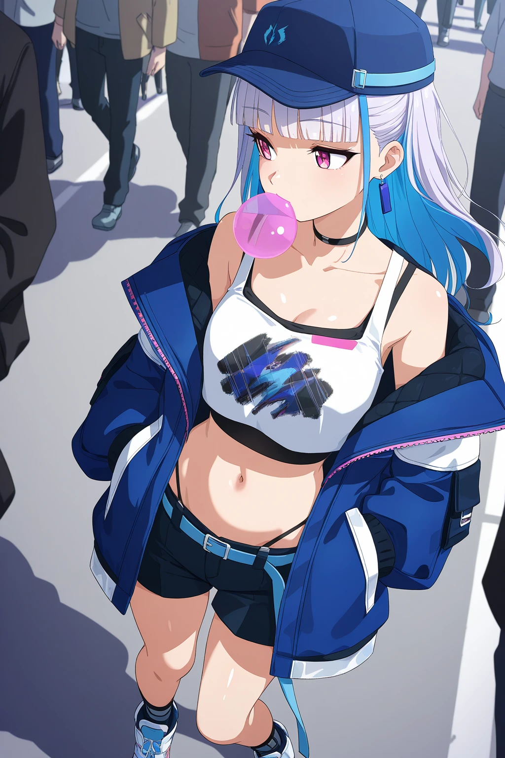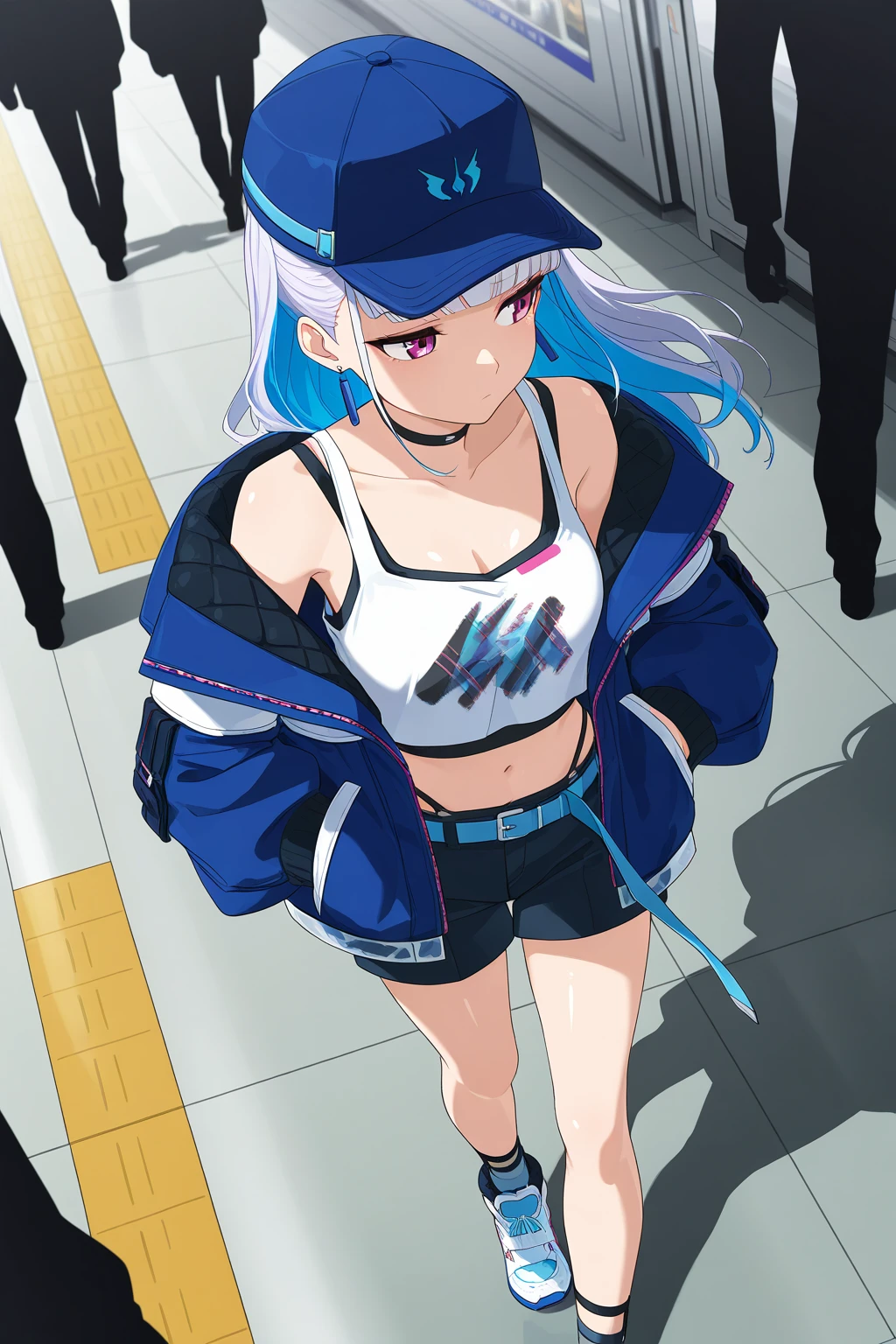LHNJ, long hair, grey hair, blunt bangs, colored inner hair, blue hair, hair flaps, pink eyes, breasts, navel, baseball cap, print headwear, blue headwear, earrings, black choker, blue jacket, long sleeves, , white tank top, cleavage, sleeveless shirt, crop top, black shorts, highleg panties, blue belt, short shorts, grey socks, sneakers, white footwear