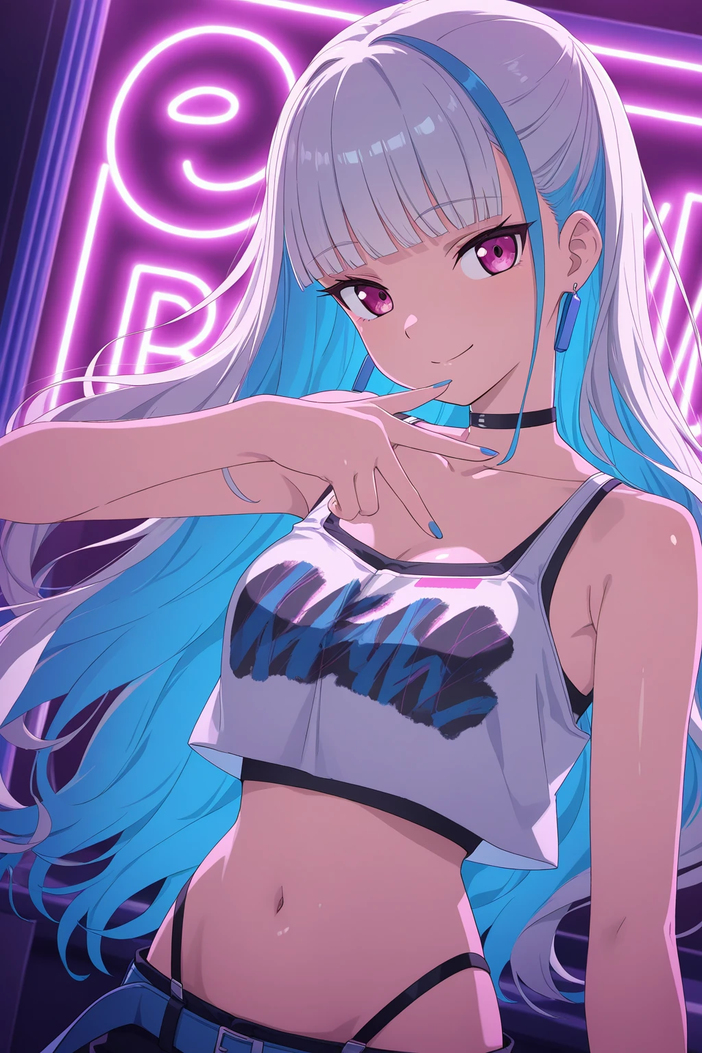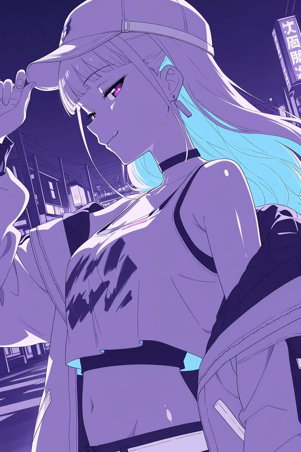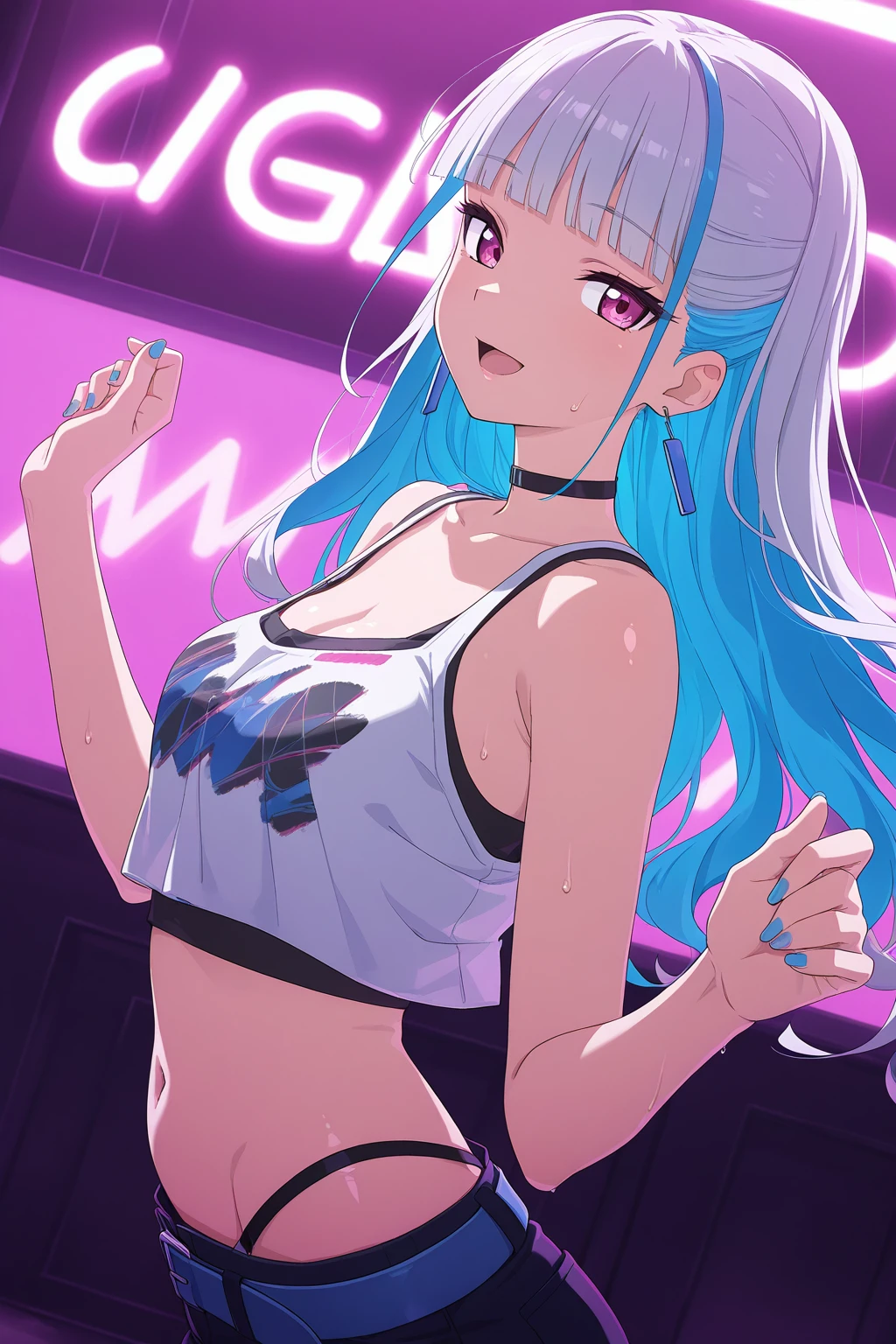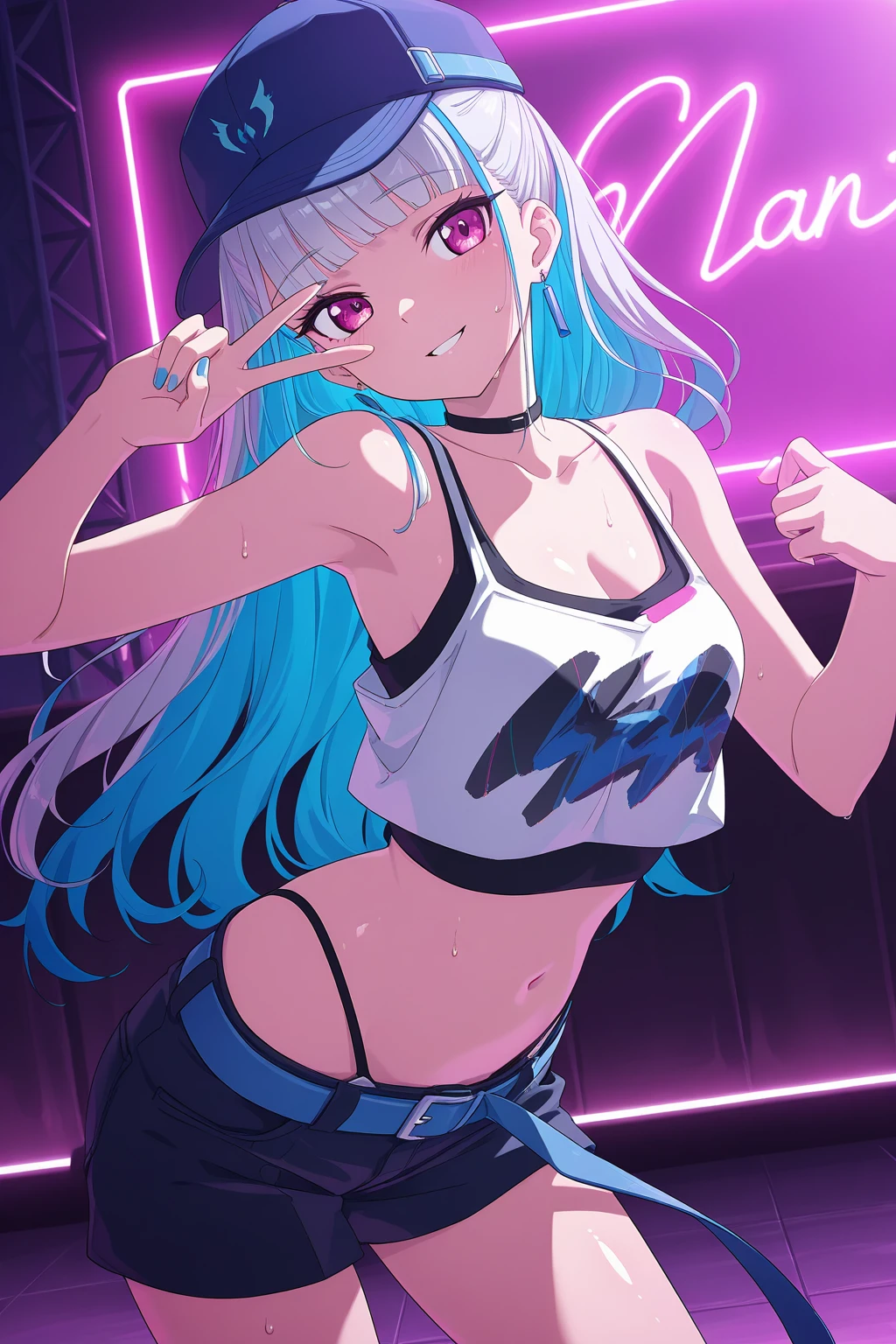LHNJ, long hair, grey hair, blunt bangs, colored inner hair, blue hair, hair flaps, pink eyes, breasts, navel, baseball cap, print headwear, blue headwear, earrings, black choker, blue jacket, long sleeves, , white tank top, cleavage, sleeveless shirt, crop top, black shorts, highleg panties, blue belt, short shorts, grey socks, sneakers, white footwear