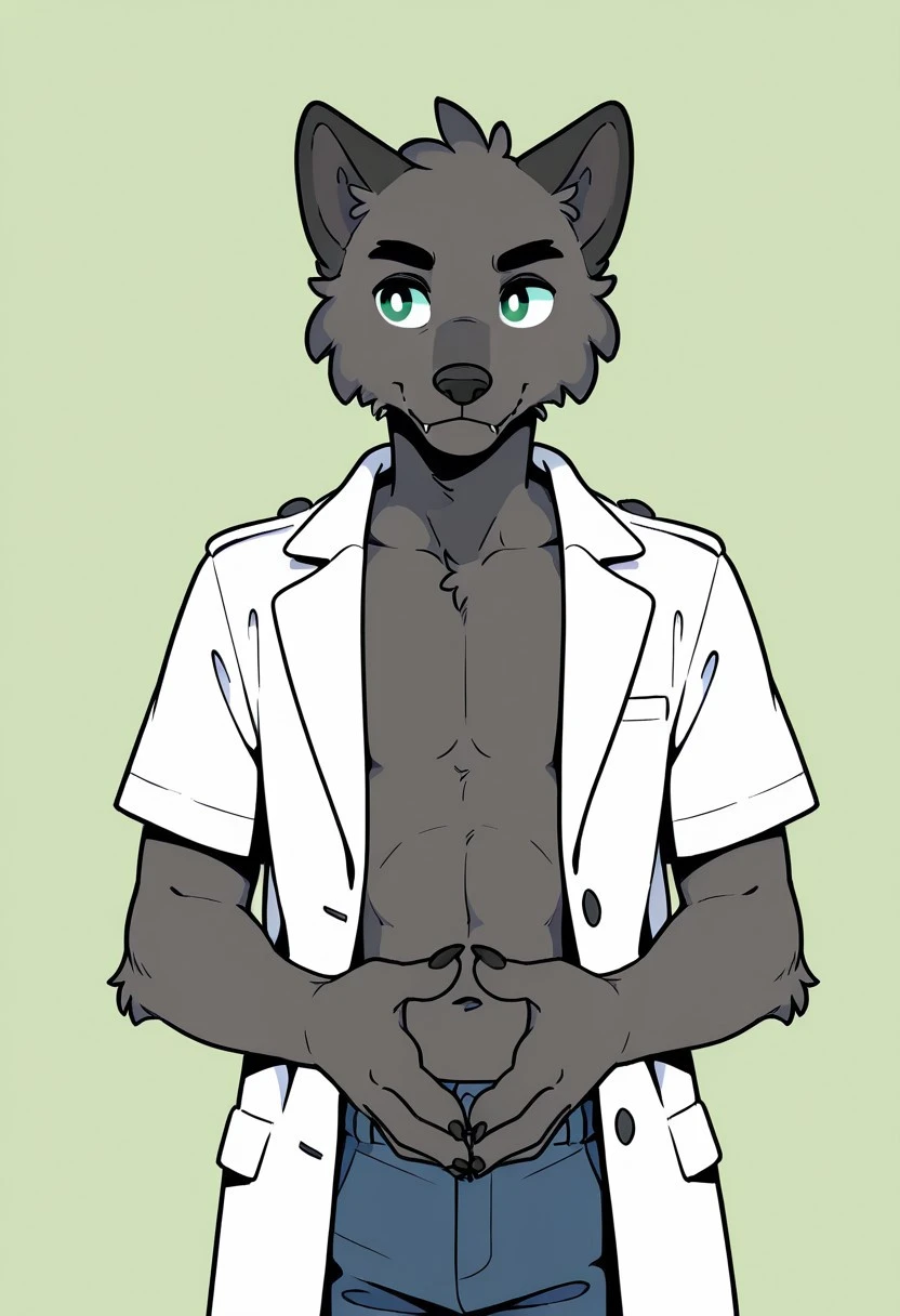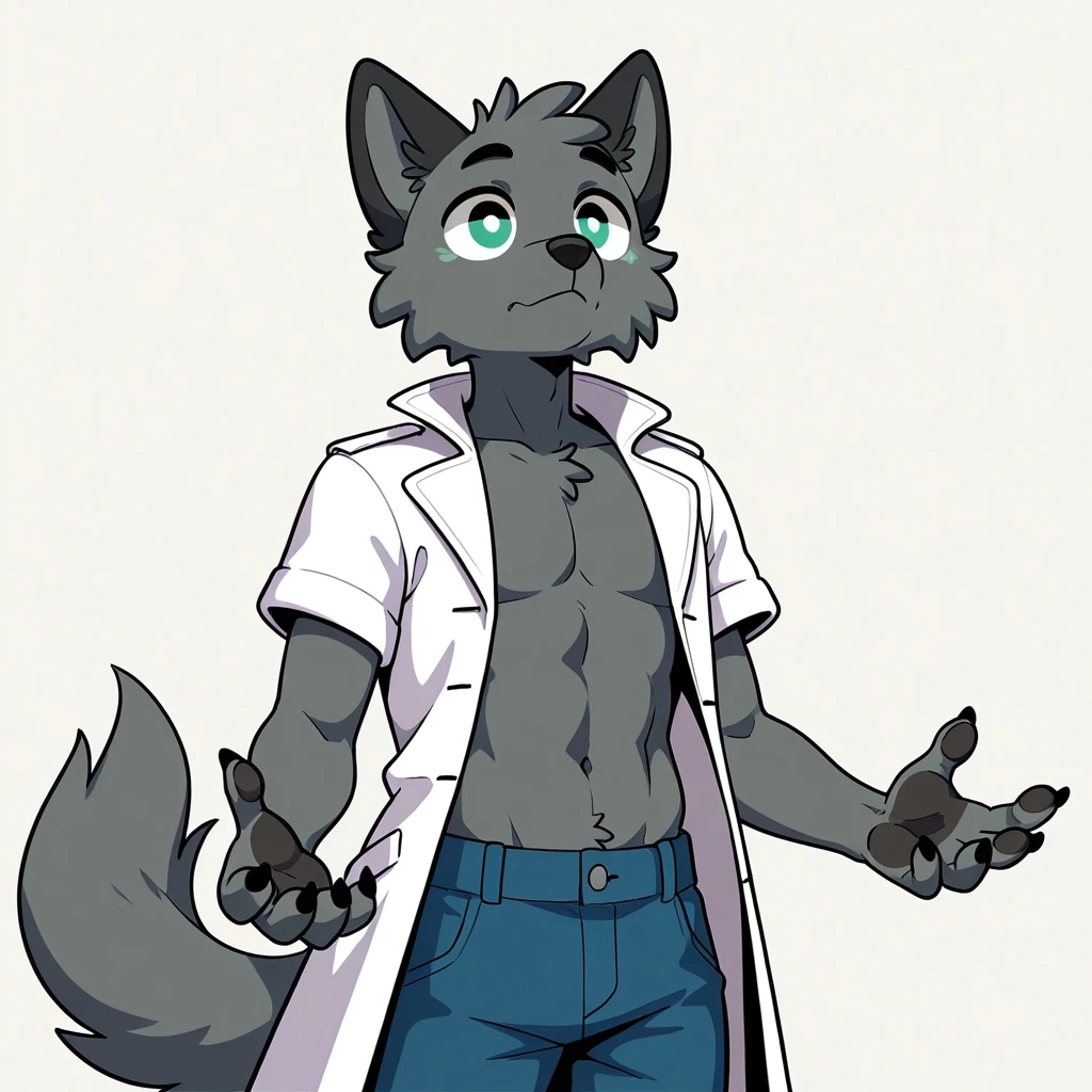 male, solo, anthro, wolf, gray fur, green Iris, White scleras, black ears, black eyebrows, cheek tufts, head tuft, short sleeves, blue pants,black claws, white coat jacket, shirtless