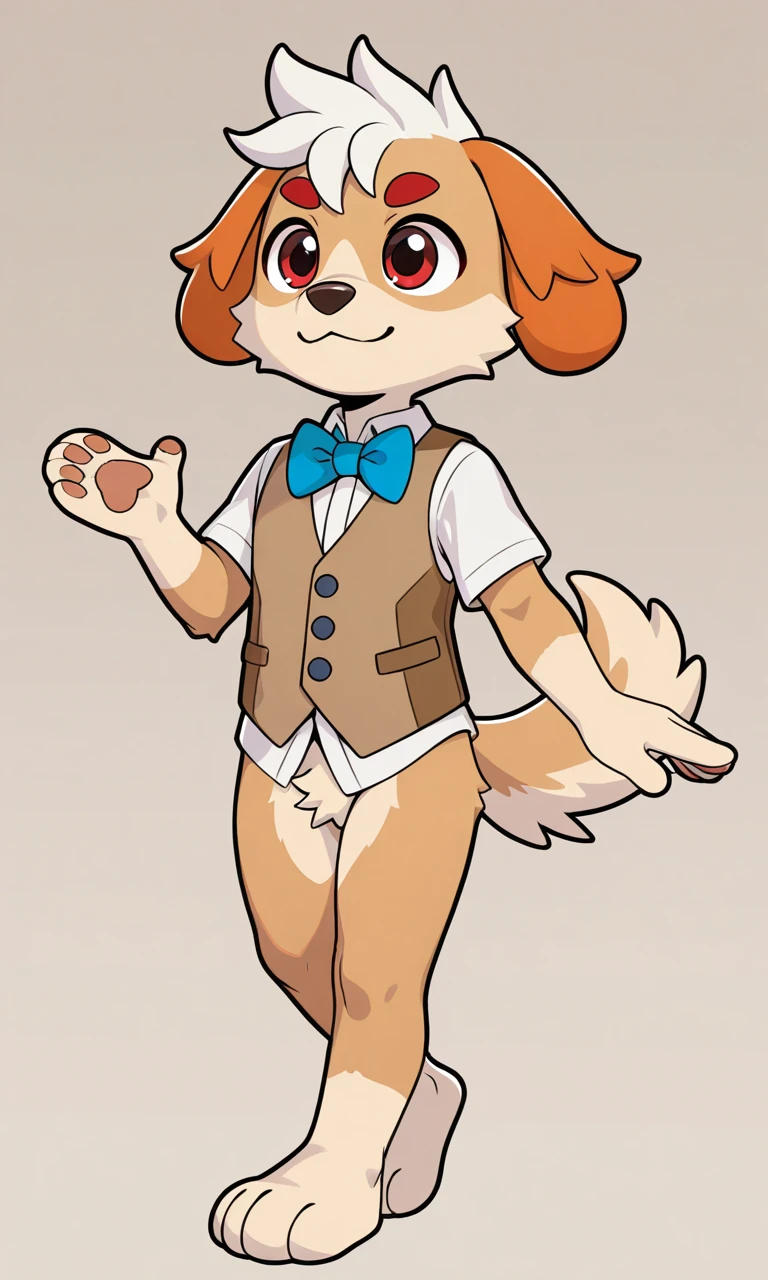 BuddyDF,anthro,furry,dog,solo,male,Large red eyes, red eyebrows, Light brown and tan fur,Long orange ears, tuft of white hair,tan tail,tan hands,tan paws, ochre vest, white shirt,blue bow tie,:3,
