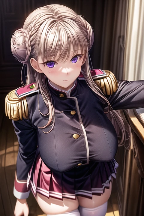 Trigger word: n_marres_a, long hair, brown hair, braid, hair bun, twin bun, purple eyes, big breasts, black uniform, long sleeves, epaulettes, red skirt, pleated skirt, white thighhighs,