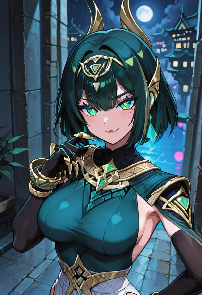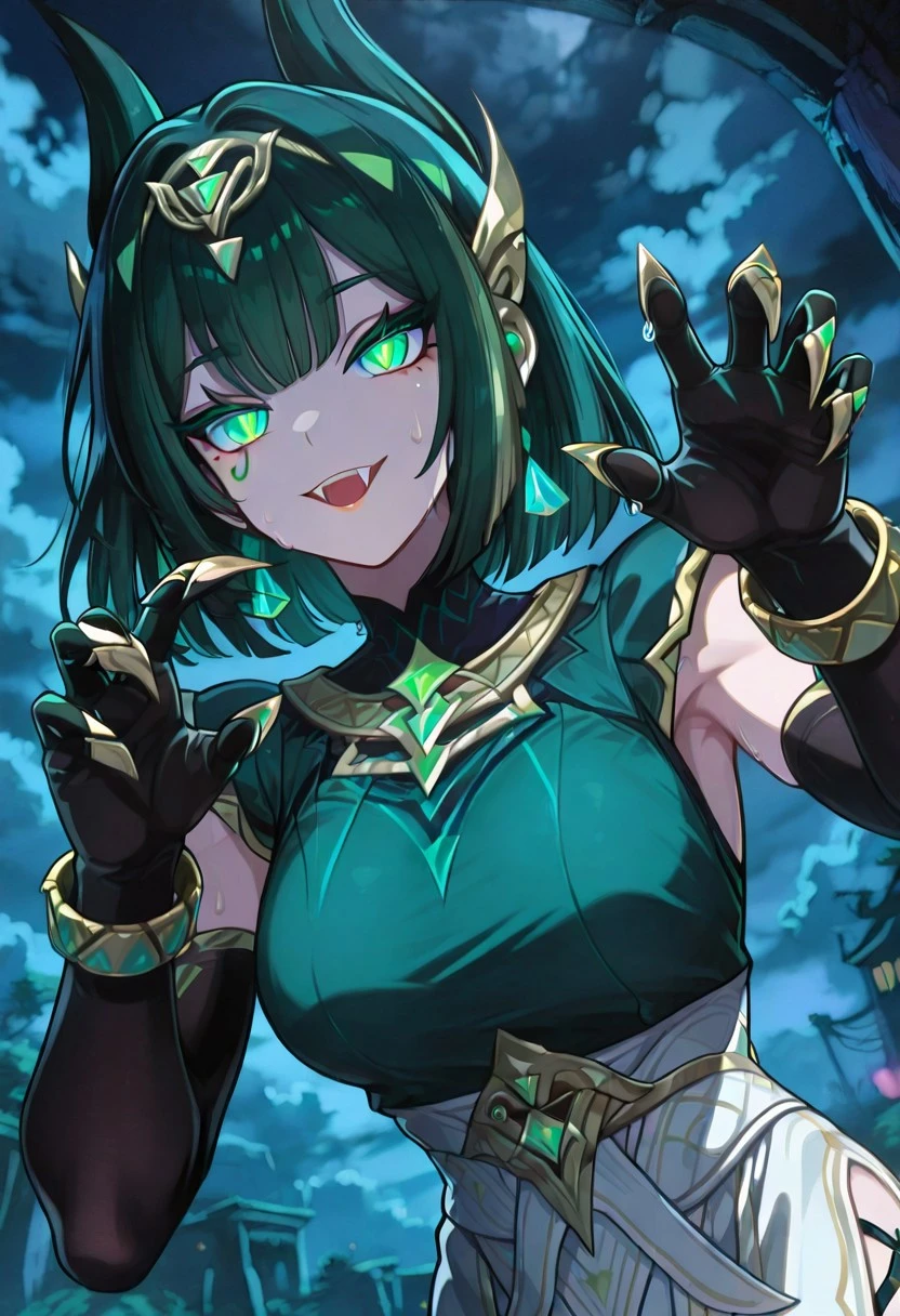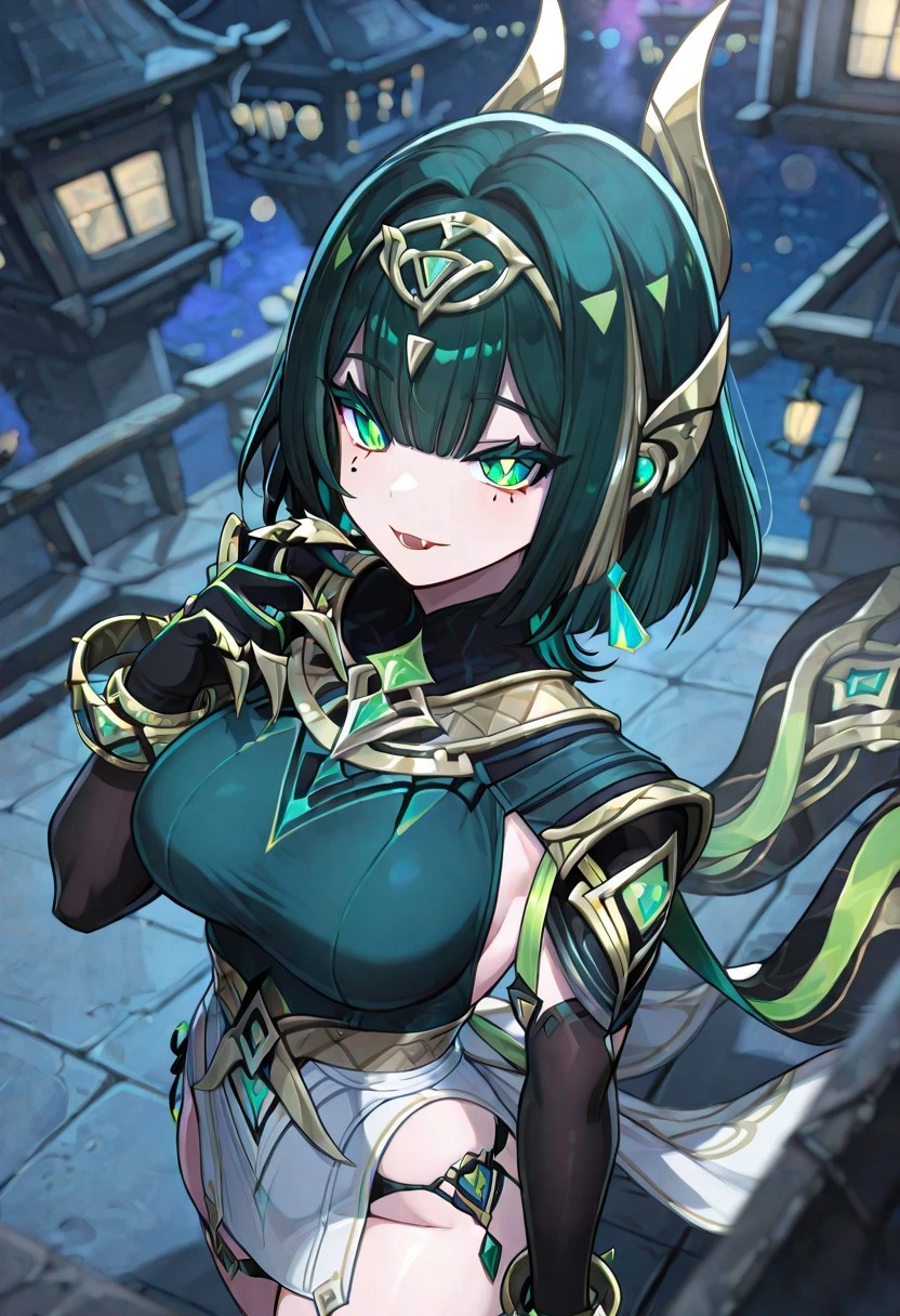 NeferGI, 1girl, solo, dark-green hair, hair ornament, short hair, bangs, hair clips, green eyes, green pupils, eyelashes, eyeshadow, mole under eye, makeup, lips, red lipstick, snake fangs, green dress, large breast, white loincloth, detached black elbow gloves, cutout dress, dress ornament, thick thighs, anklet, jewelry, bracelets, claw rings, side-tie dress, armpits cutout, thigh strap, gem, shoes,