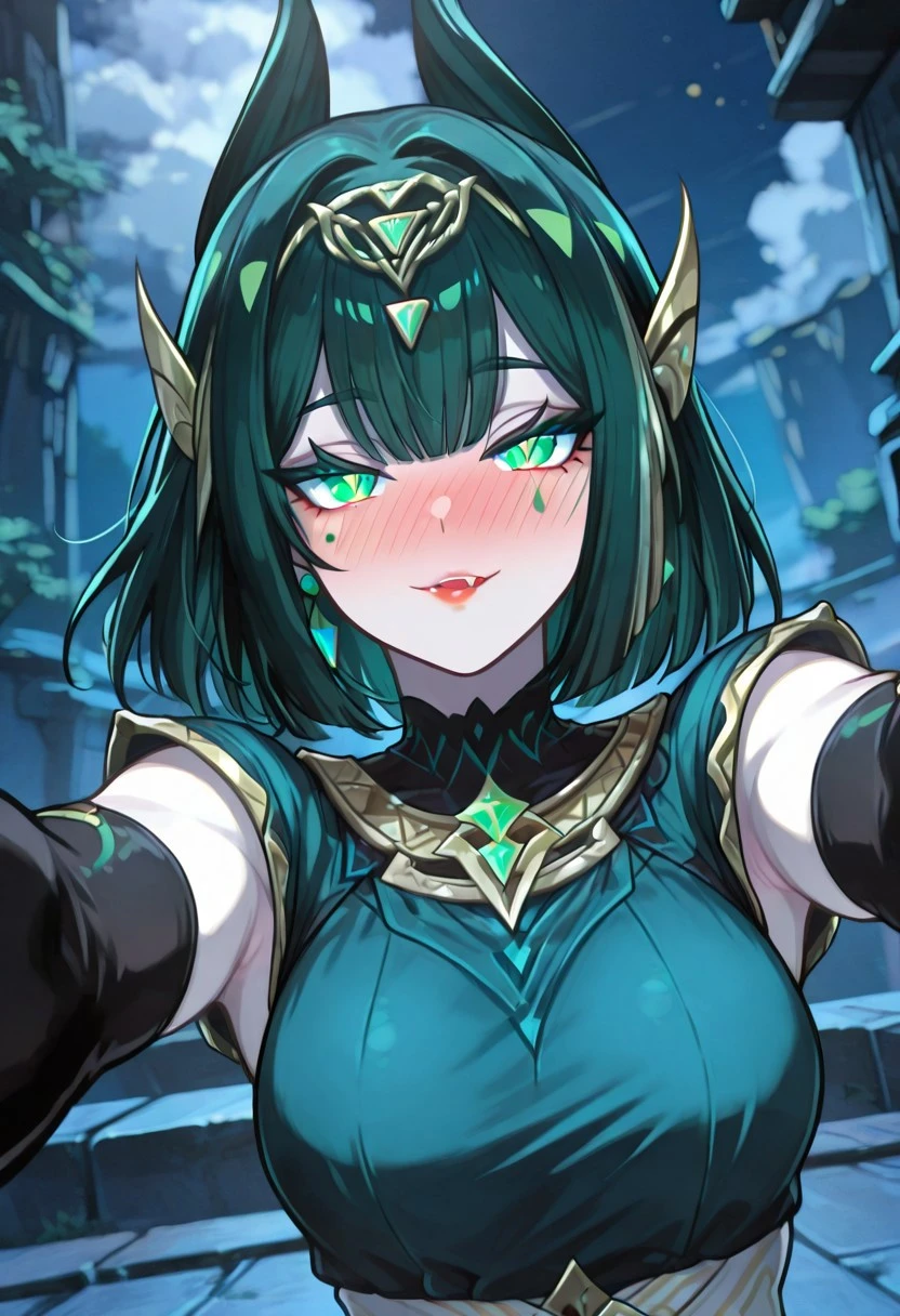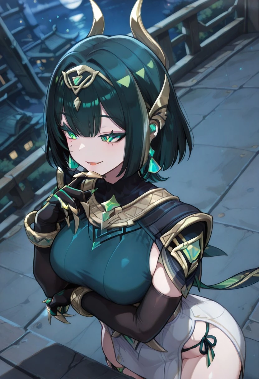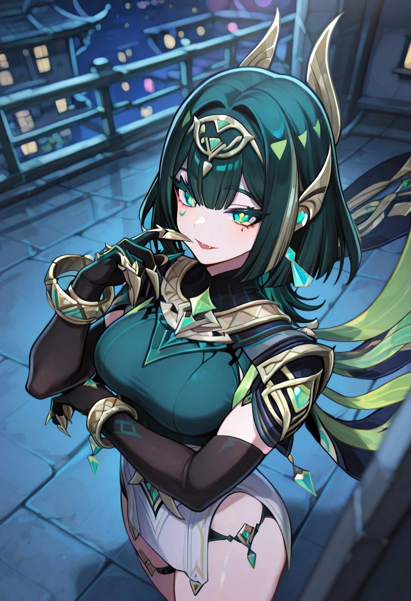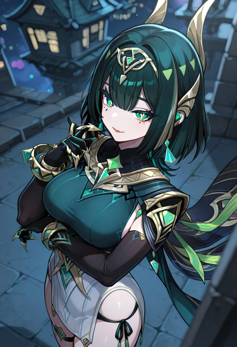 NeferGI, 1girl, solo, dark-green hair, hair ornament, short hair, bangs, hair clips, green eyes, green pupils, eyelashes, eyeshadow, mole under eye, makeup, lips, red lipstick, snake fangs, green dress, large breast, white loincloth, detached black elbow gloves, cutout dress, dress ornament, thick thighs, anklet, jewelry, bracelets, claw rings, side-tie dress, armpits cutout, thigh strap, gem, shoes,