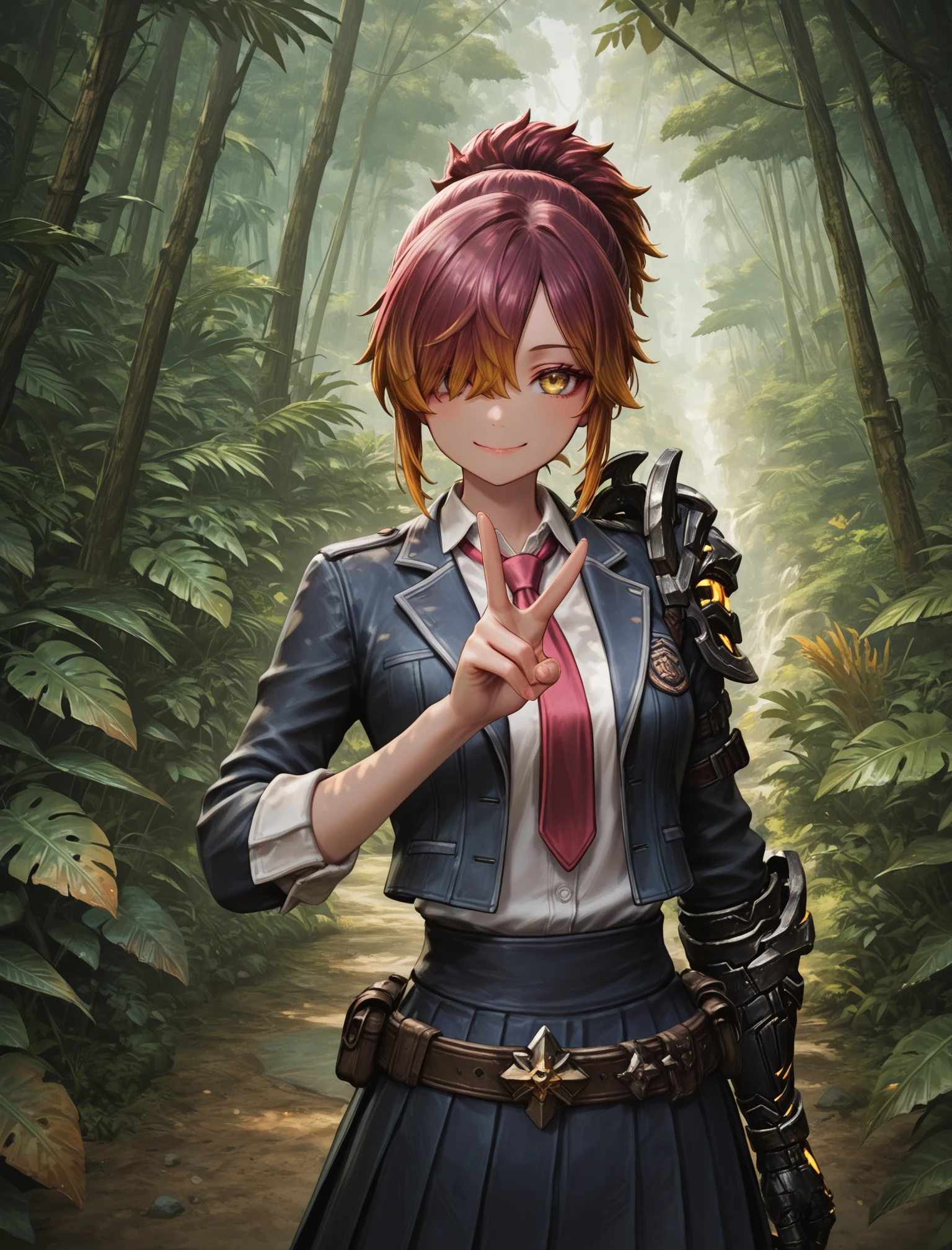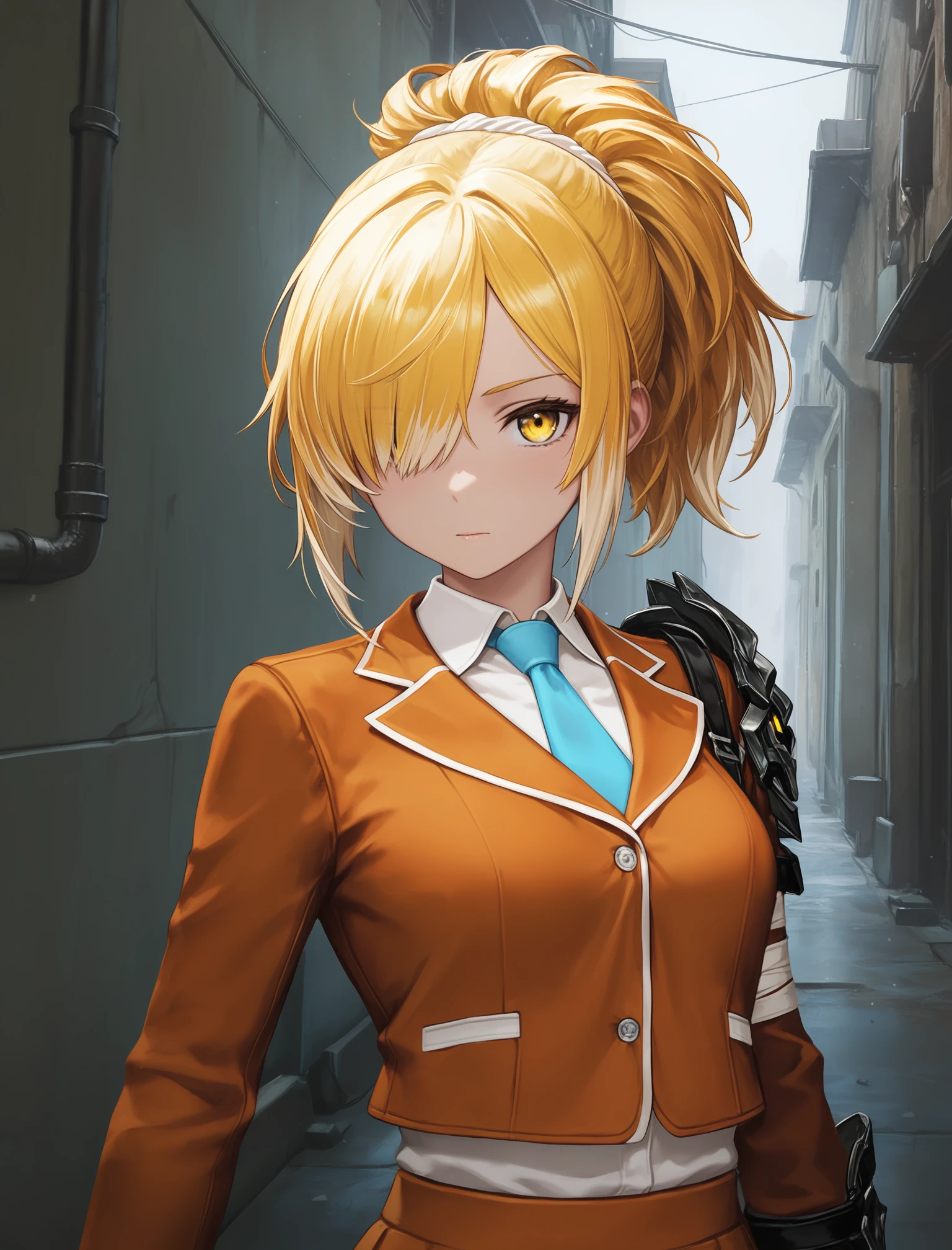 Golden grad, yellow eyes, hair over eye, ponytail.