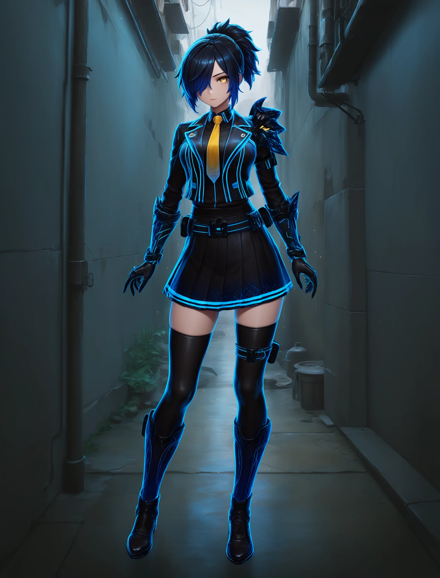 Example: Neowave, yellow eyes, hair over eye, ponytail.