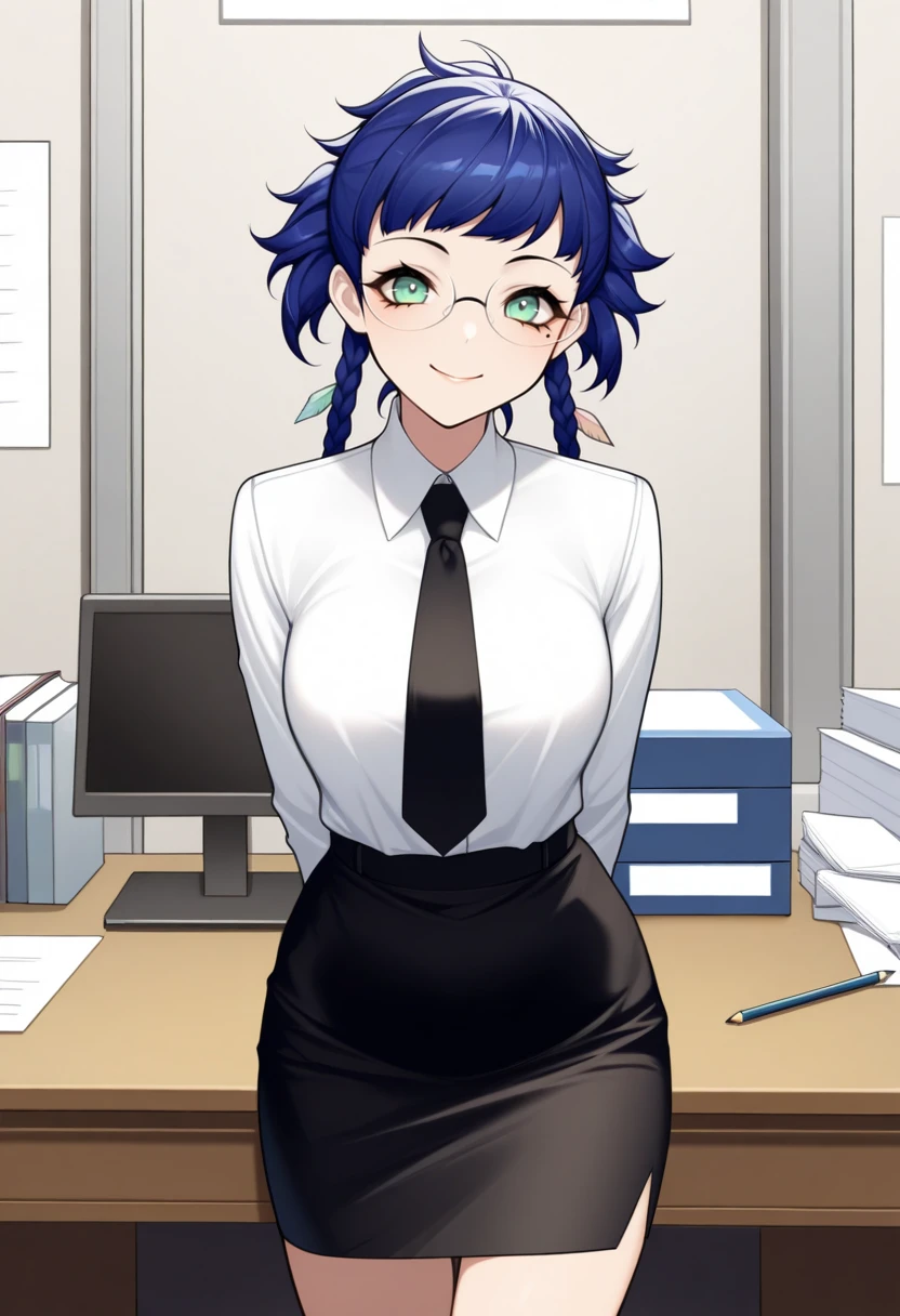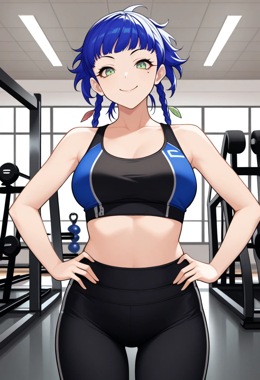 ch1kap2, blue hair, short hair, twin braids, green eyes, mole under eye, black school uniform, skirt, green bow