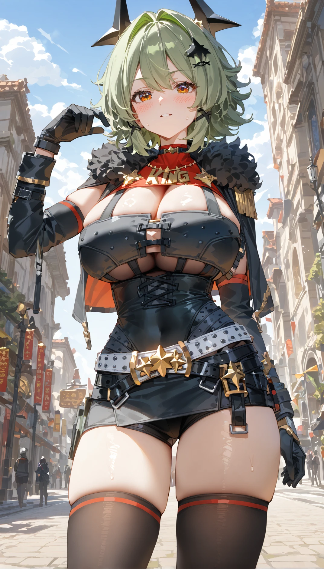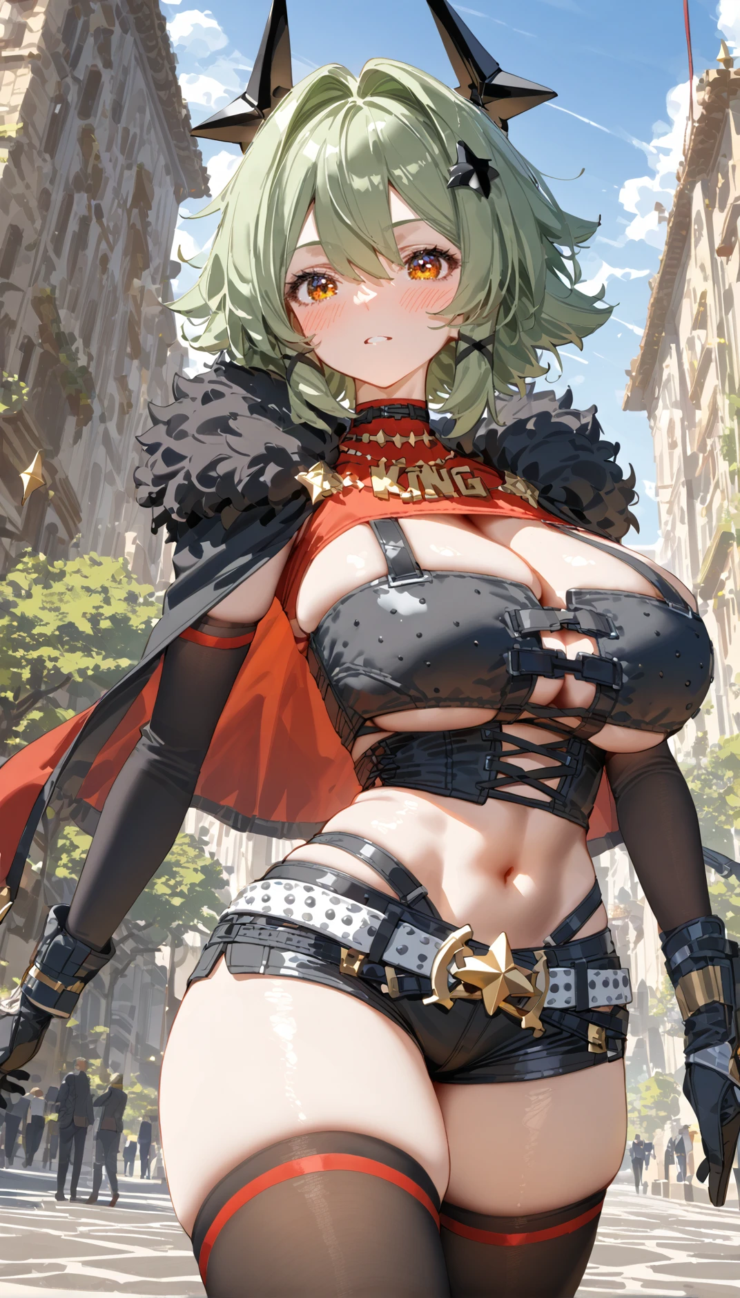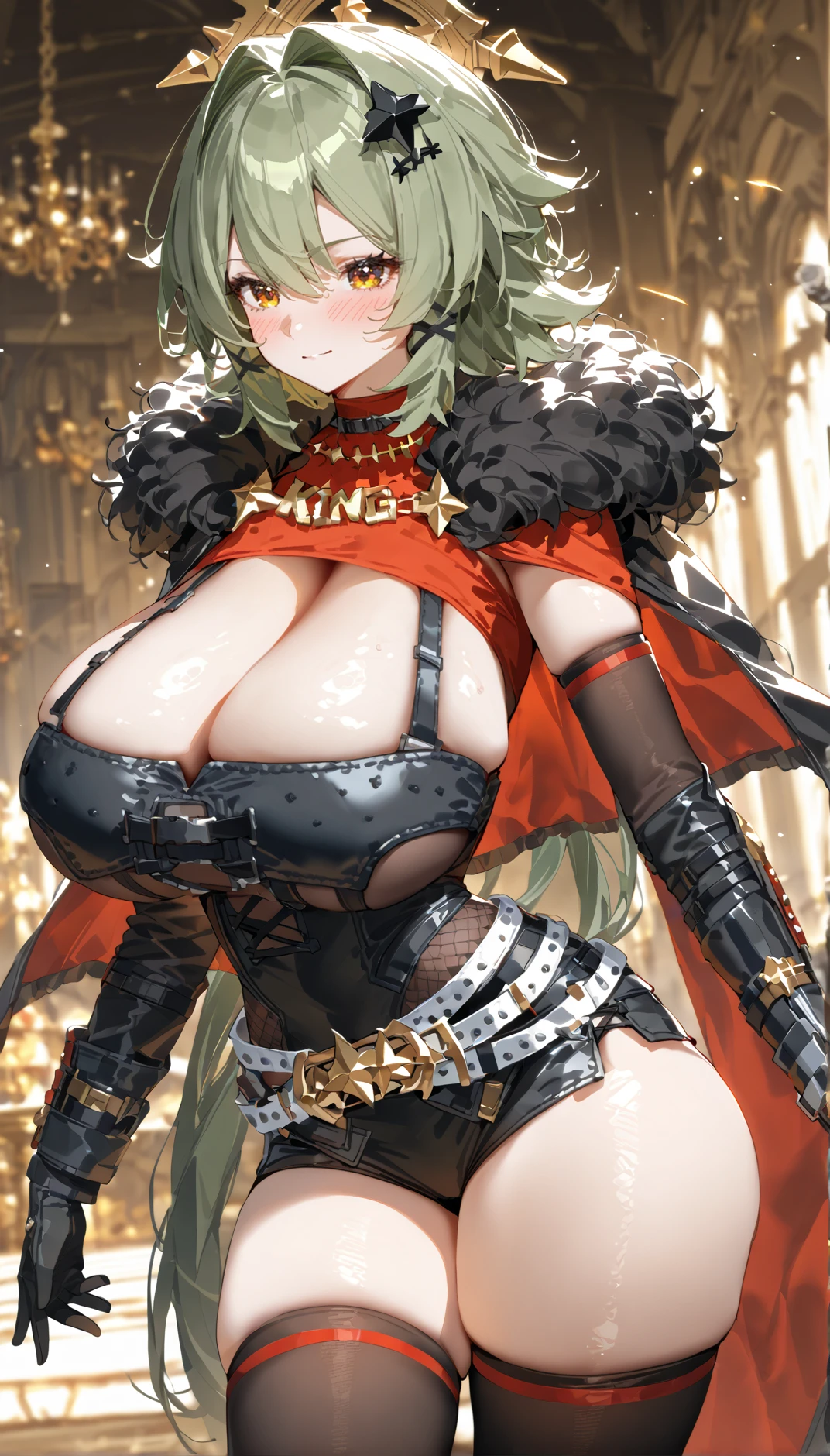 blush, thighs, belt, short cape, "KING", star \(symbol\),