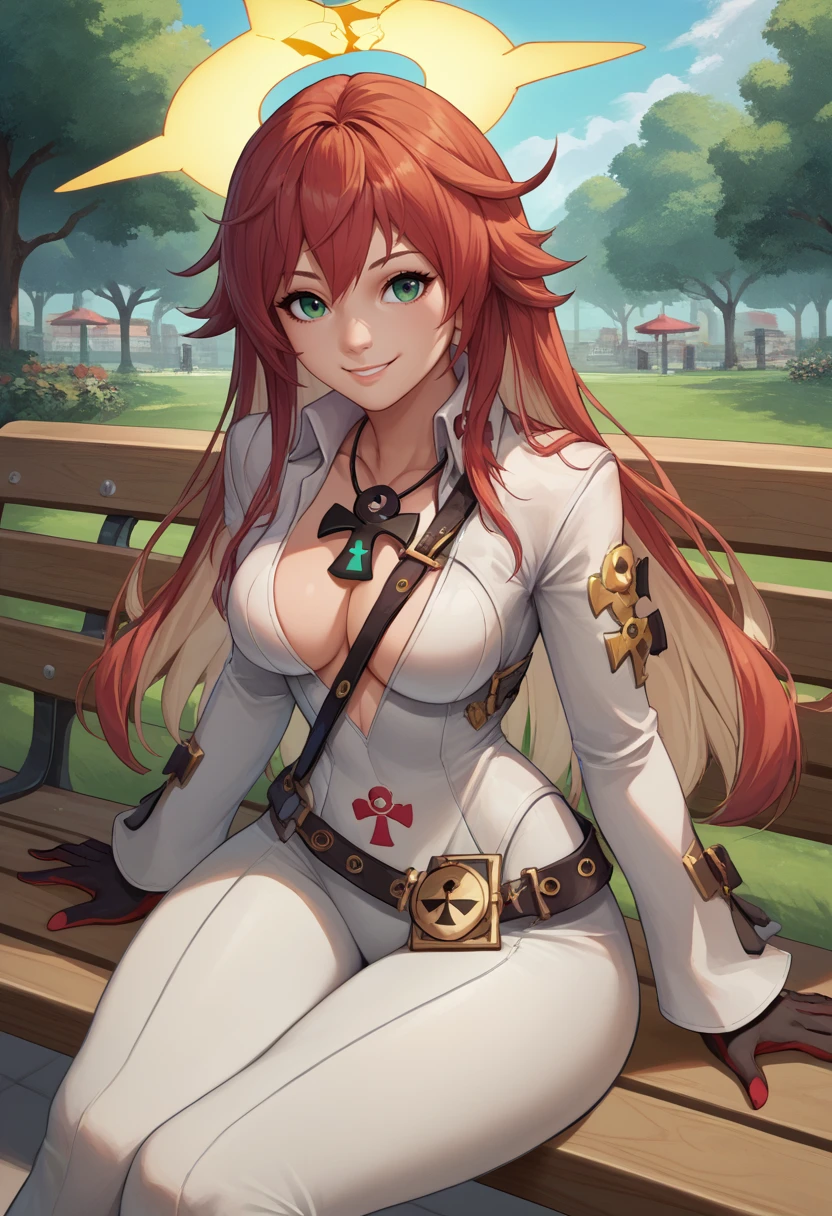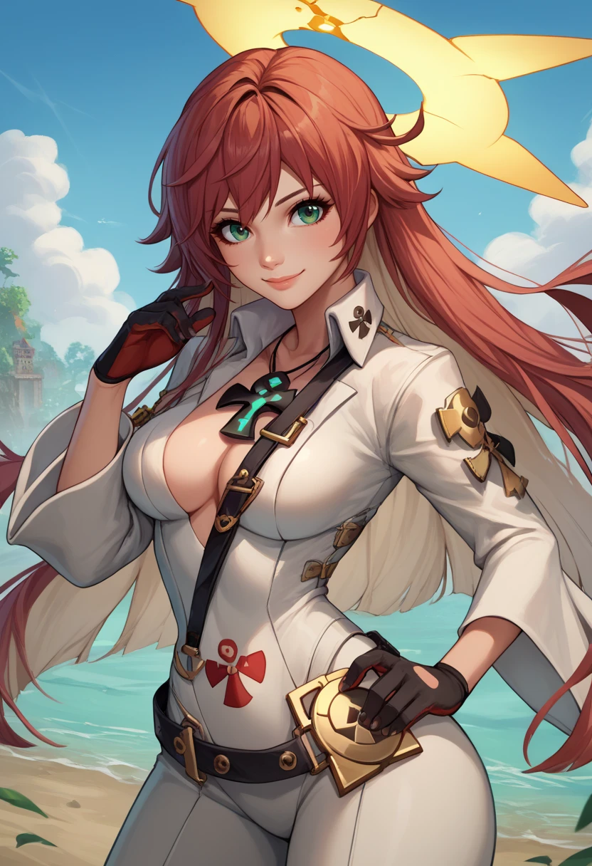 white bodysuit, black gloves, belt, ankh, necklace, cleavage