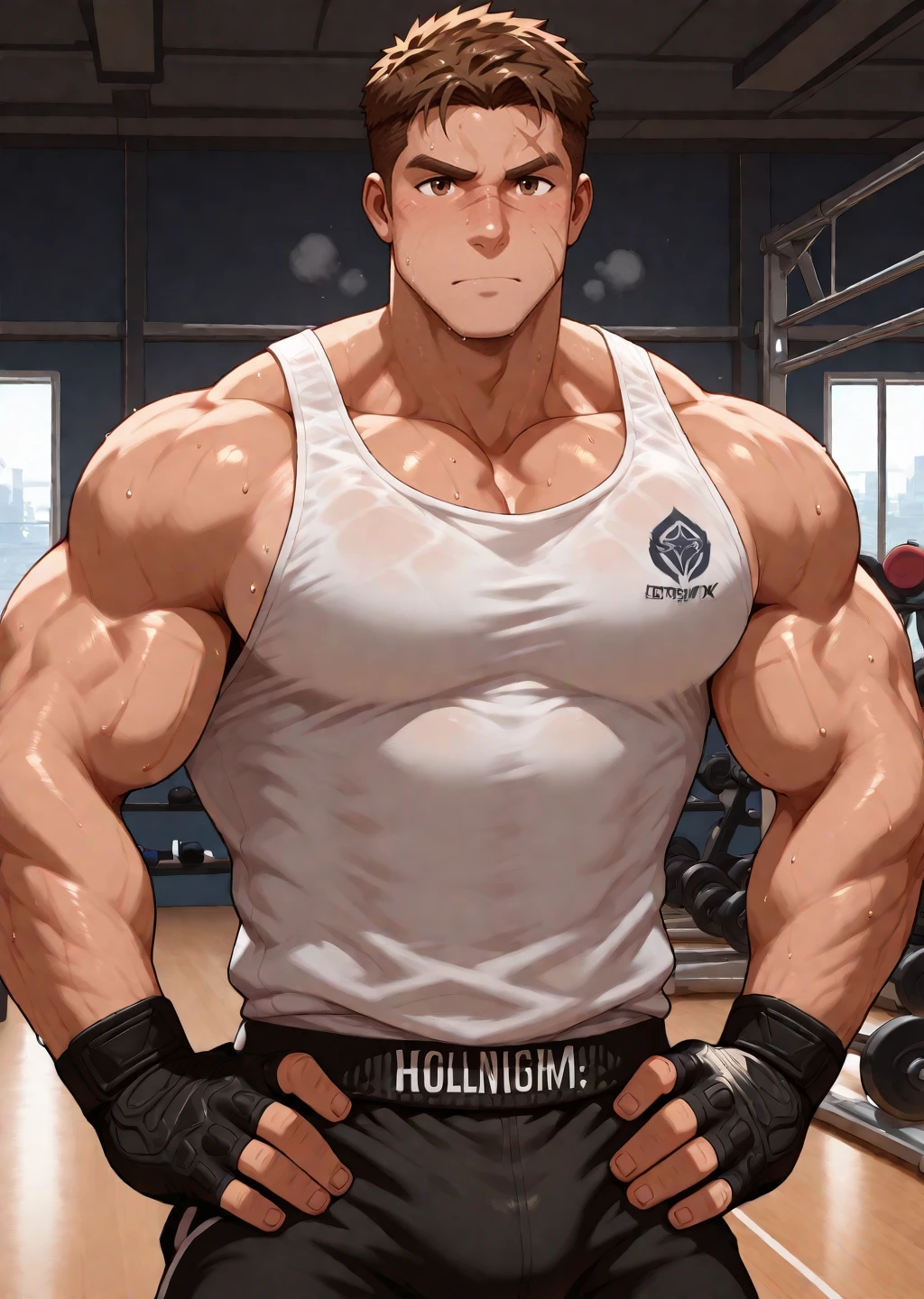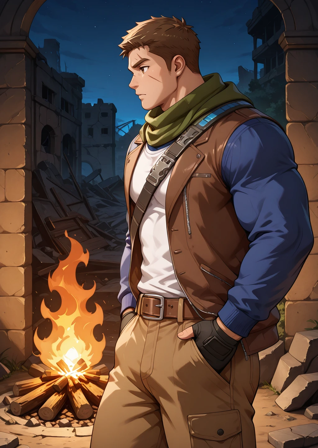 brown slevelees jacket, blue long sleeve t-shirt, white tank top, green scarf, brown pantsSettings I used: