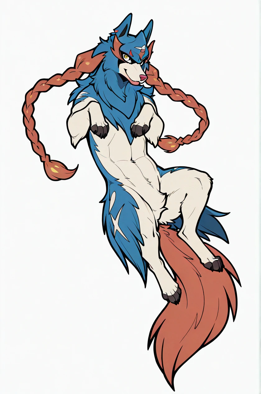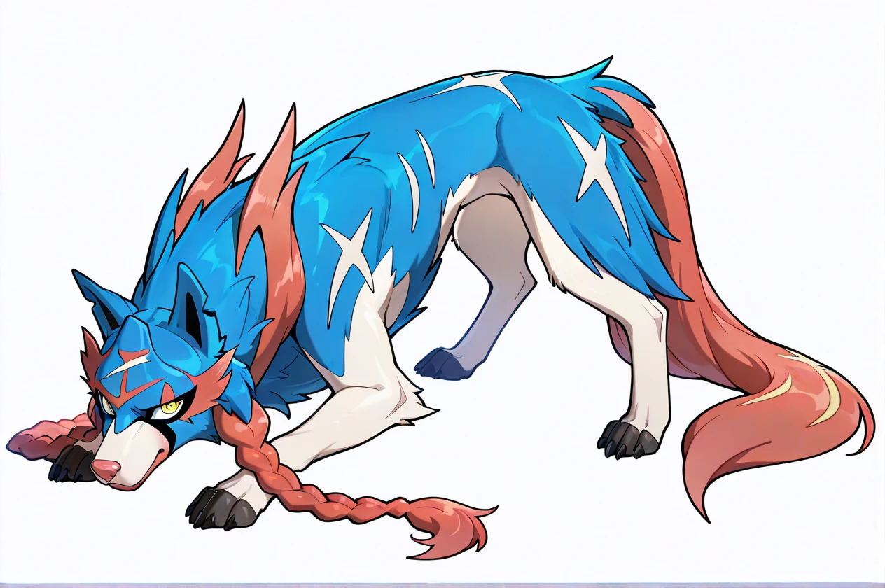 hero of many battles suggest prompt:zacian, the white patterns on the body look like scars, red braids, hero of many battles,blue face,
