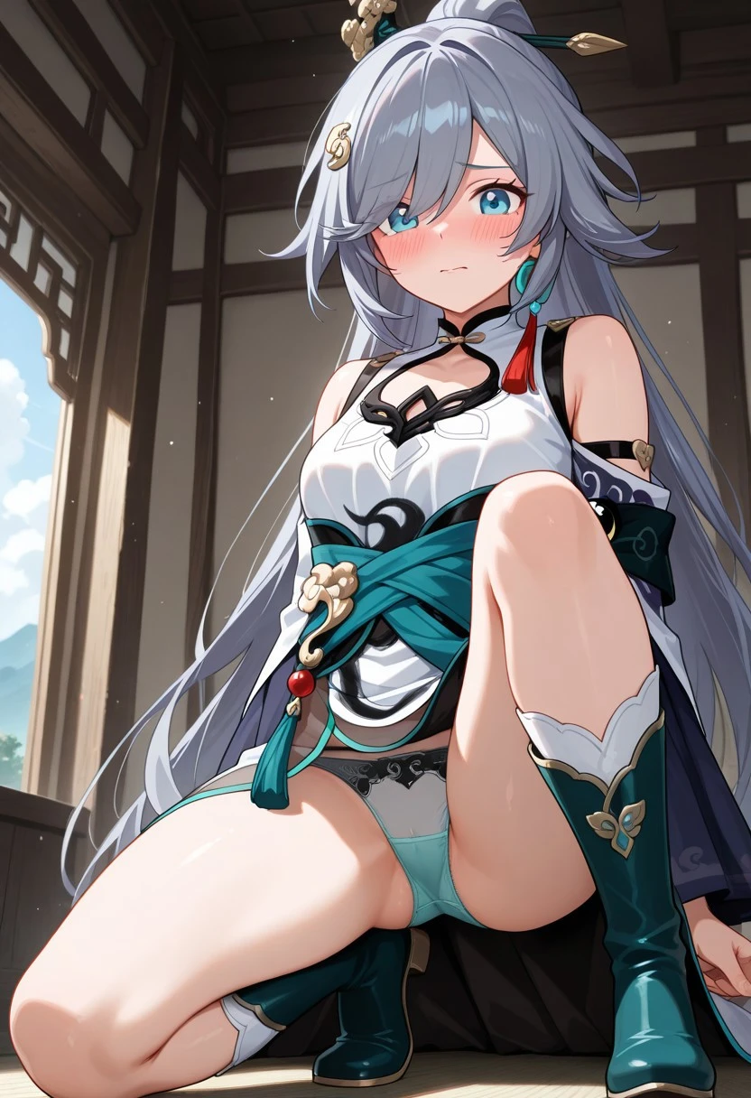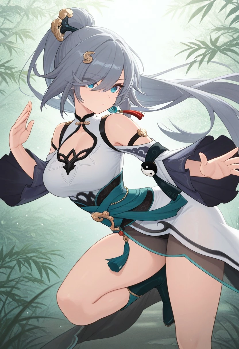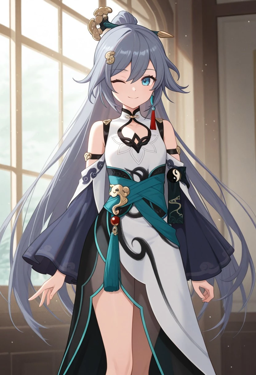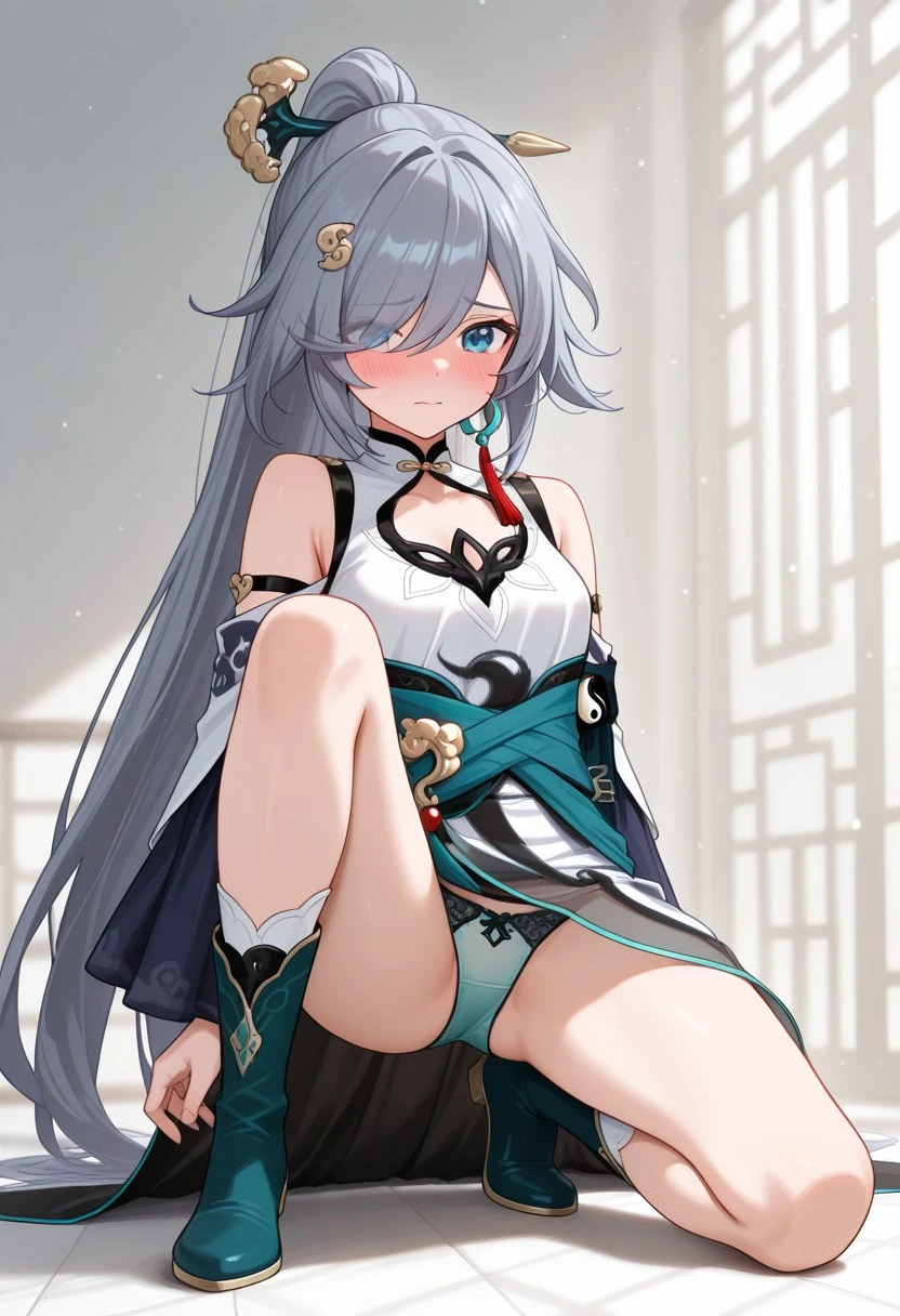 1girl, solo, FuHuAzuEmp, blue eyes, grey hair, ponytail, hair over one eye, small breasts