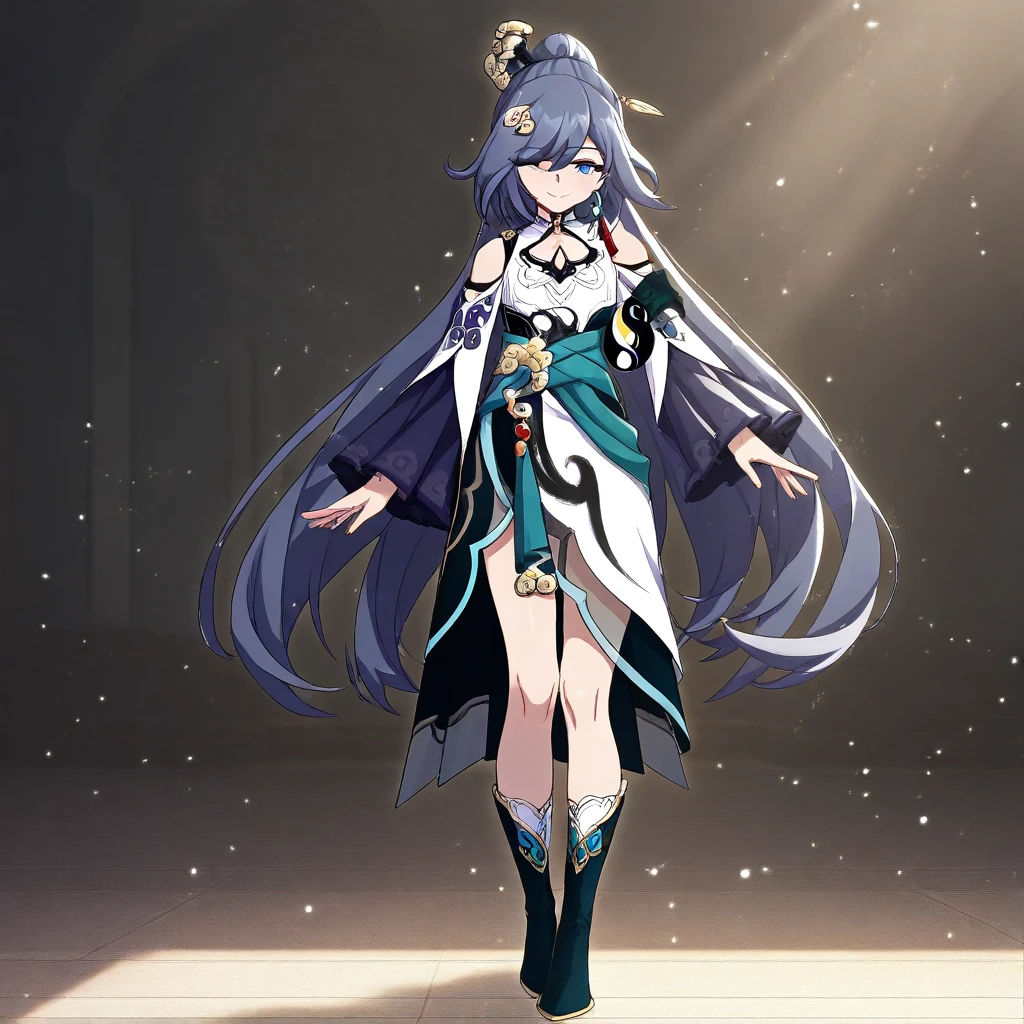 AzuEmpOutfit, jade earring with red tassel, gold hairpin, black and gold hair ornament, black and white top, cleavage opening, teal waist sash, ornate white and navy blue sleeves, teal sleeve decoration with gold trim, long black and white skirt with teal trim, side slit, semi-transparent skirt hem, black armbands with gold decoration, navy blue ribbon with yinyang symbol, white and black boots with gold trim, teal boot decorations with gold trim, bare legs