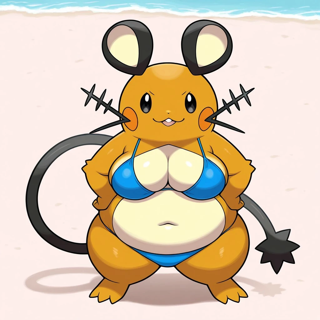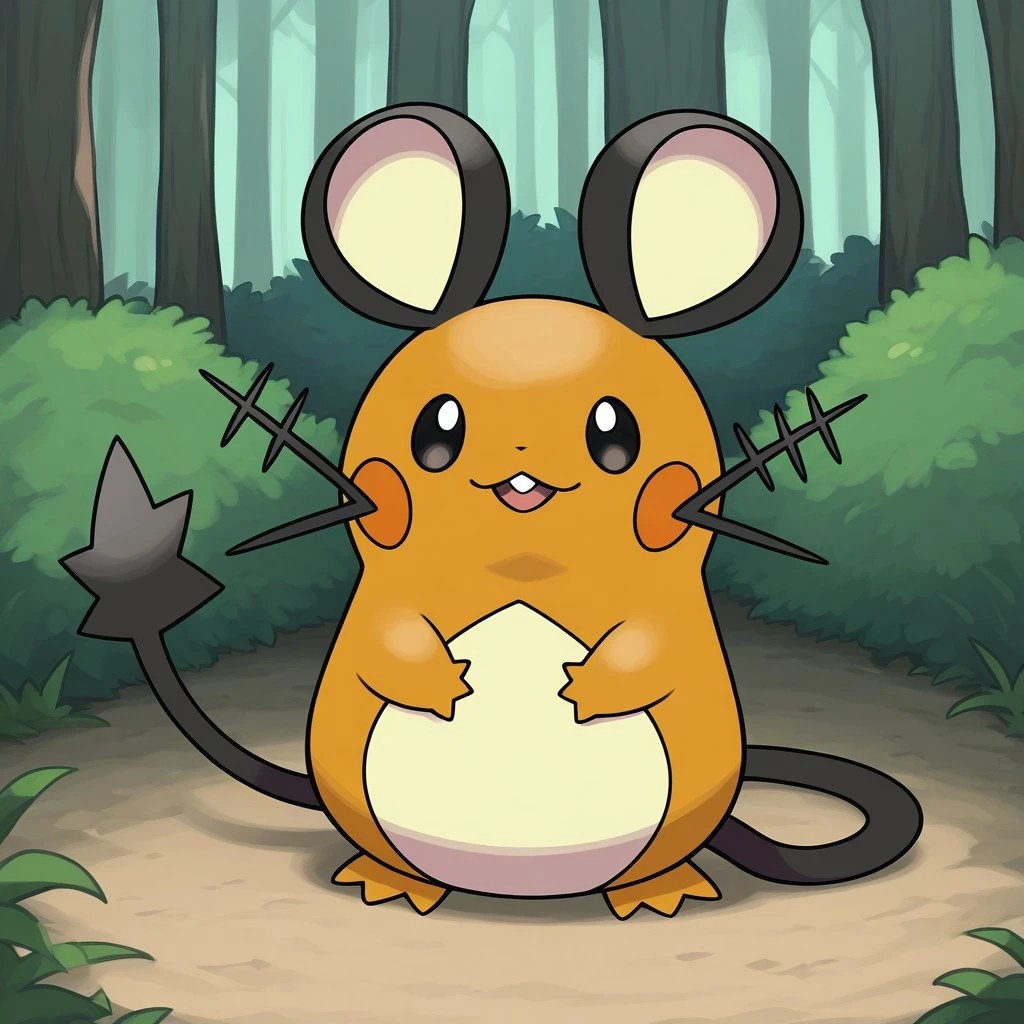 rodent, gerbil, pokemon (creature), orange fur, tan belly, black eyes, black nose, black mouse ears, bucktooth, whiskers, red cheeks, long black tail, round body,