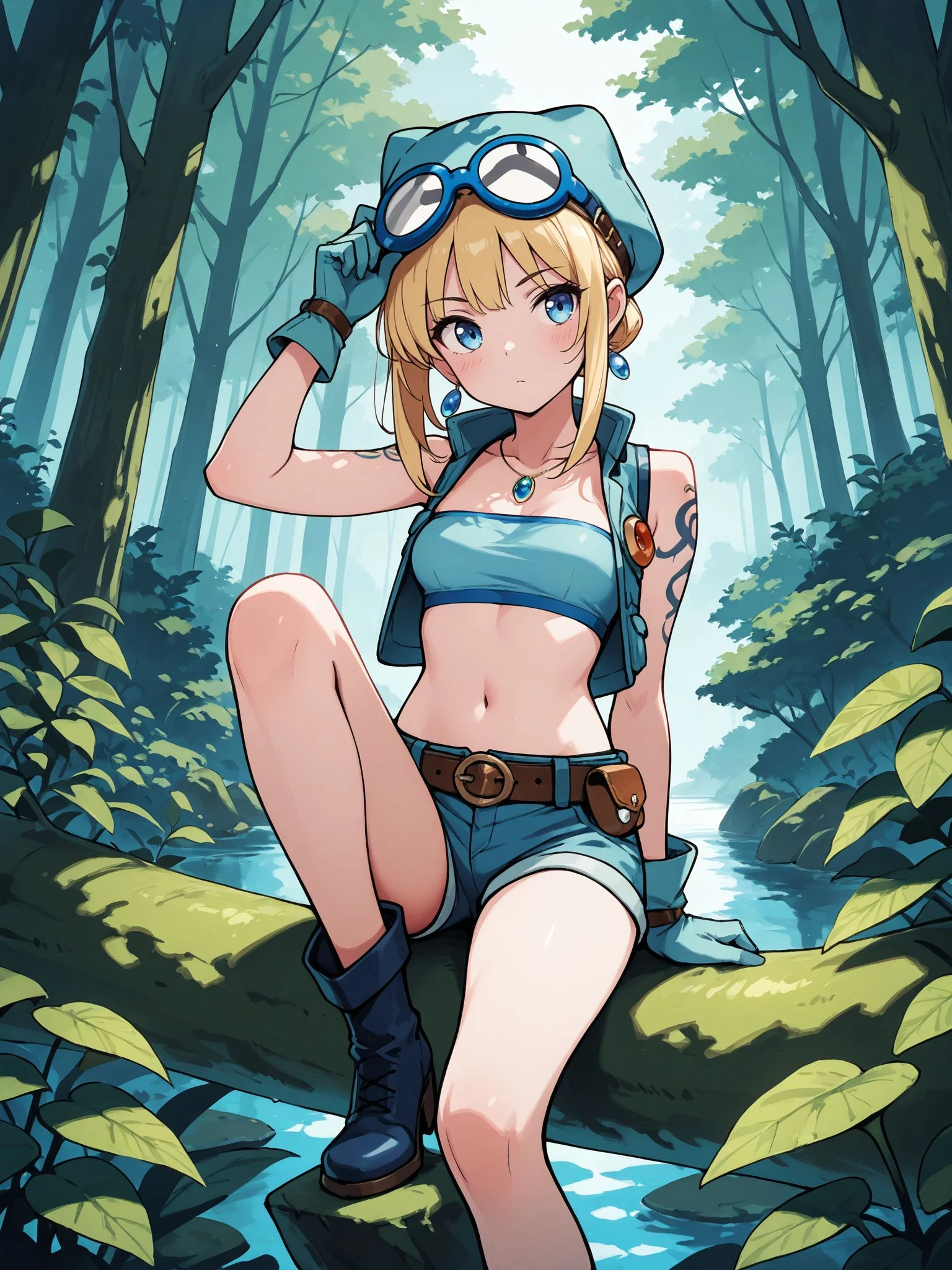 vest, tube top, shorts, belt, gloves, googles on head, jewelry, boots, hat