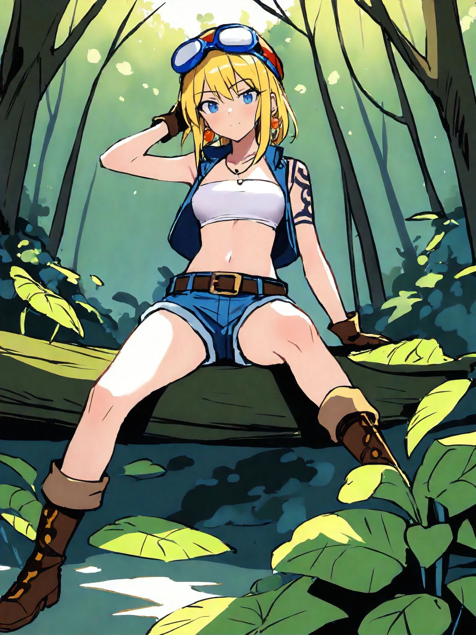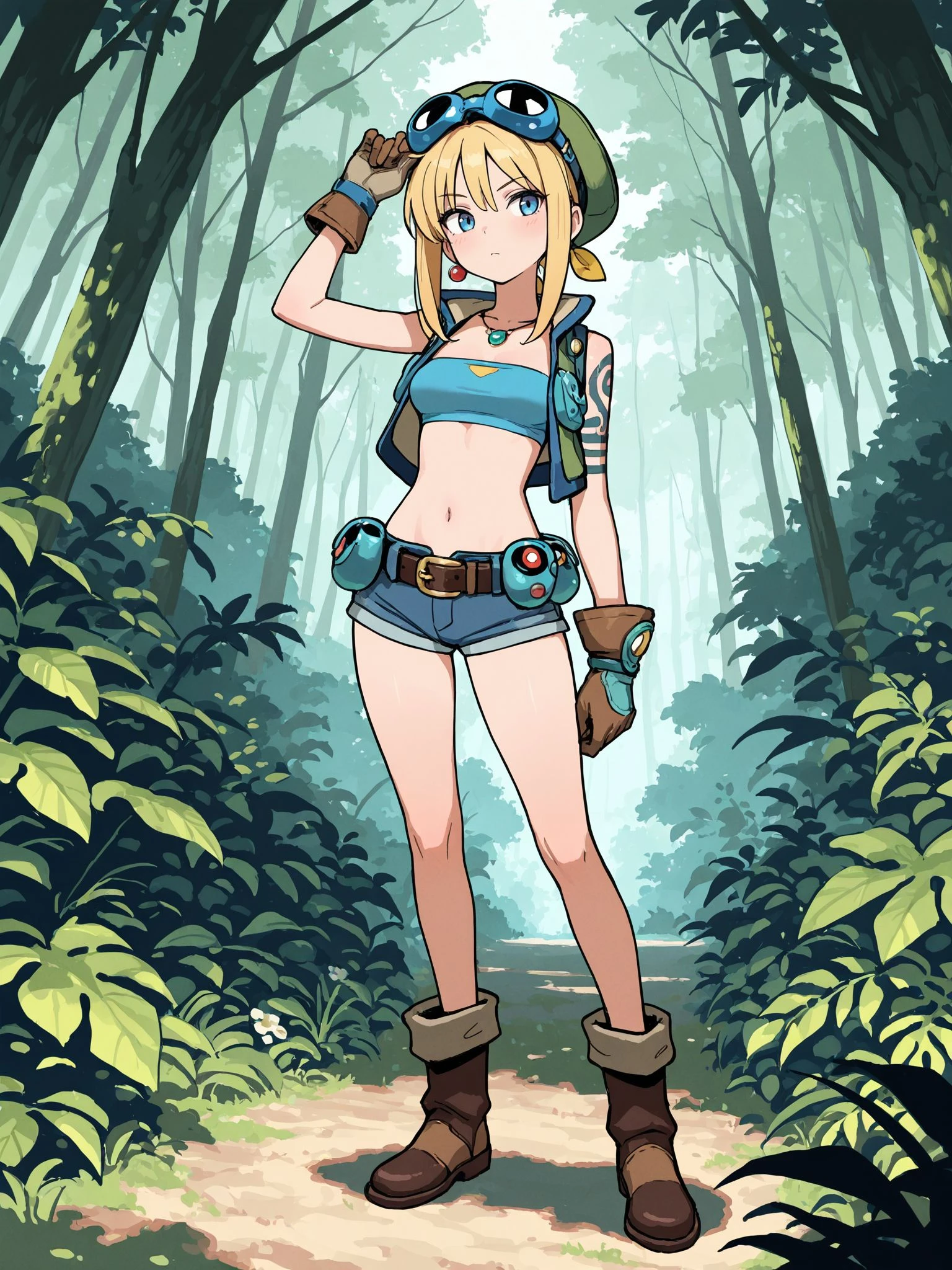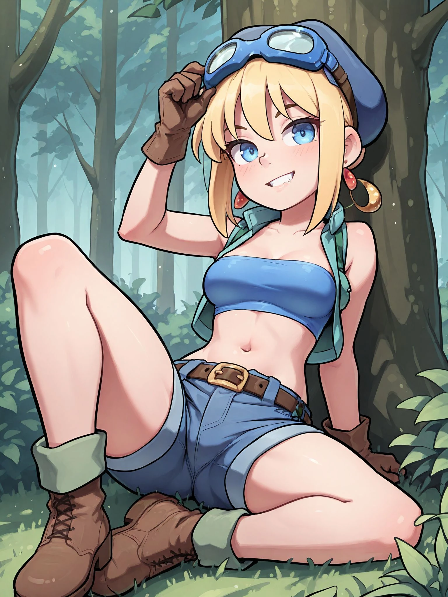 Outfit Tags: vest, tube top, shorts, belt, gloves, googles on head, jewelry, boots,