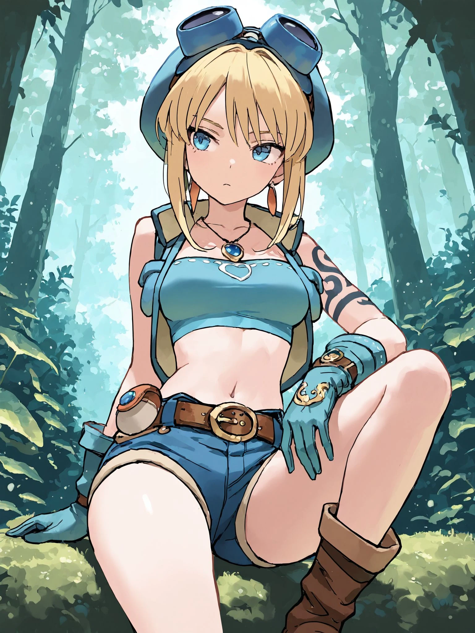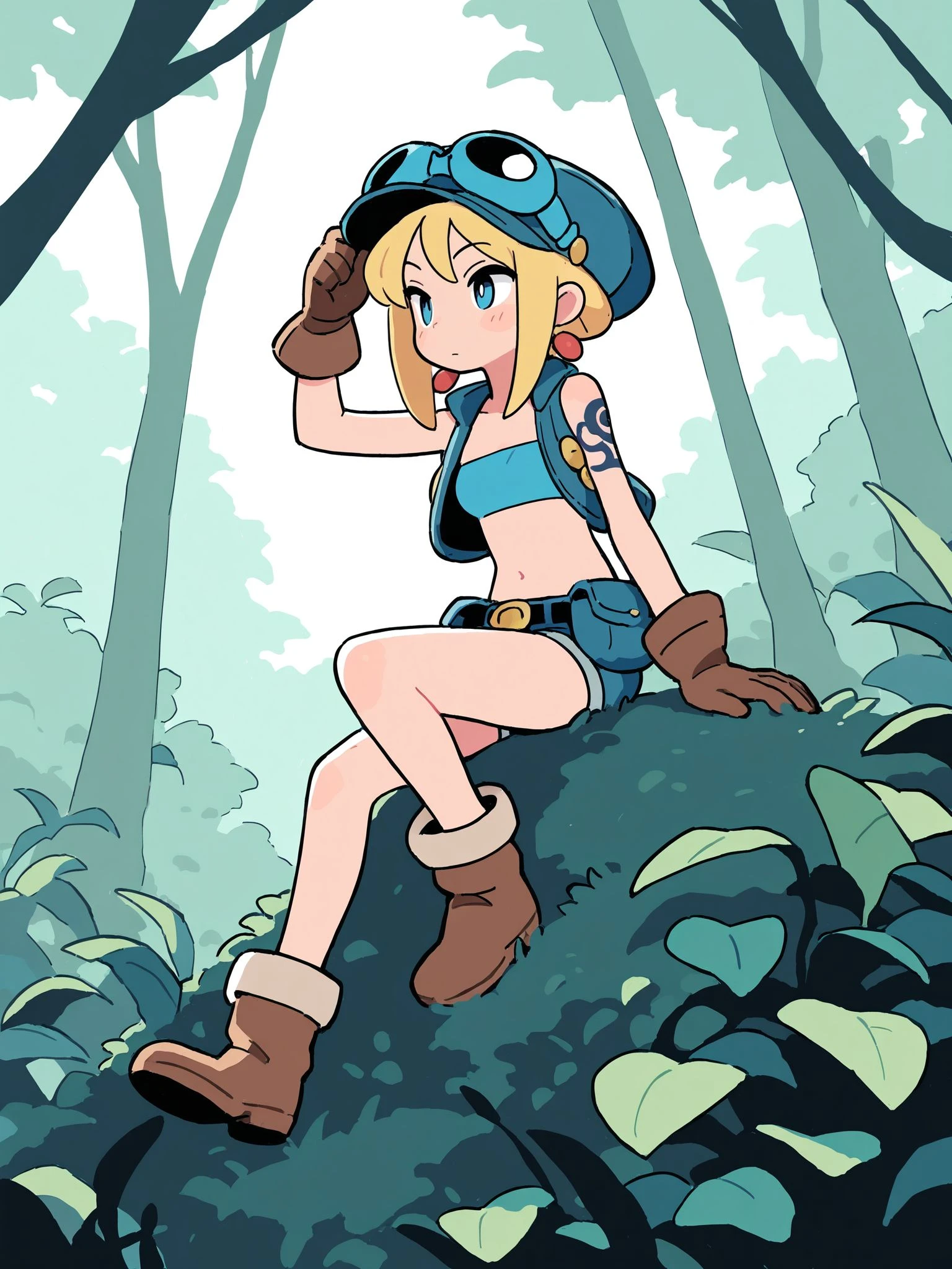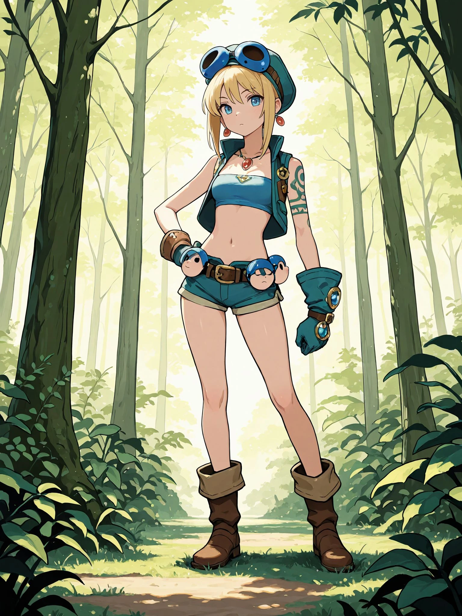 Outfit Tags: vest, tube top, shorts, belt, gloves, googles on head, jewelry, boots,