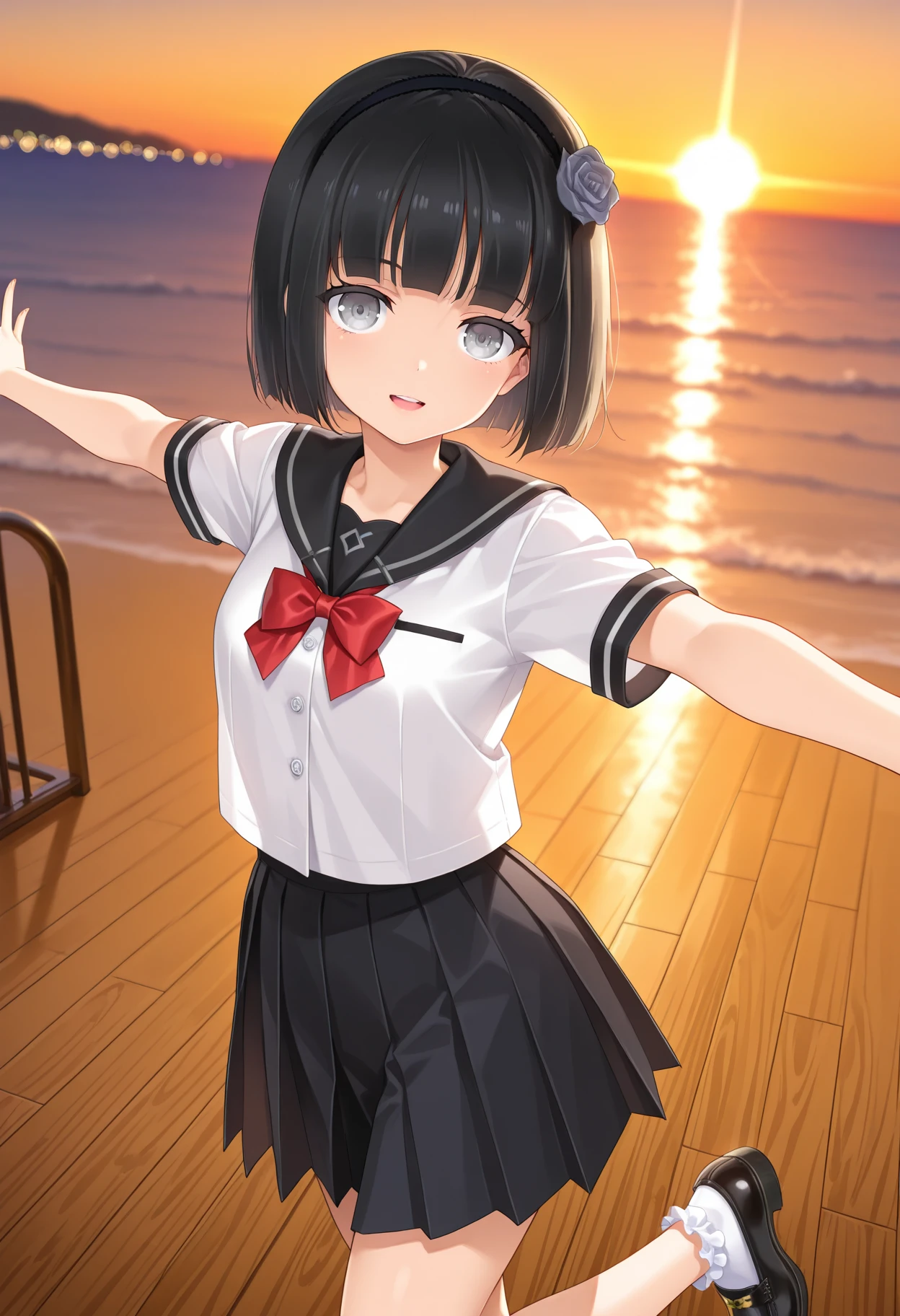 serafuku, black sailor collar, white shirt, red bowtie, short sleeves, pleated skirt, black skirt, frilled socks, black footwear