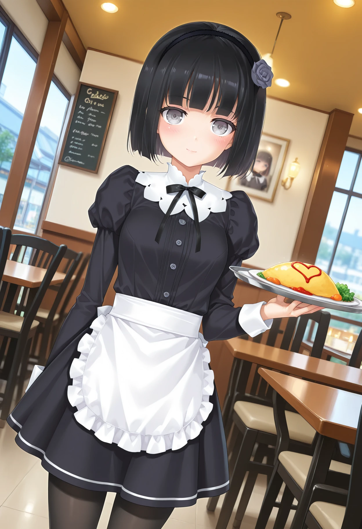 blunt bangs, short hair, black hair, grey eyes, hair flower, black hairband, grey rose
