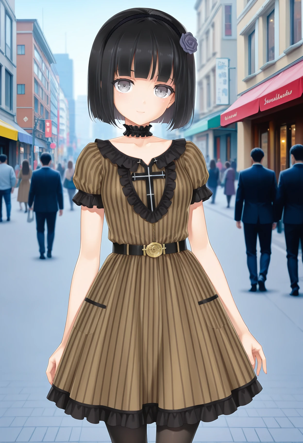 frilled choker, collarbone, frilled dress, striped dress, brown dress, medium dress, cross, puffy short sleeves, black belt, black pantyhose