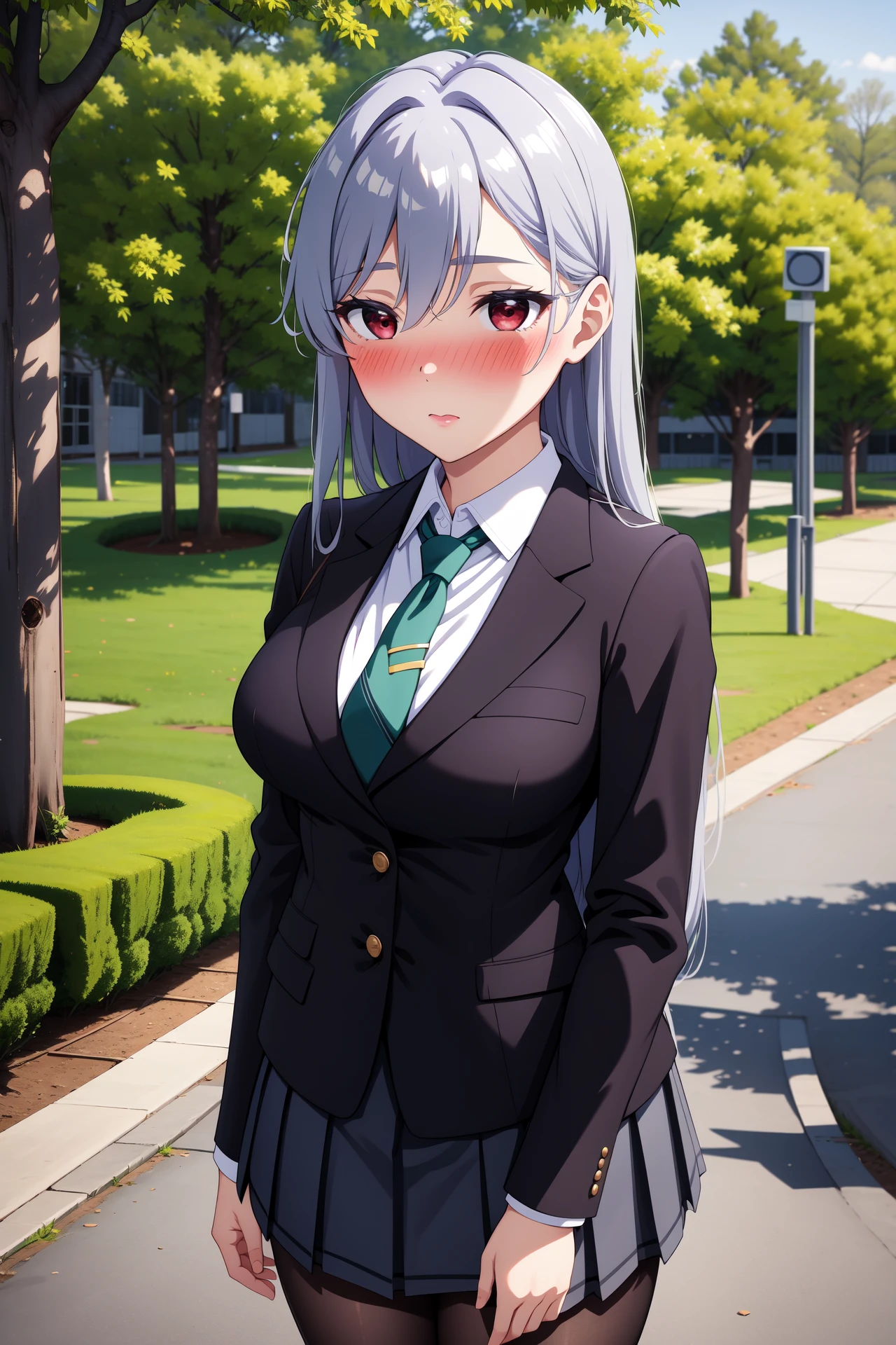 school: school uniform, blazer, shirt, white shirt, collared shirt, long sleeves, skirt, pleated skirt, miniskirt, necktie, pantyhose, brown pantyhose,