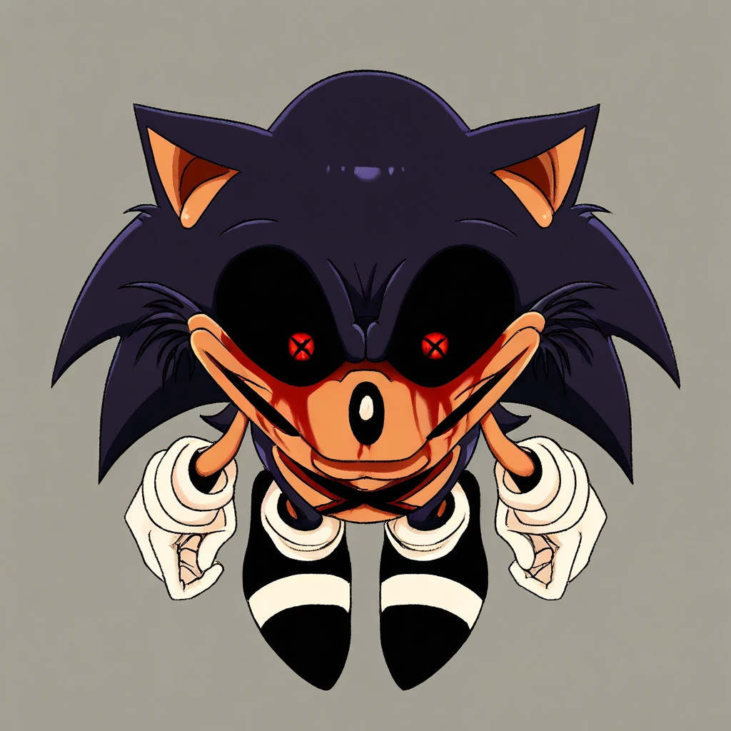 LordX, Sonic.exe, furry, anthro, red eyes, x-shaped eyes, black sclera, dark blue fur, x-shaped scar, scar on , white gloves, black shoes, blood from eyes, sharp teeth, yellow teeth,