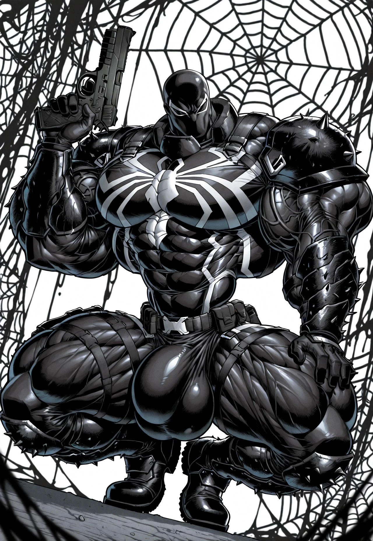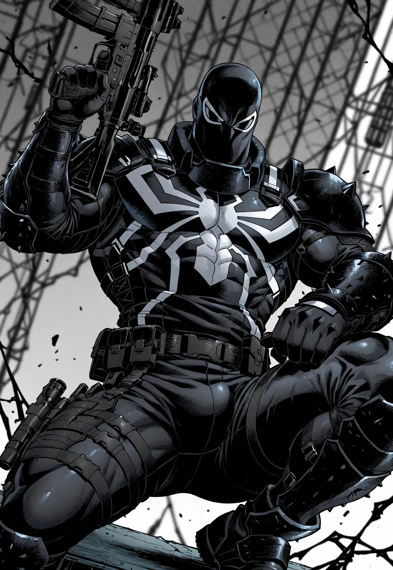 ag3ntv, black mask, black and white bodysuit, black shoulder plate, spiked shoulder plate, black vambrace, spiked vambrace, black boots, spiked boots, tactical gear, tactical belt