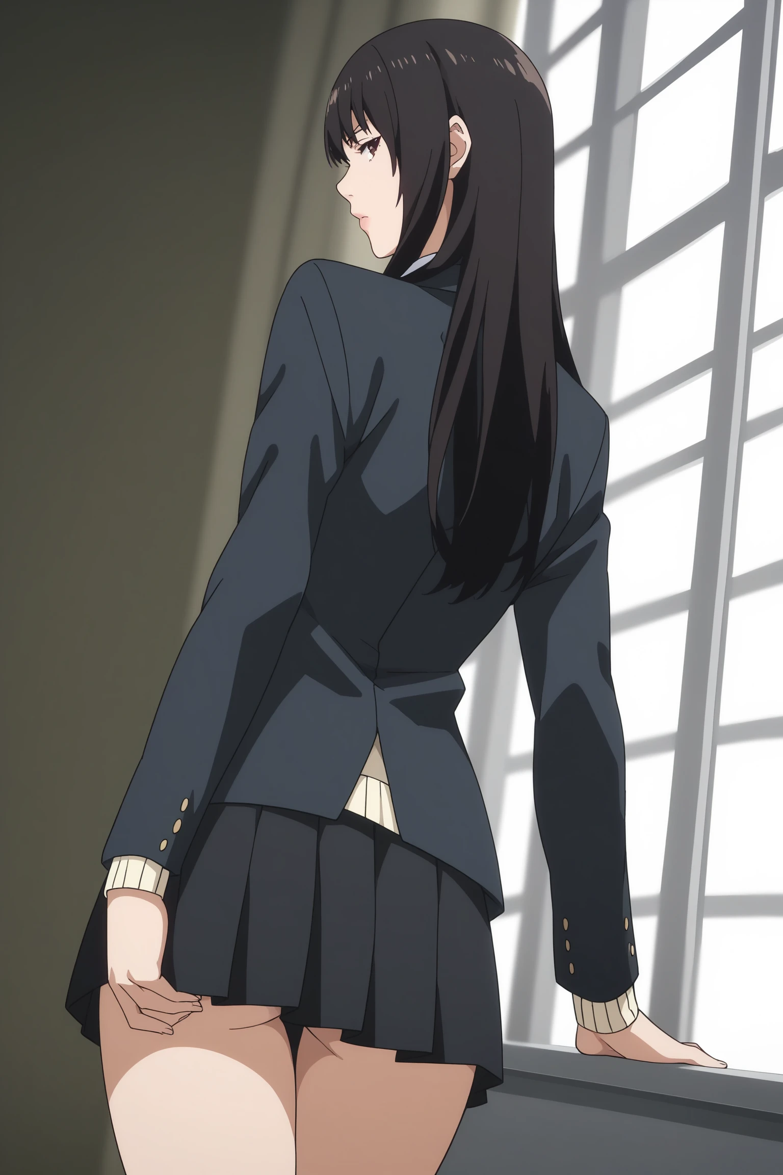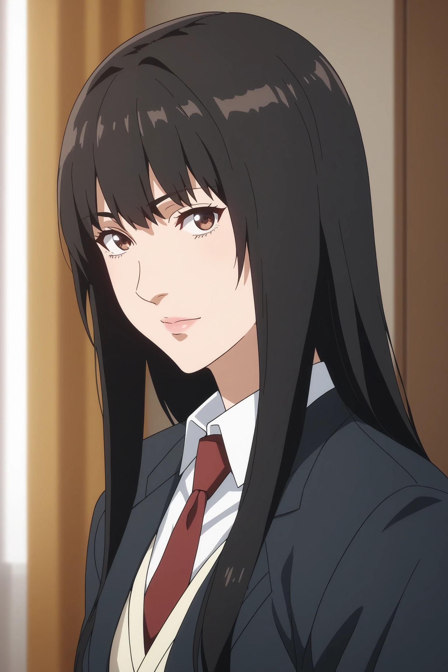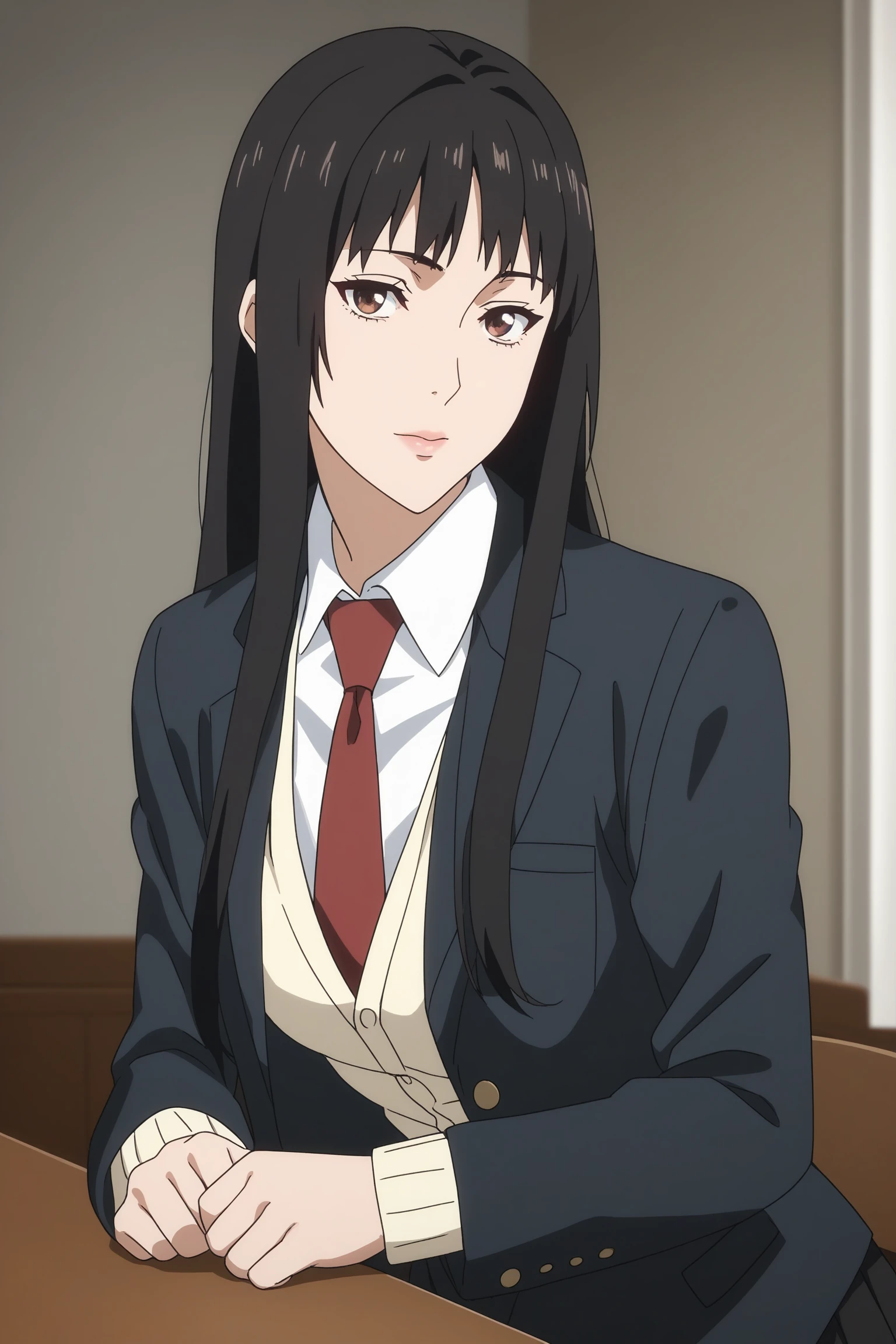 inuyashiki mari, long hair, black hair, bangs, brown eyes, school uniform, blazer, black jacket, white shirt, collared shirt, red necktie, yellow sweater, black skirt, pleated skirt, white kneehighs, loafers