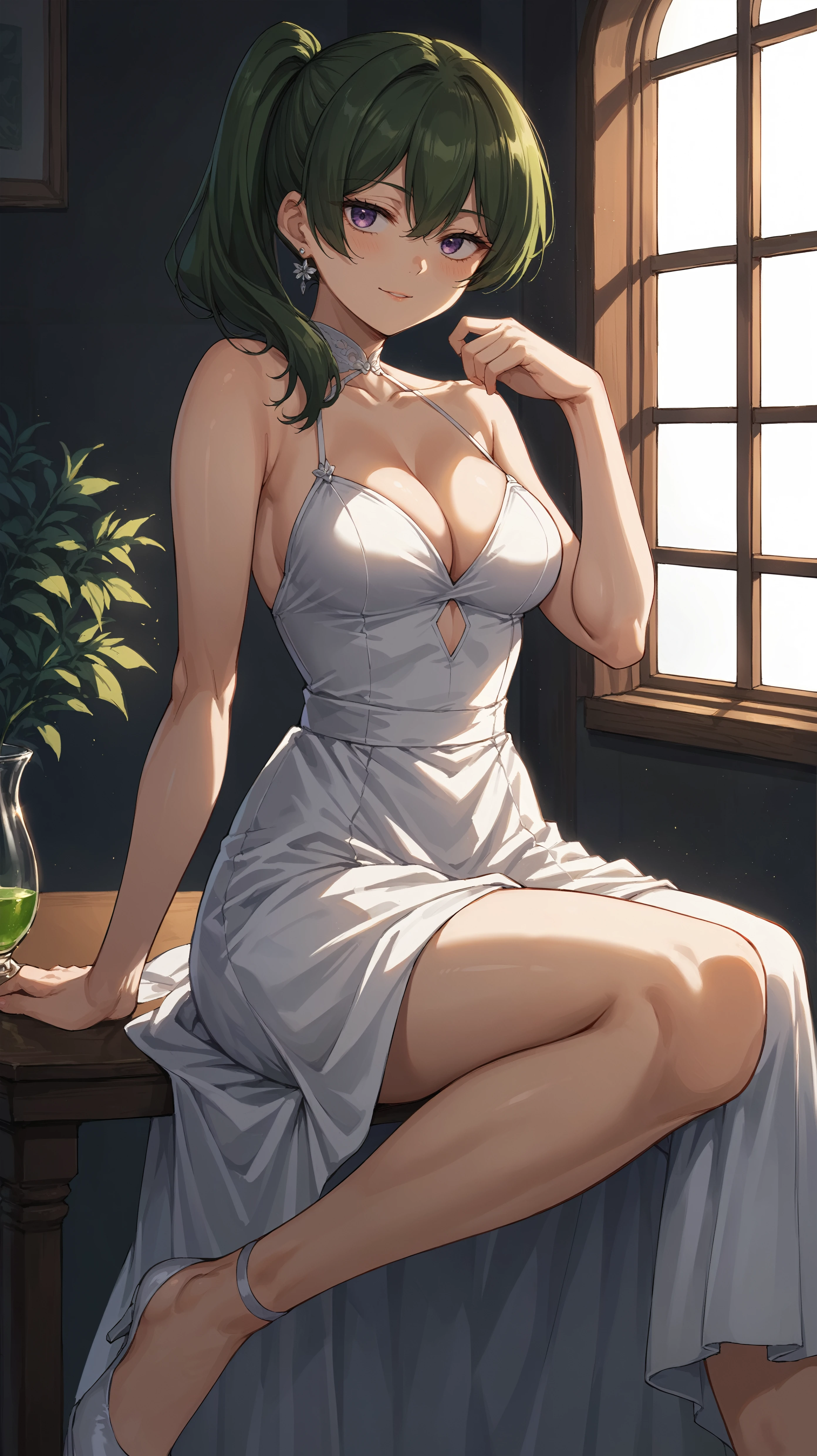 dark green hair, side ponytail, purple eyes, black dress, sleeveless, black choker, armlet, halter dress, short dress, belt, straps, black glove, single gloveDescription