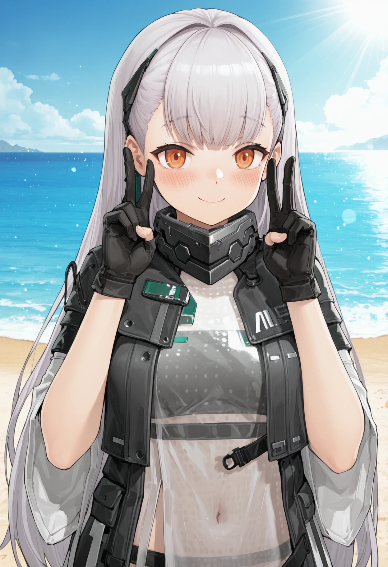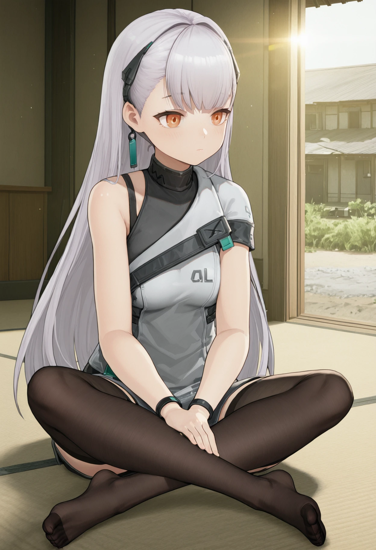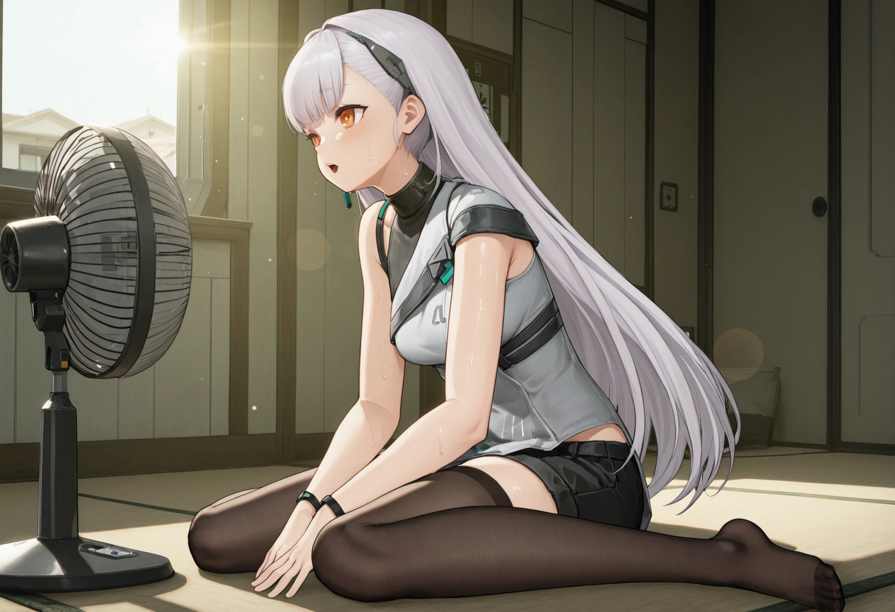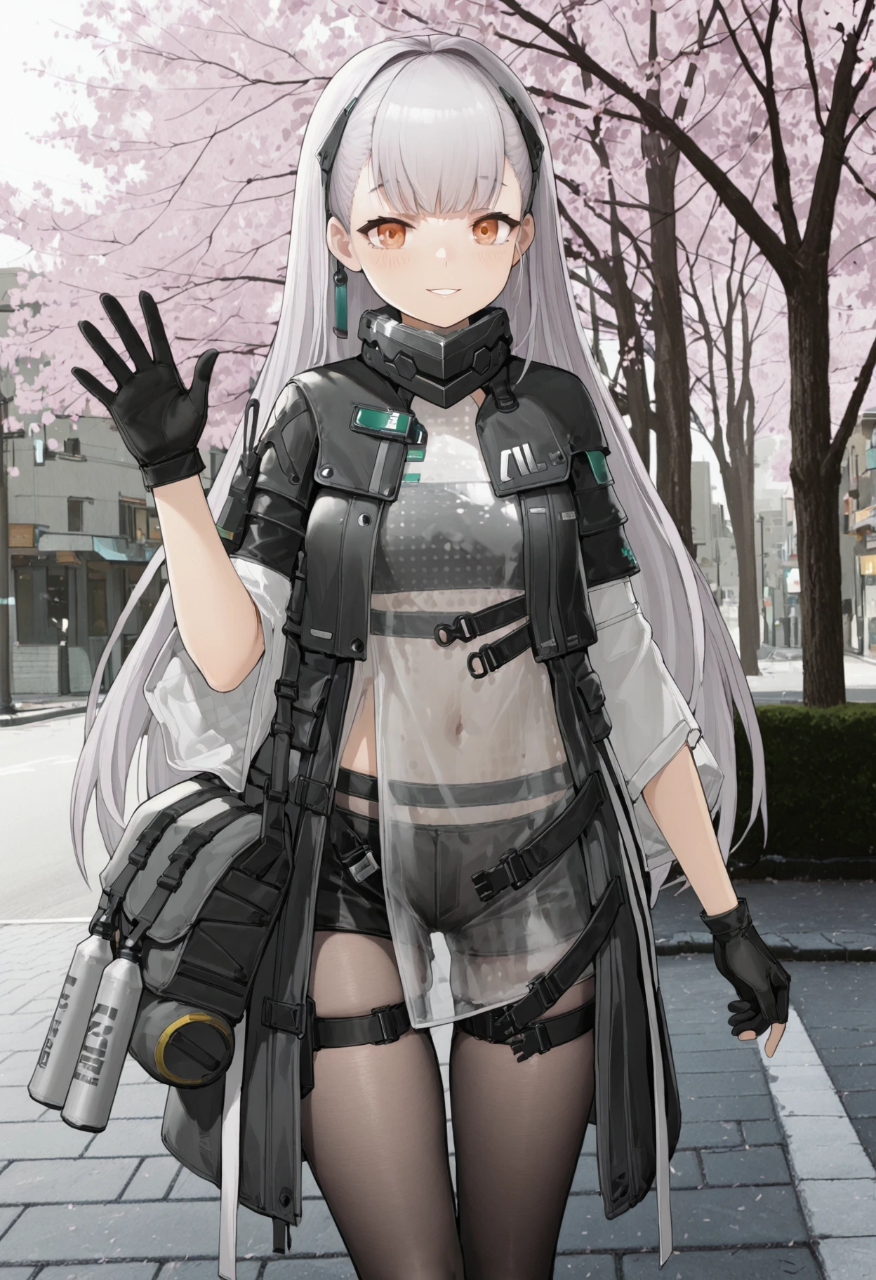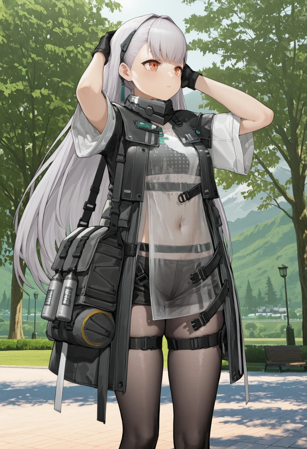 tlldef, headgear, medium breasts, long hair, white hair, orange eyes, white sleeves, black gloves, see-through clothes, black tube top, black shorts, black pantyhose, thigh strap, shoulder bag, Dormitory costume :