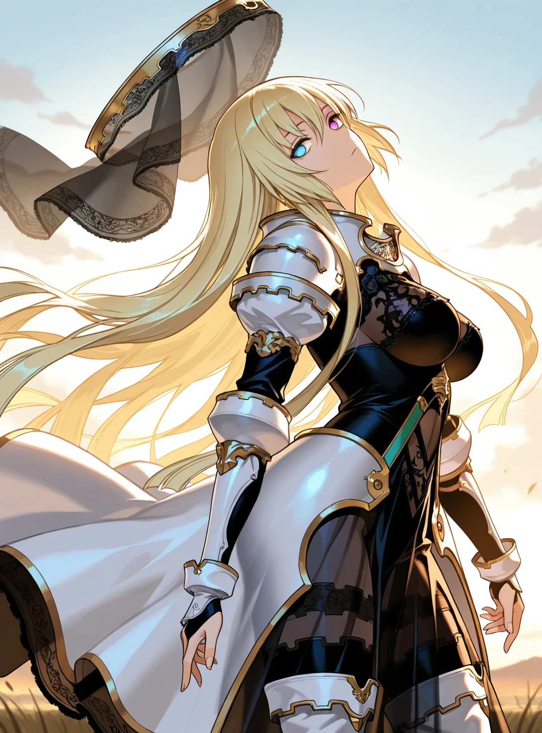 LaVaswald Kichikuou, long hair, heterochromia, veil halo, armor dress, gloves, see-through long skirt, thighhighs, high heel boots,