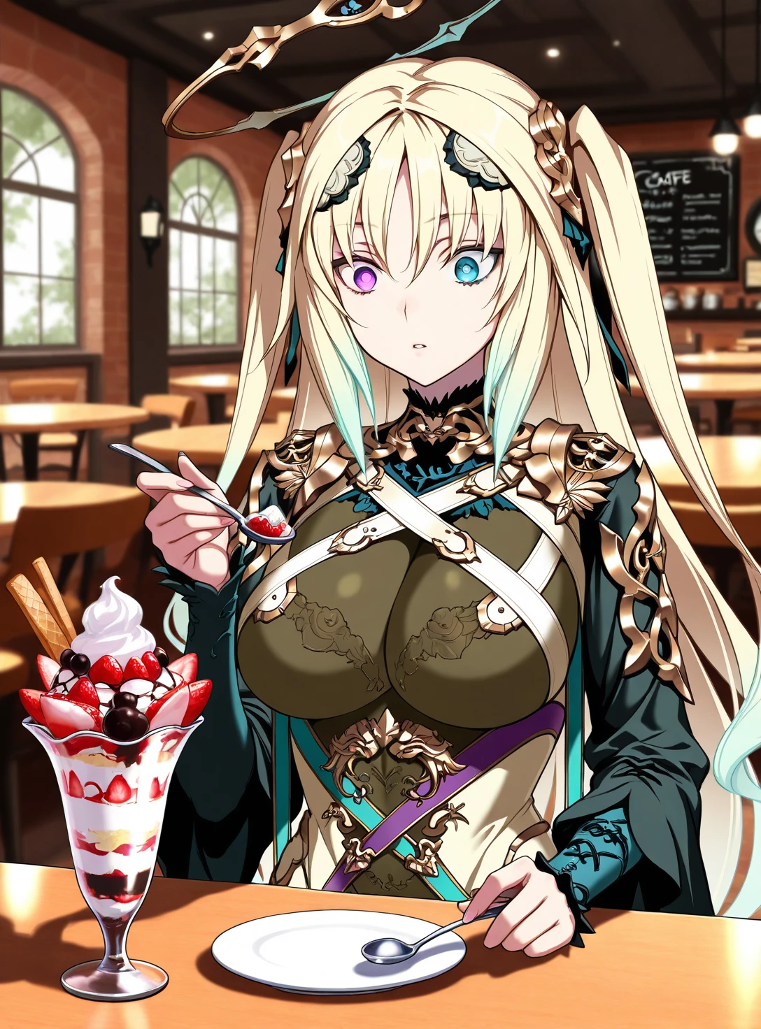 long hair, two side up, heterochromia, halo,服/衣服/Clothing: