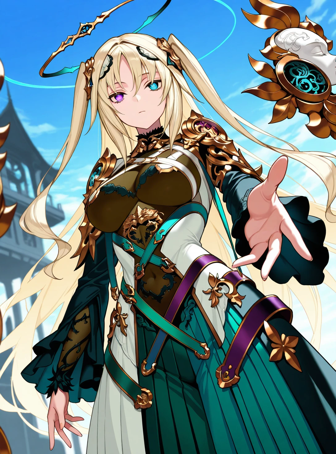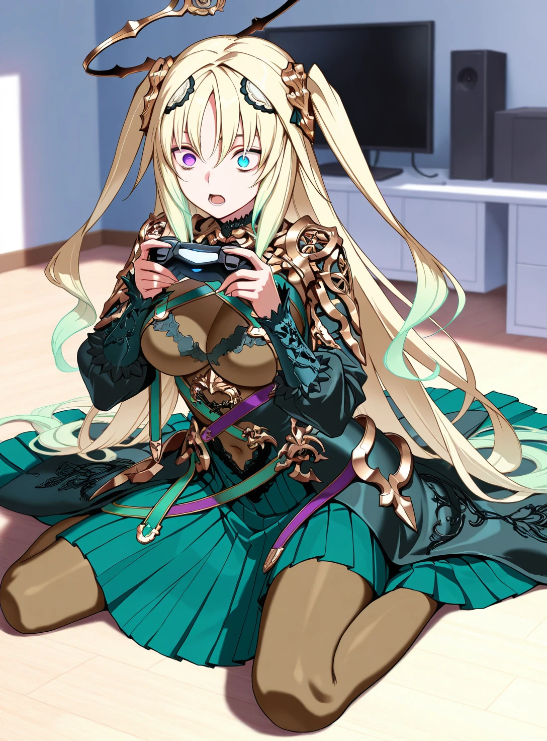 LaVaswald X, long hair, two side up, heterochromia, halo, bodystocking, long dress, floating pauldrons, black sleeves, pleated inner long skirt,green inner skirt,