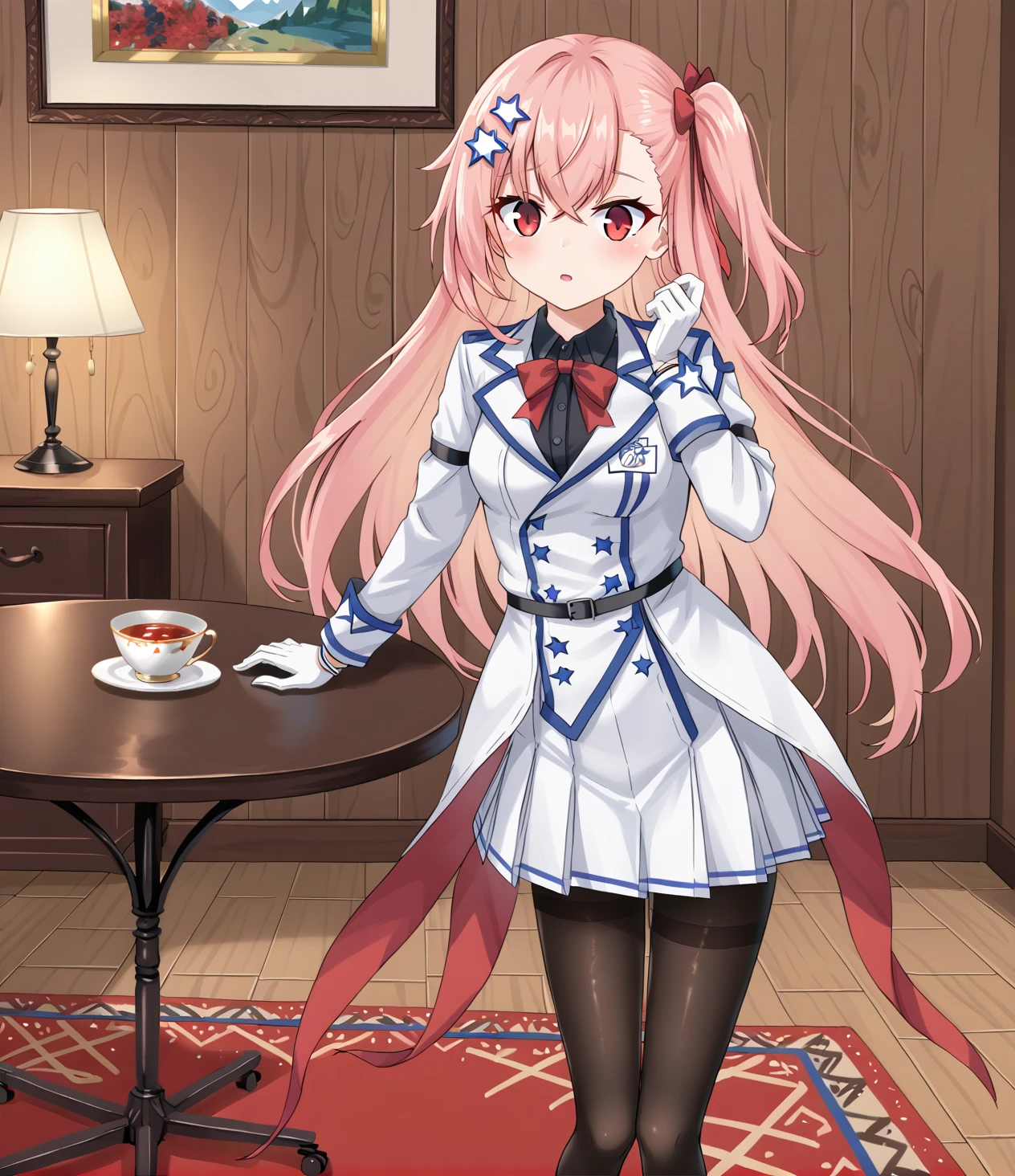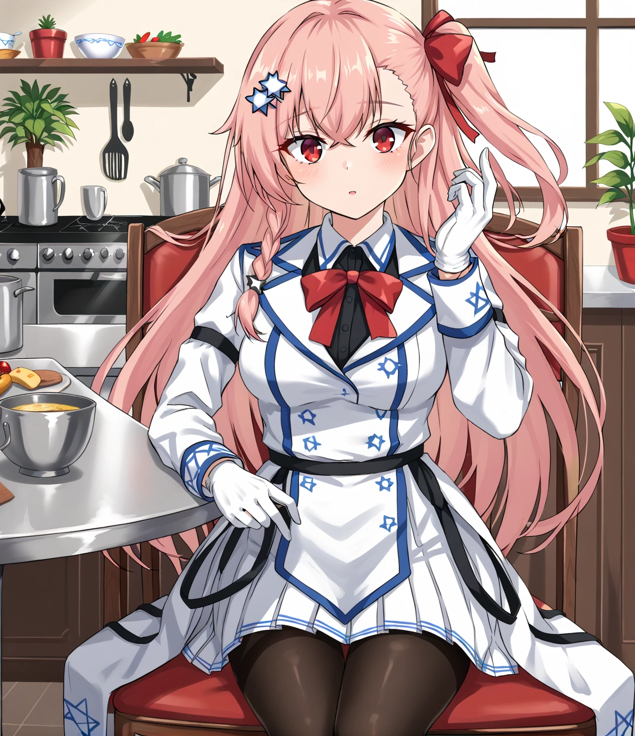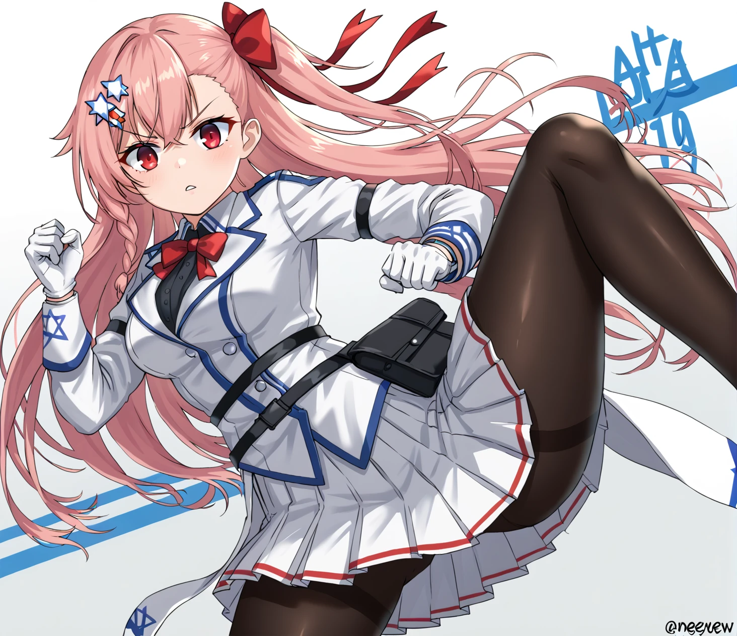 <lora:Negev_Girls_Frontline:1> negev, pink hair, red eyes, bangs, star of david hair accessories, white gloves, skirt, pantyhoseDescription